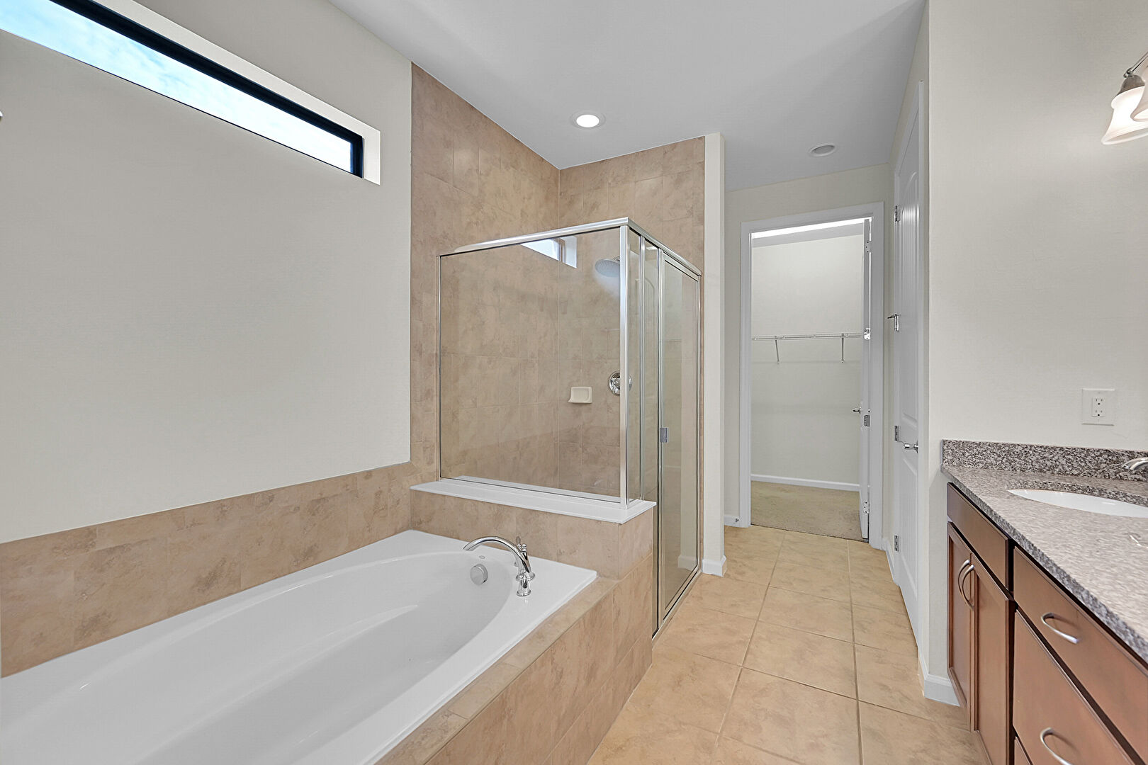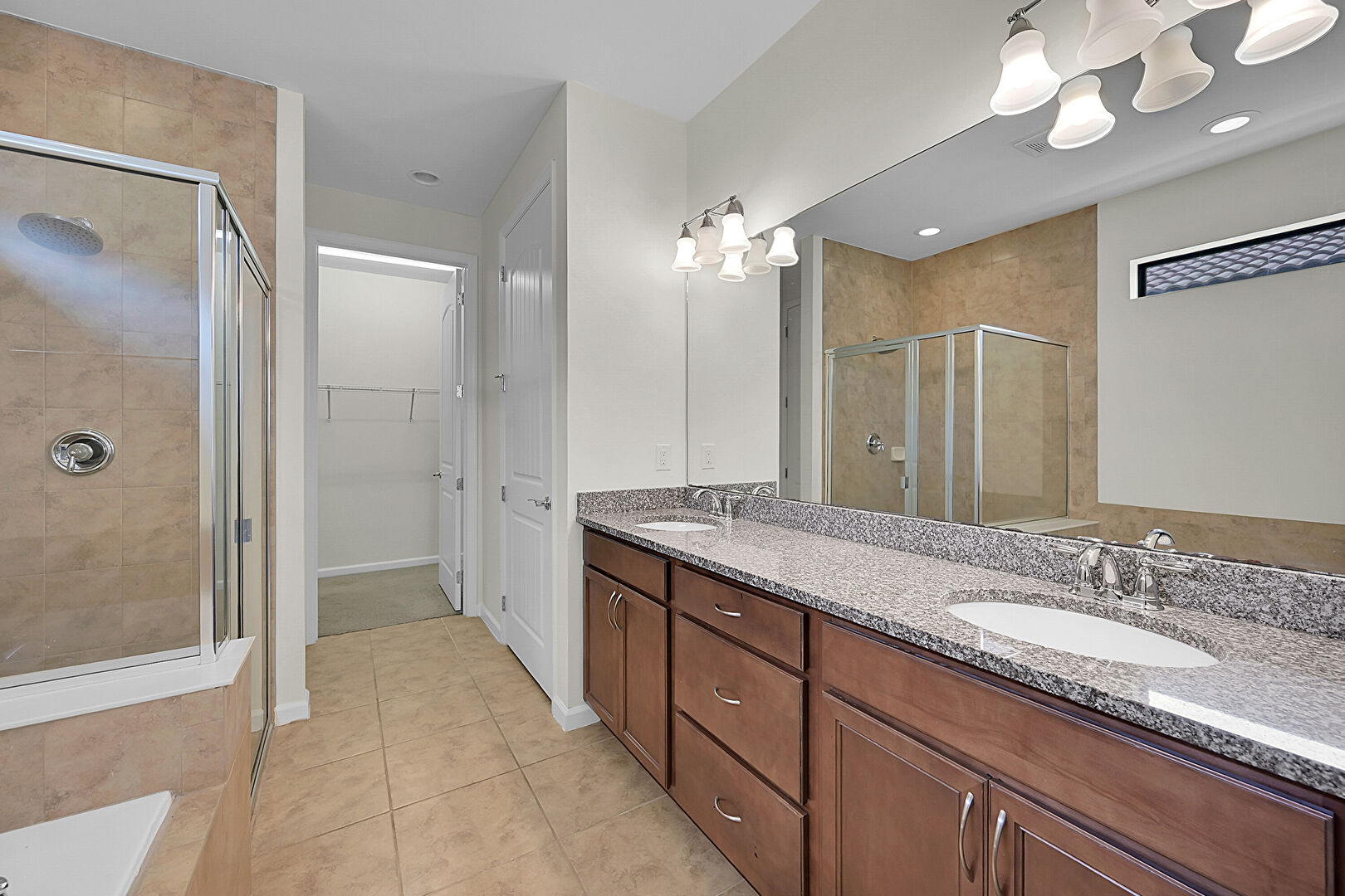 Baseboards Wall, Double Vanity, Drywall, Full Bathroom, Natural Light, Notable Chandelier, Recessed Lighting, Tile Floor, Vanity, Vent, Walk In Closet, Baseboards Wall, Ceiling Fan, Recessed Lighting
