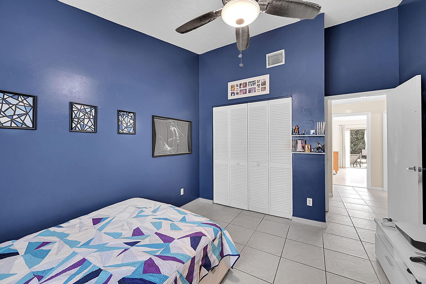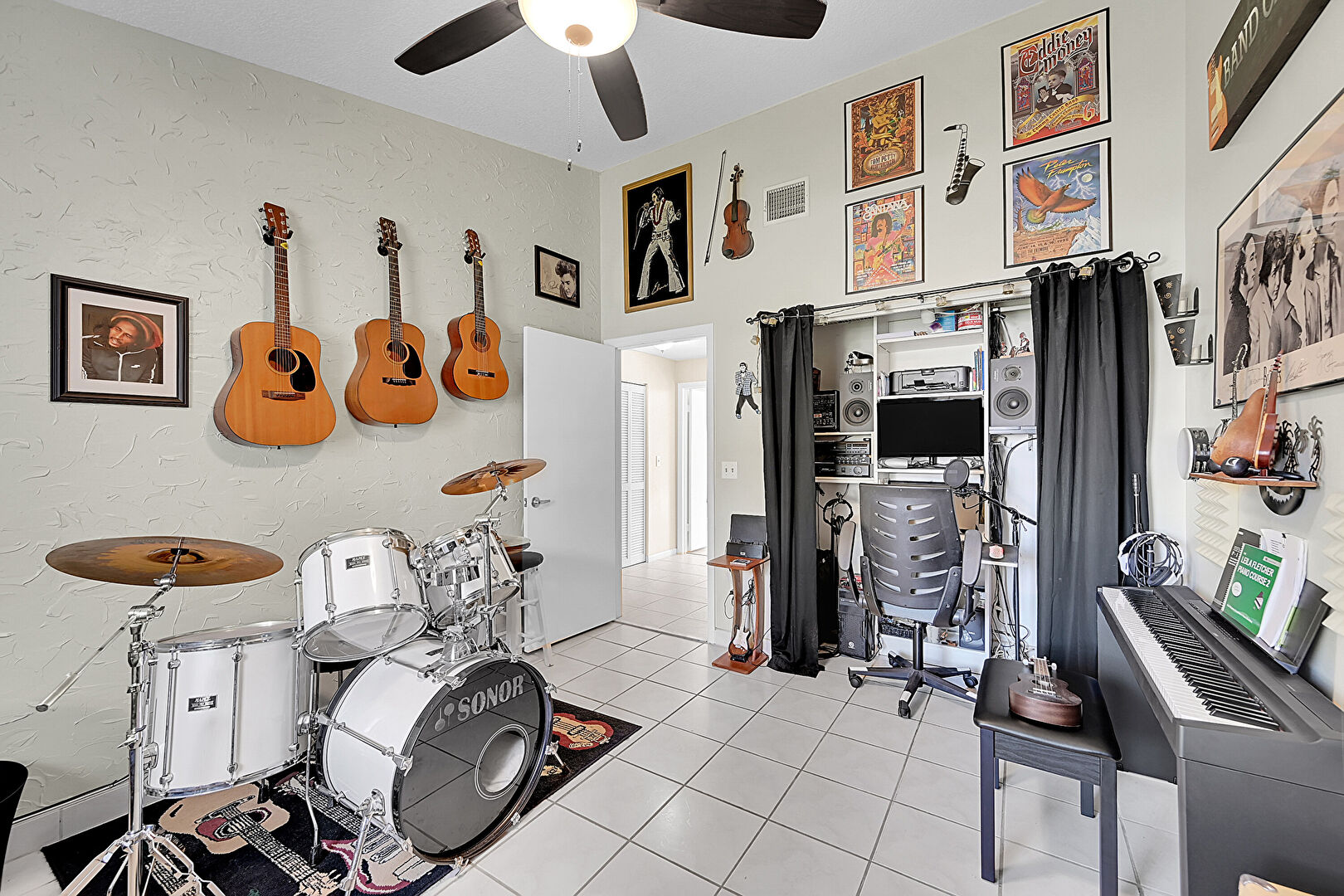Baseboards Wall, Ceiling Fan, Closet, Drywall, High Ceiling, Natural Light, Office Area, Textured Ceiling, Textured Wall, Tile Floor, Vent, Office Area, Vaulted Ceiling, Vent