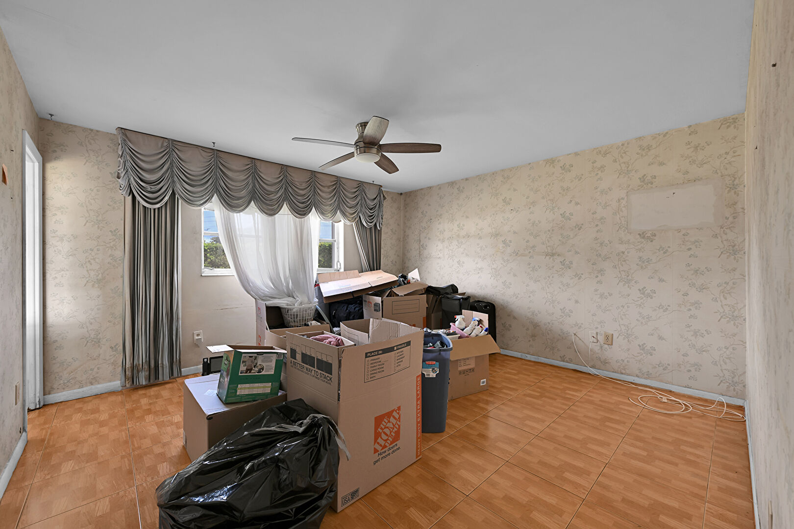 Baseboards Wall, Ceiling Fan, Natural Light, Tile Floor, Wallpaper Wall, Ceiling Fan, Vinyl Floor
