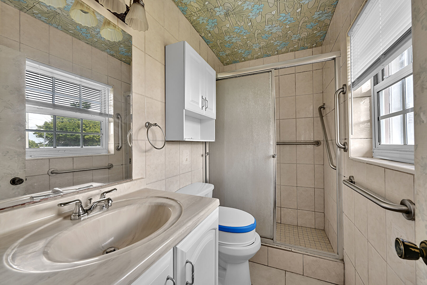 Full Bathroom, Natural Light, Tile Floor, Vanity, Tile Wall