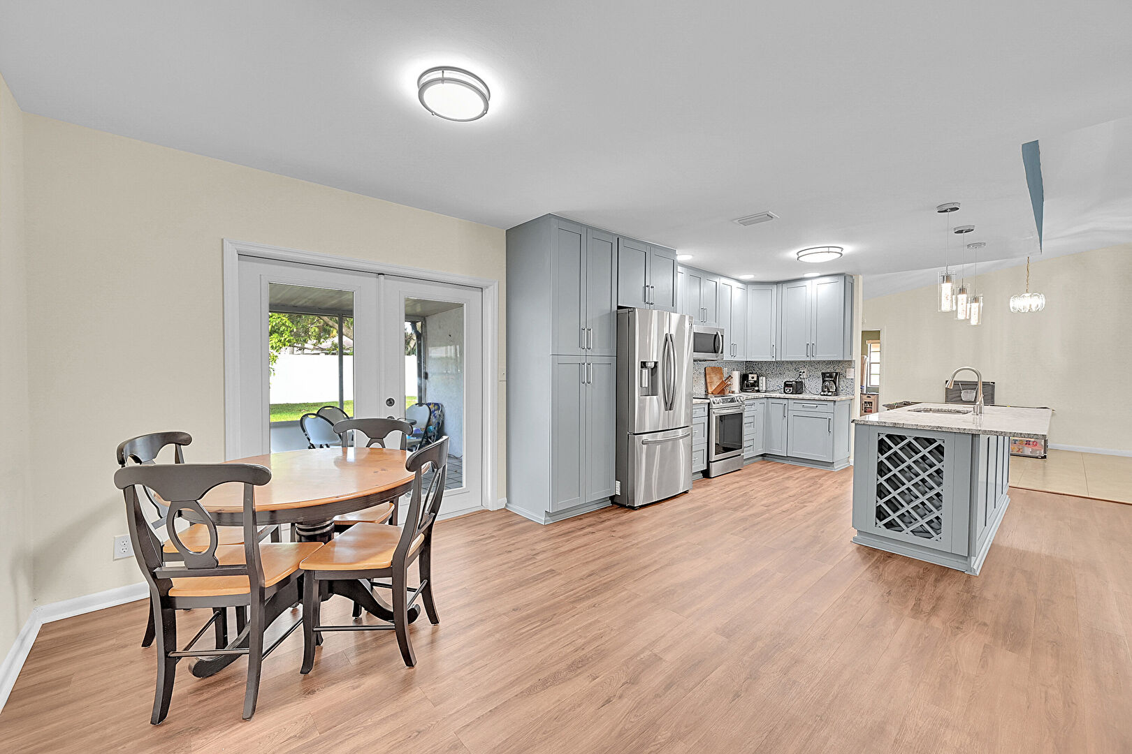 Drywall, French Doors, Gray Cabinets, Kitchen Bar, Kitchen Island, L Shaped Kitchen, Natural Light, Pendant Lighting, Shaker Cabinets, Stone Countertops, Wood Finish Floor, Baseboards Wall