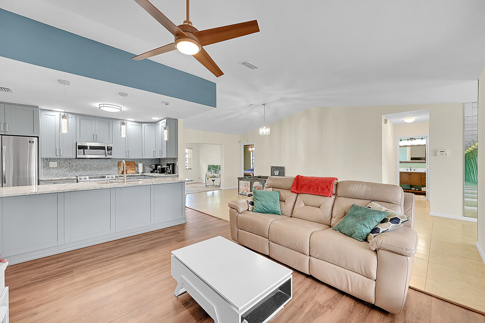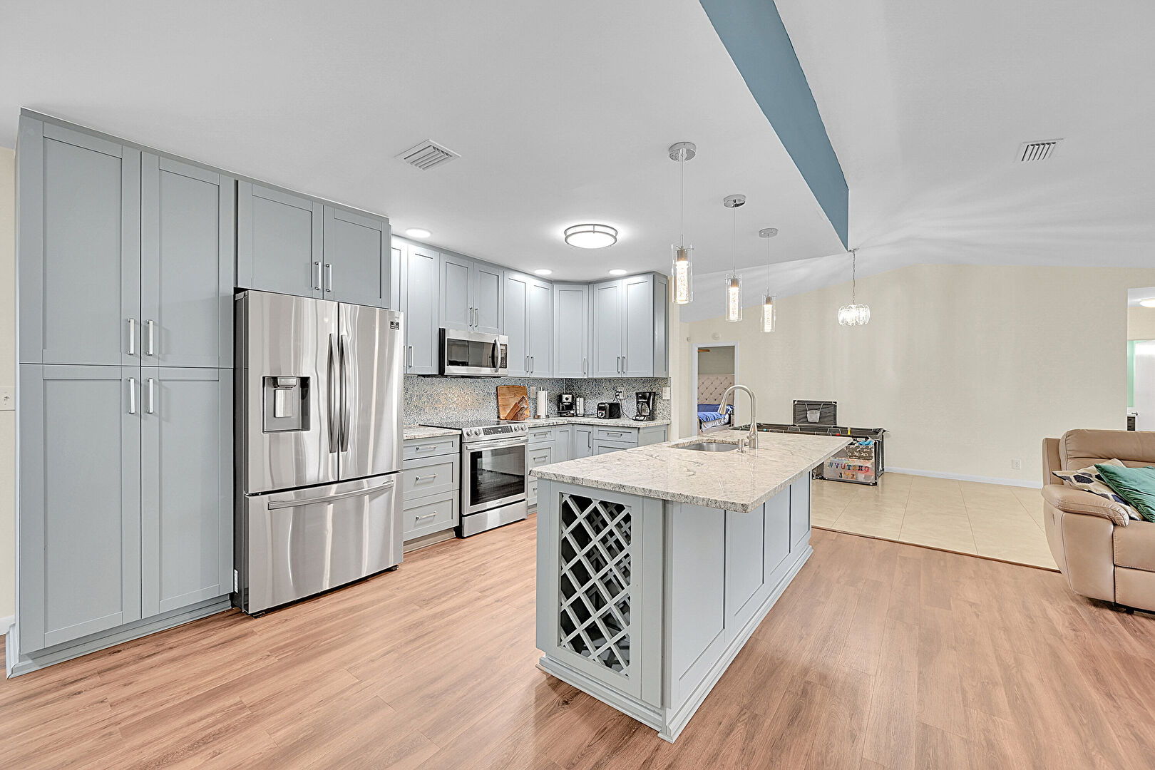 Baseboards Wall, Ceiling Fan, Drywall, Gray Cabinets, Kitchen Bar, Kitchen Island, L Shaped Kitchen, Natural Light, Notable Chandelier, Opens To Living Area, Pendant Lighting, Recessed Lighting, Shaker Cabinets, Stone Countertops, Vaulted Ceiling, Vent, Wood Finish Floor, Kitchen Bar, Pendant Lighting, Stone Countertops