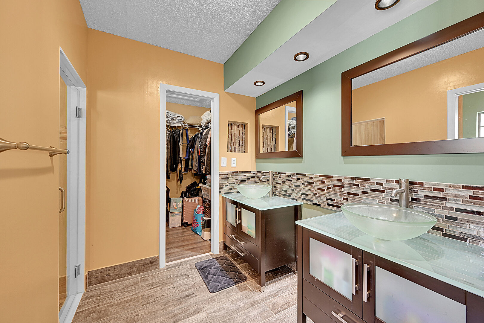 Baseboards Wall, Ceiling Fan, Drywall, Ensuite Bathroom, Full Bathroom, Natural Light, Recessed Lighting, Textured Ceiling, Vanity, Vent, Walk In Closet, Wood Finish Floor, Textured Ceiling, Two Single Vanities