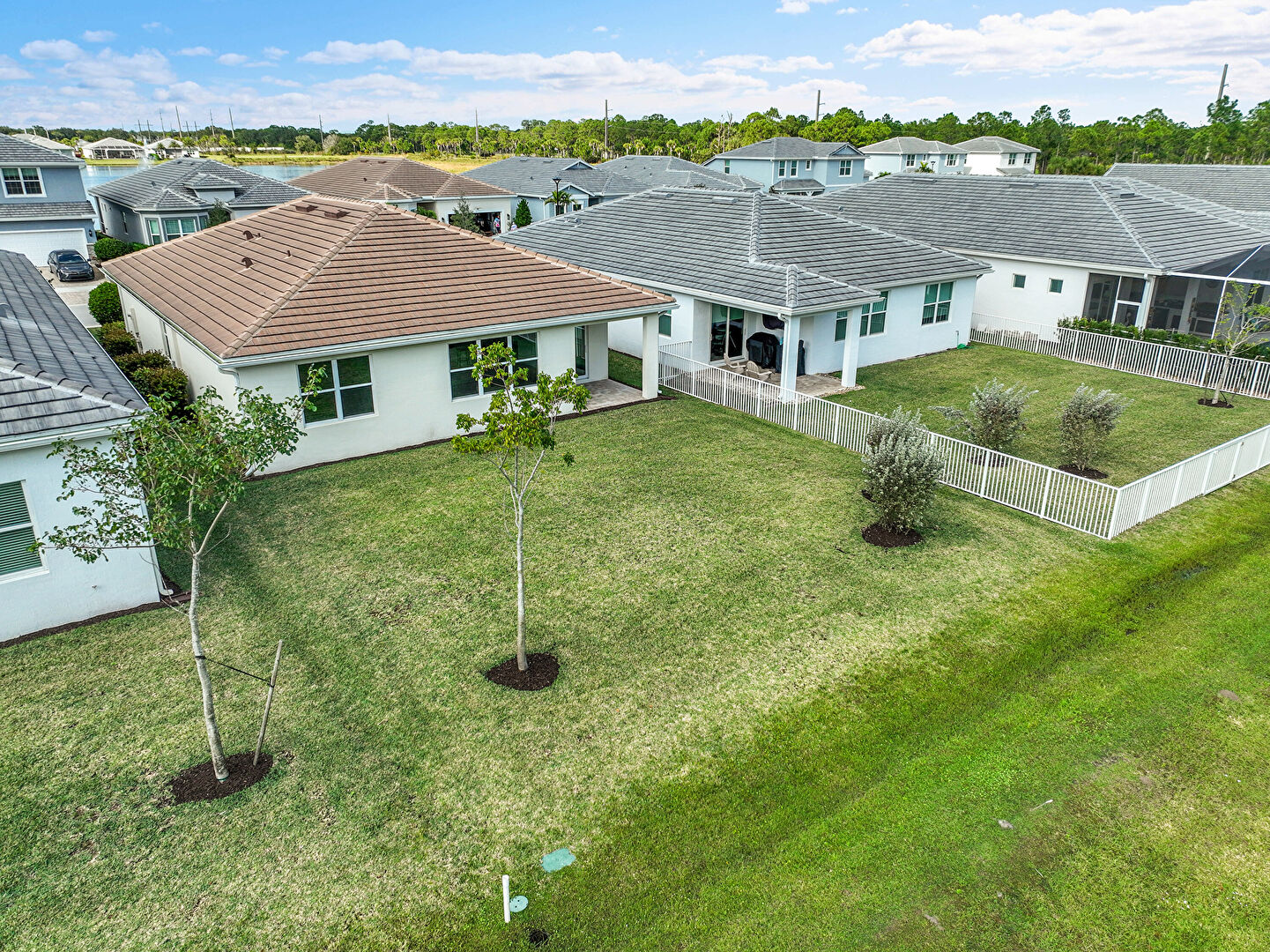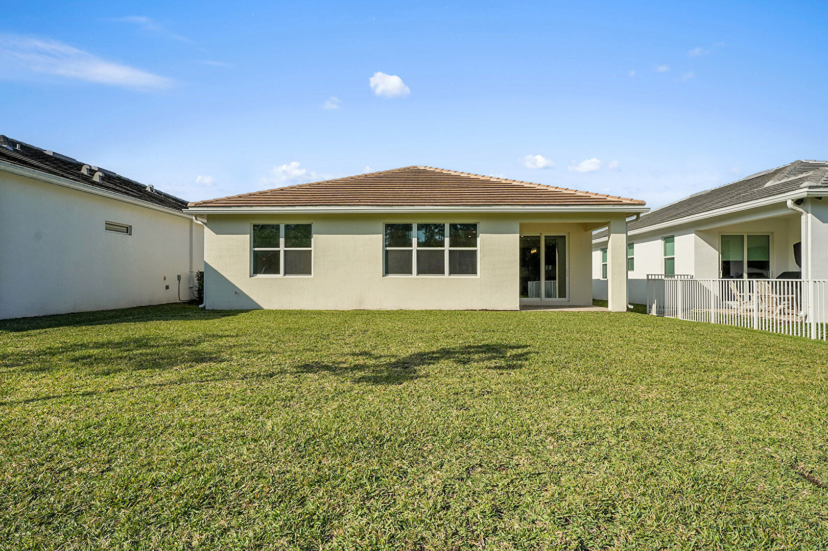Downspout, Fence, Gutters, Lawn, Patio, Stucco Siding, Tile Roof, Lawn, Residential View