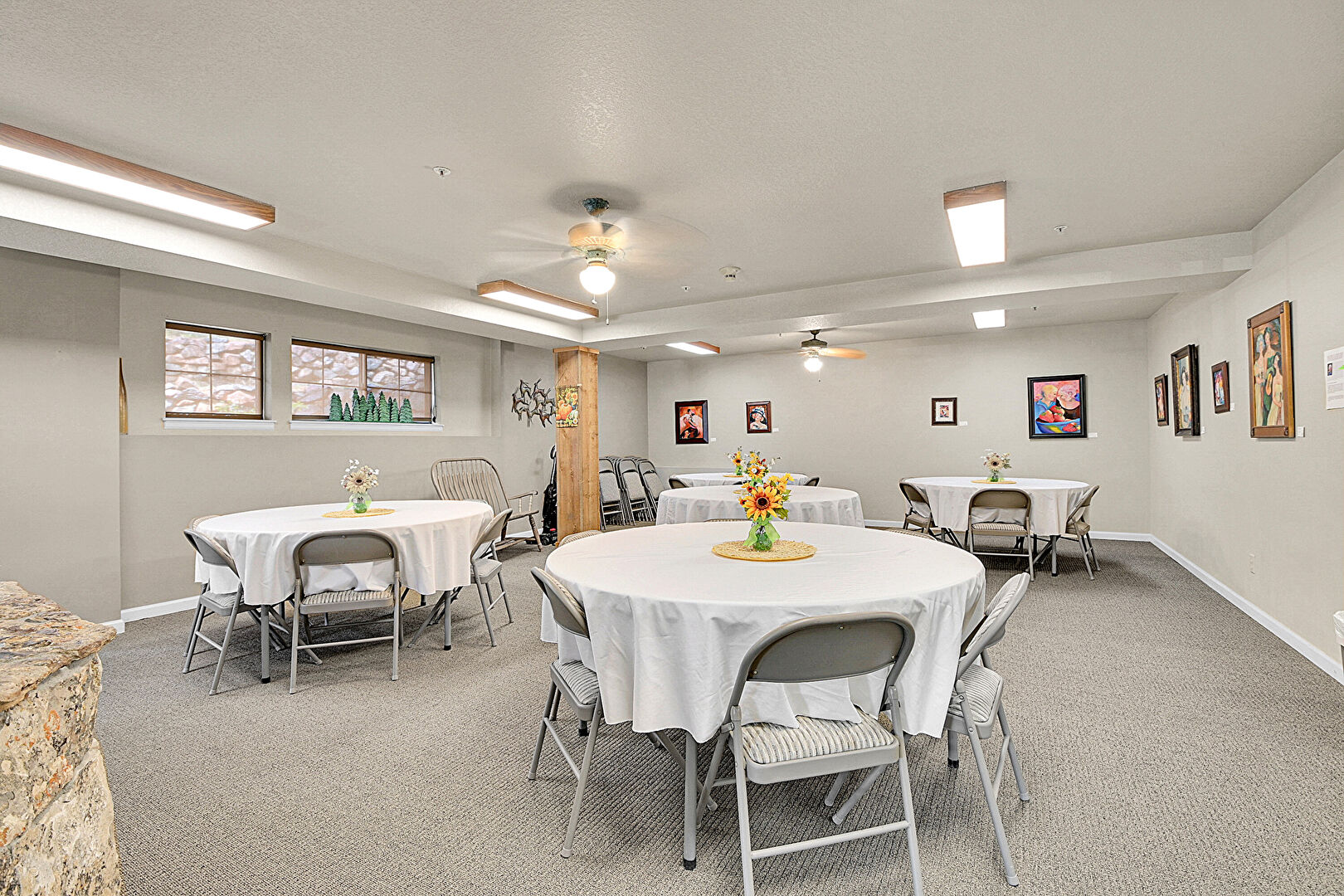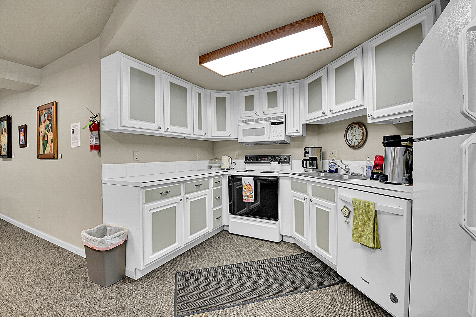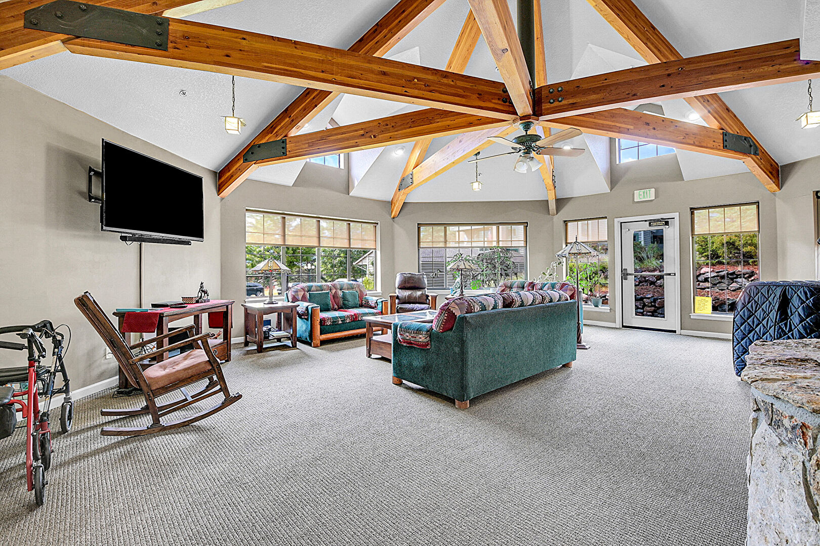 Baseboards Wall, Beamed Ceiling, Carpet, Ceiling Fan, Drywall, Fire Extinguisher, High Ceiling, Natural Light, Shaker Cabinets, Vaulted Ceiling, Cathedral Ceiling, Glass Insert Cabinets, Textured Ceiling