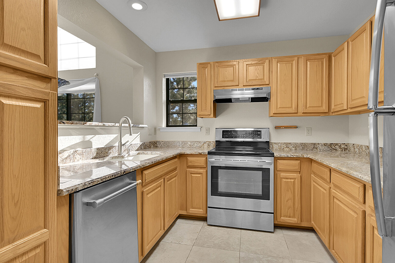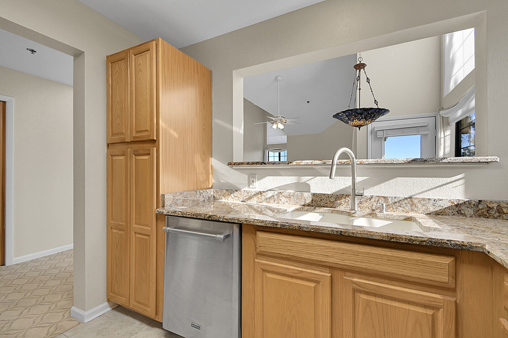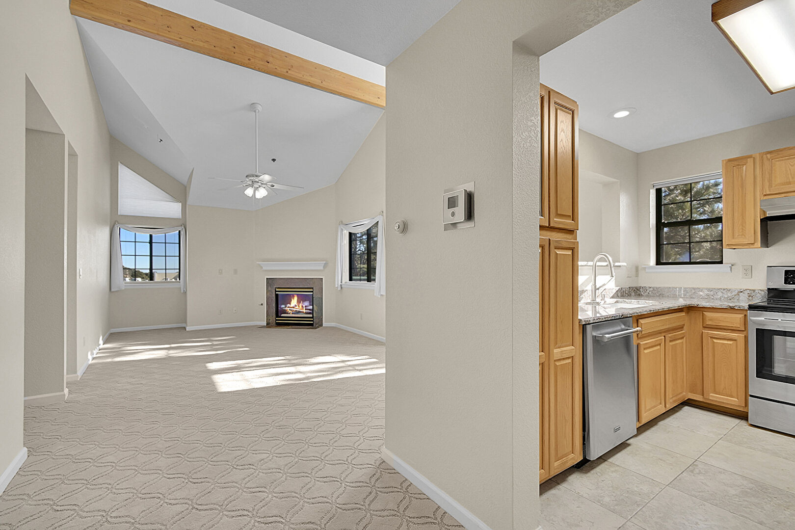 Baseboards Wall, Beamed Ceiling, Carpet, Ceiling Fan, Drywall, High Ceiling, Natural Light, Opens To Living Area, Pass Through Window, Raised Cabinets, Recessed Lighting, Stone Countertops, Tile Floor, Vaulted Ceiling, Baseboards Wall, Fireplace, Natural Light, Tile Floor, Vinyl Floor