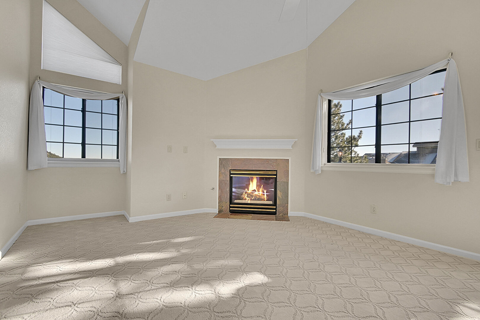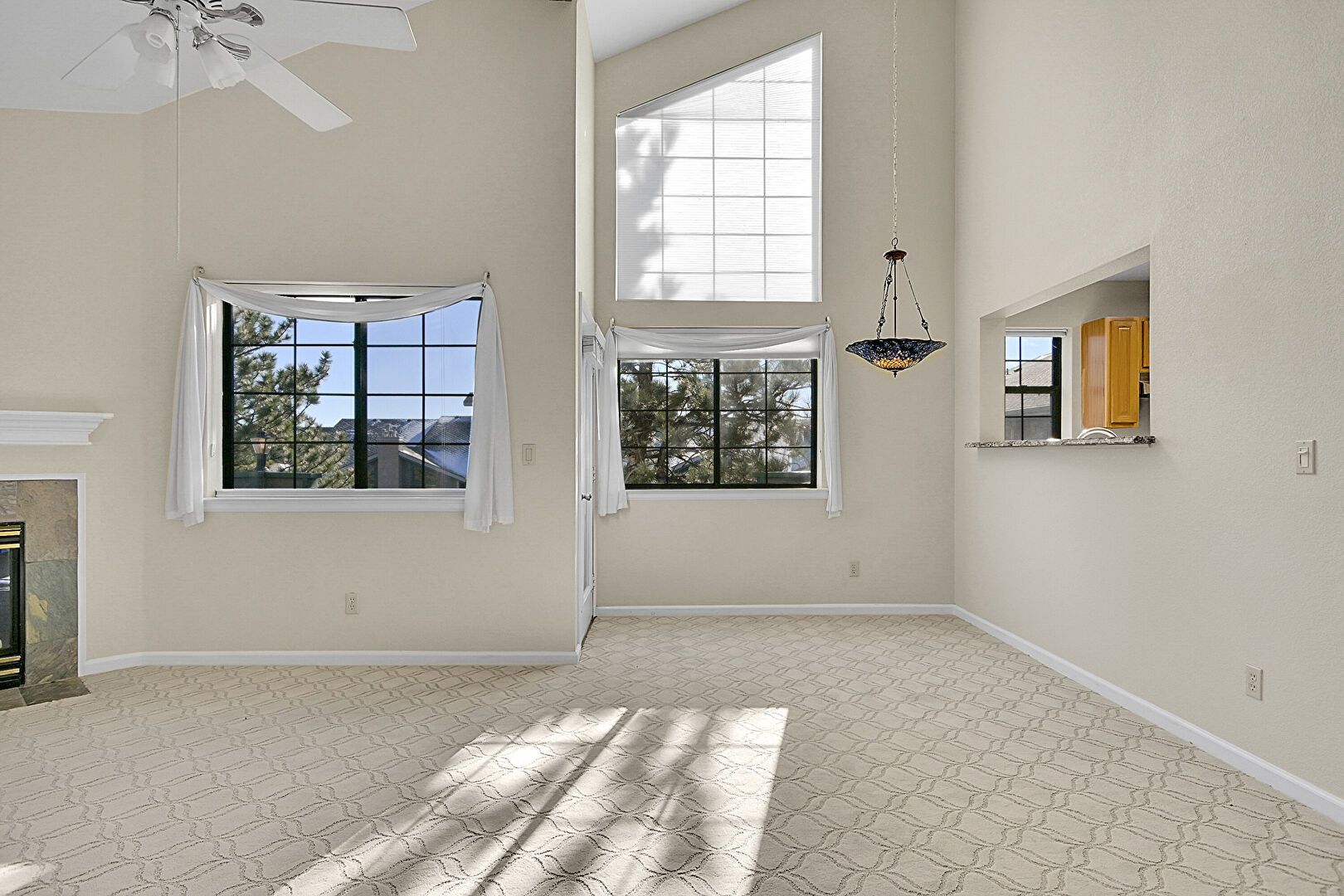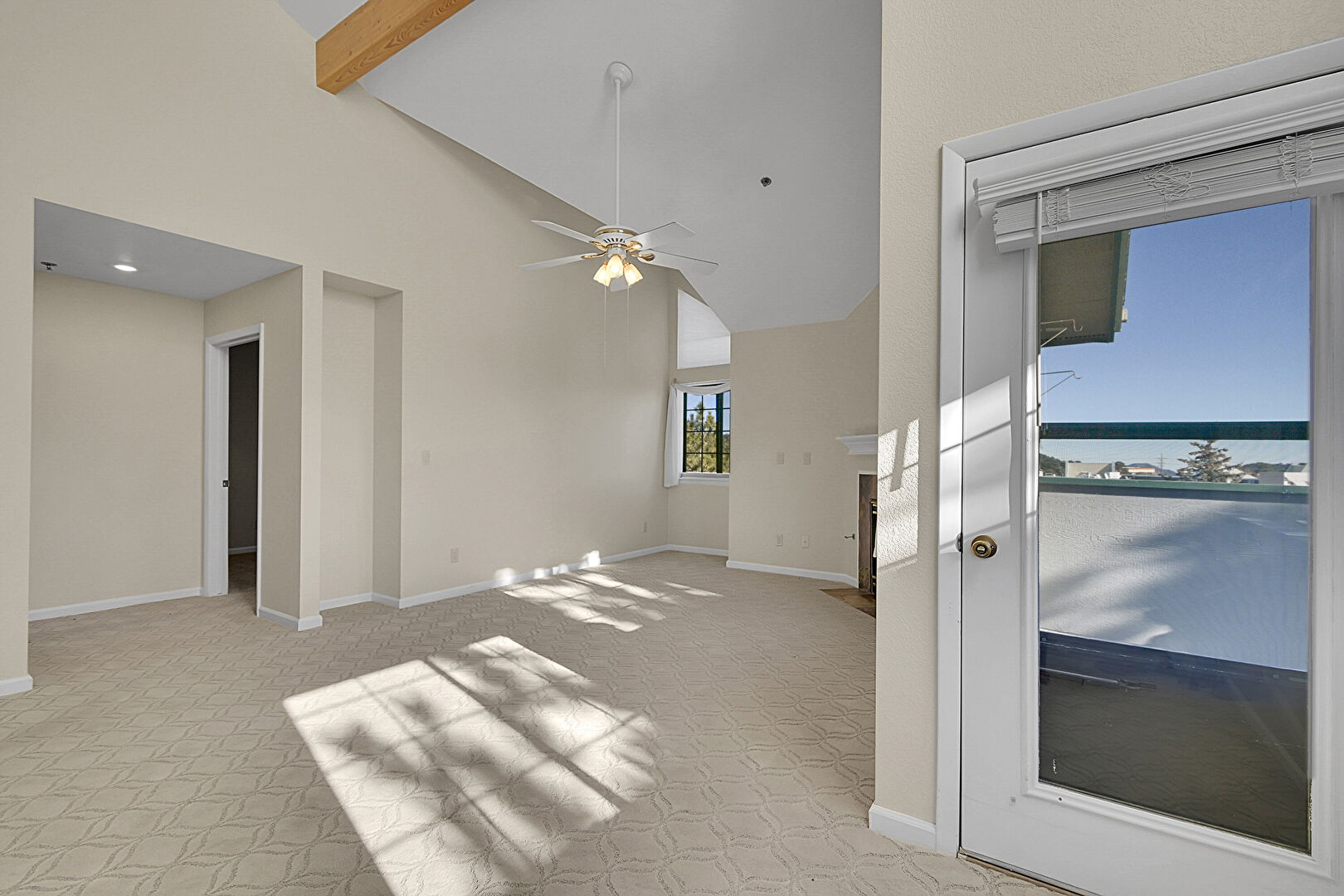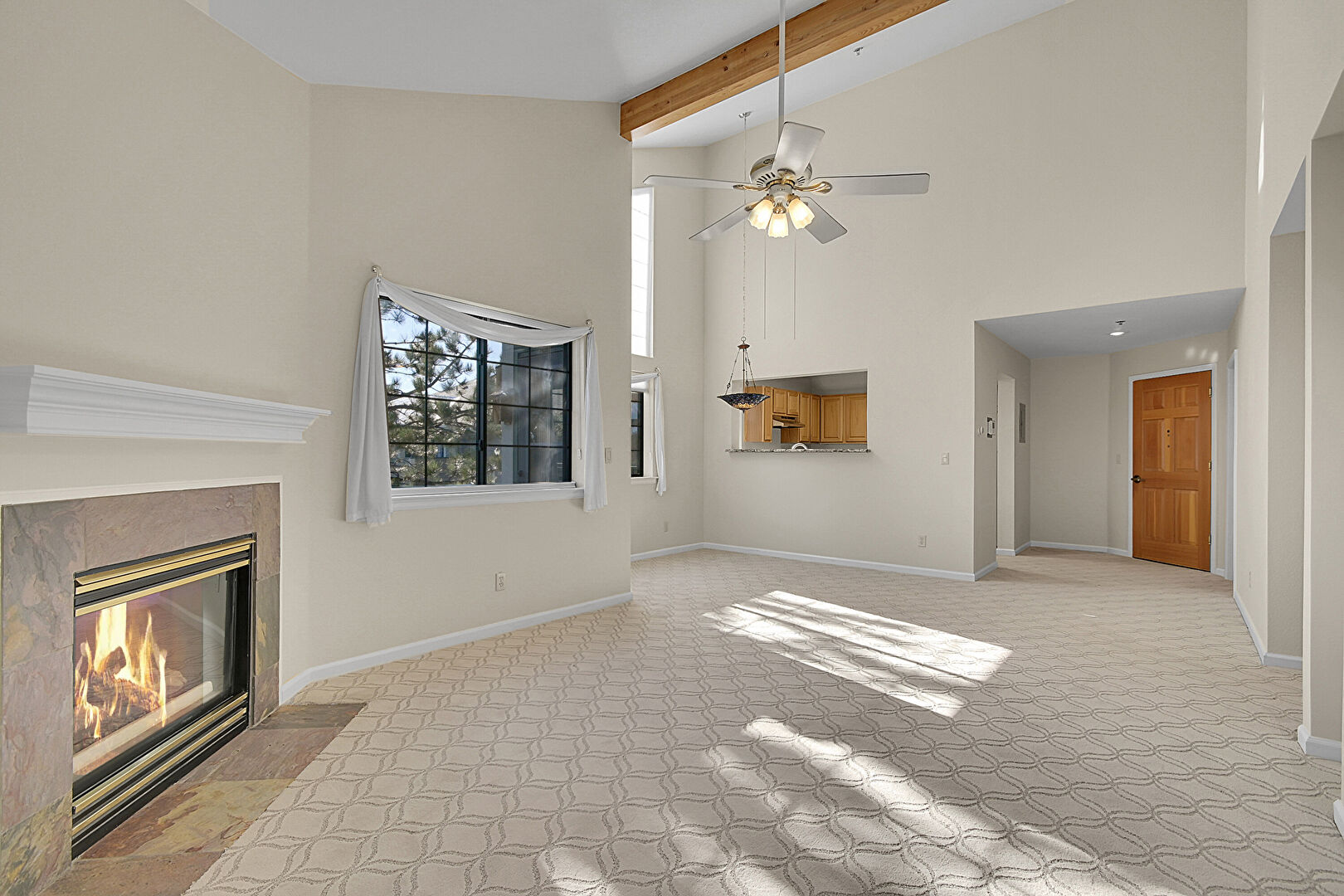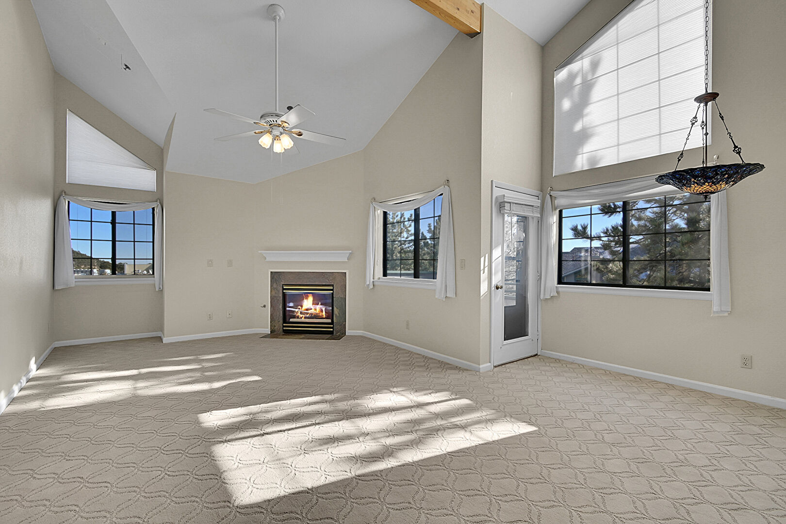 Baseboards Wall, Beamed Ceiling, Carpet, Ceiling Fan, Drywall, Fireplace, High Ceiling, Natural Light, Vaulted Ceiling, Baseboards Wall, Beamed Ceiling, Carpet, Fireplace