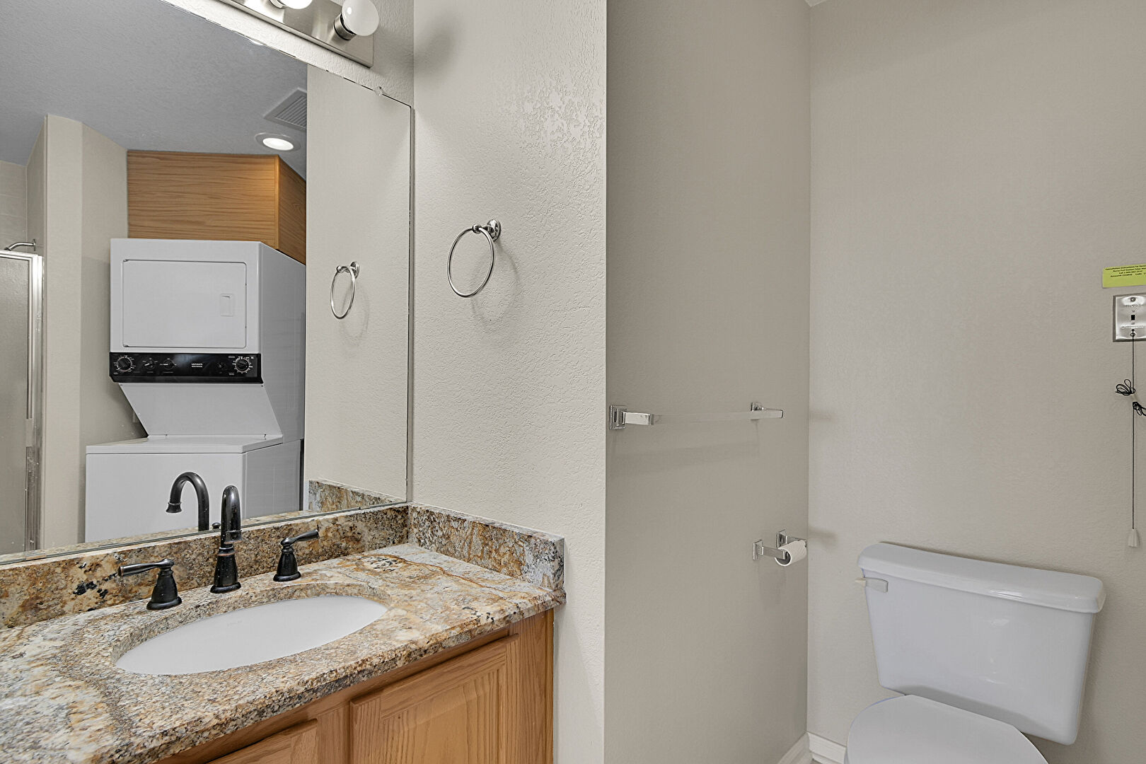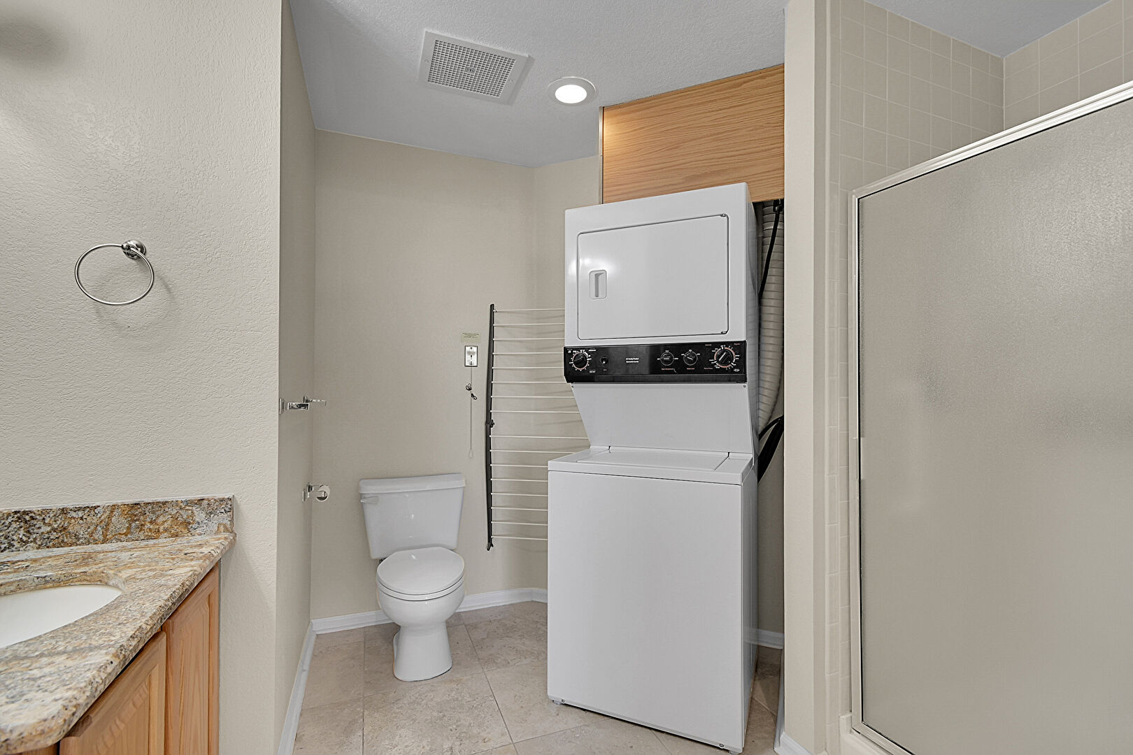Baseboards Wall, Full Bathroom, Laundry, Recessed Lighting, Textured Wall, Vanity, Vent, Laundry, Tile Floor