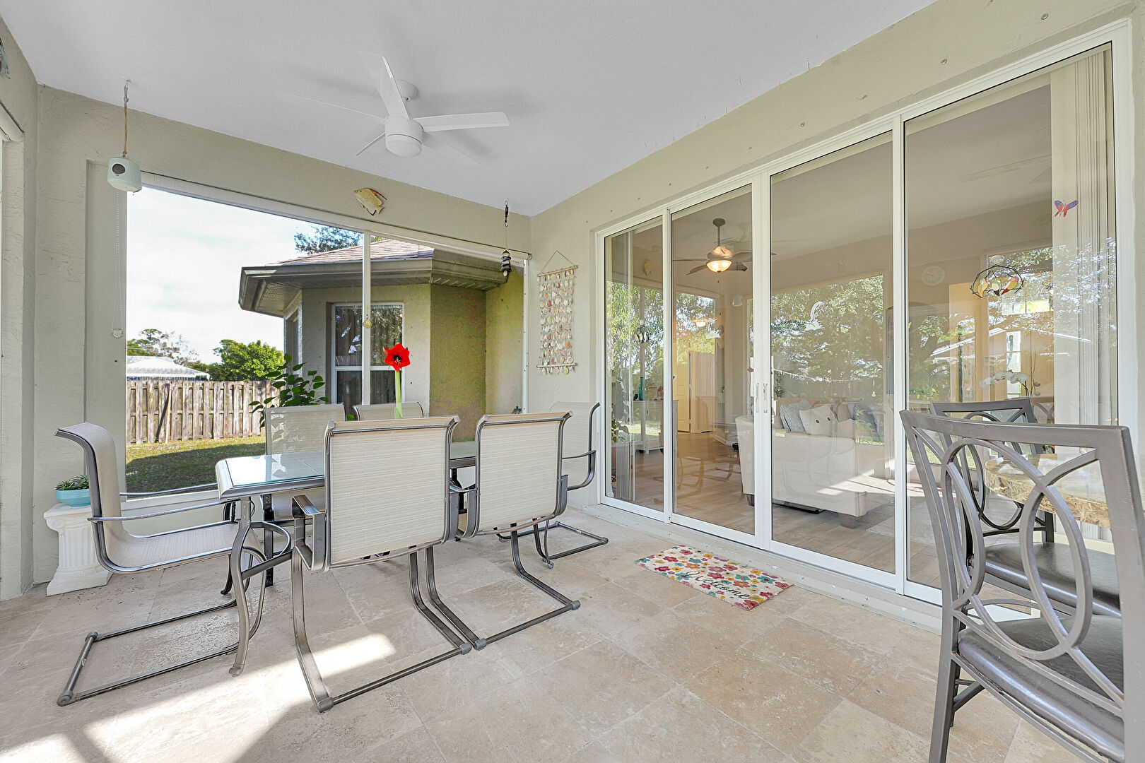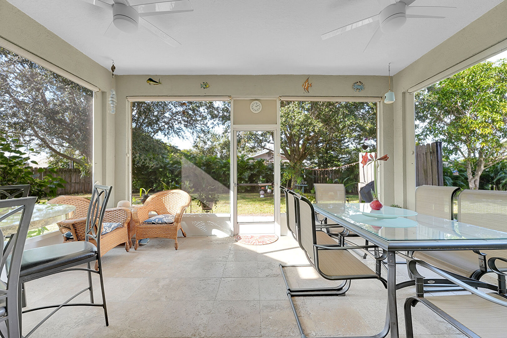 Ceiling Fan, Natural Light, Outdoor Dining Area, Security Camera, Stone Finish Floor, Sunroom, Drywall, Patio