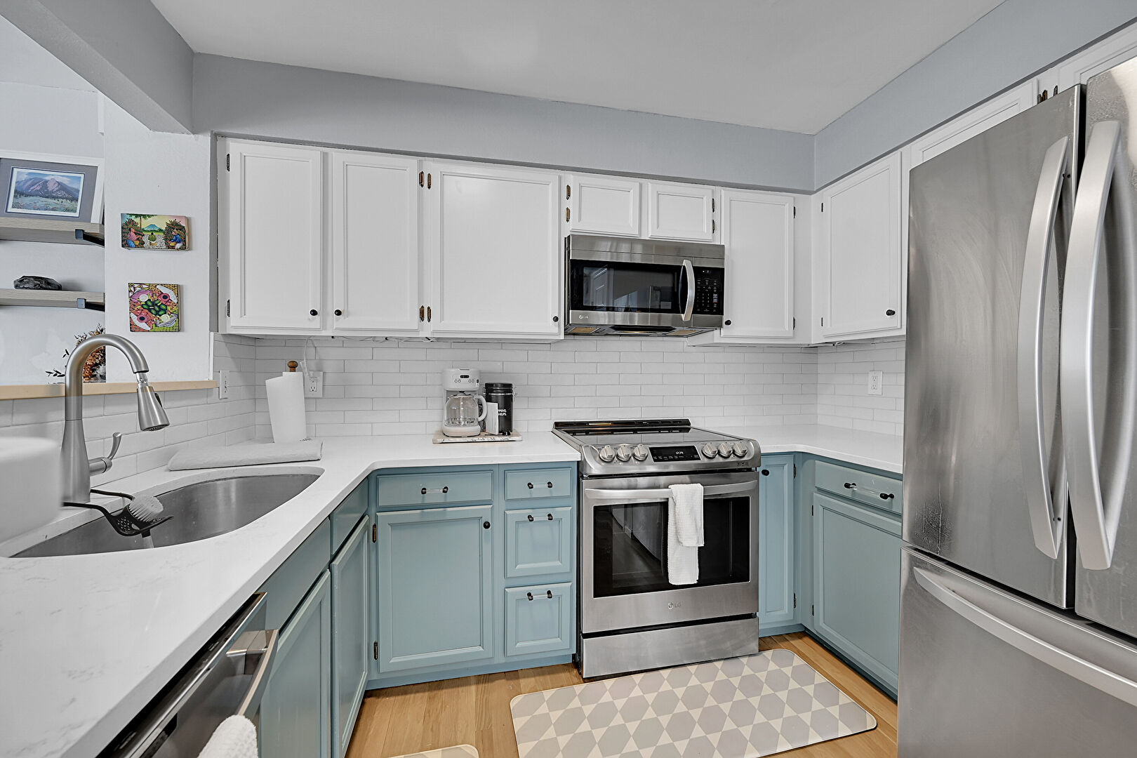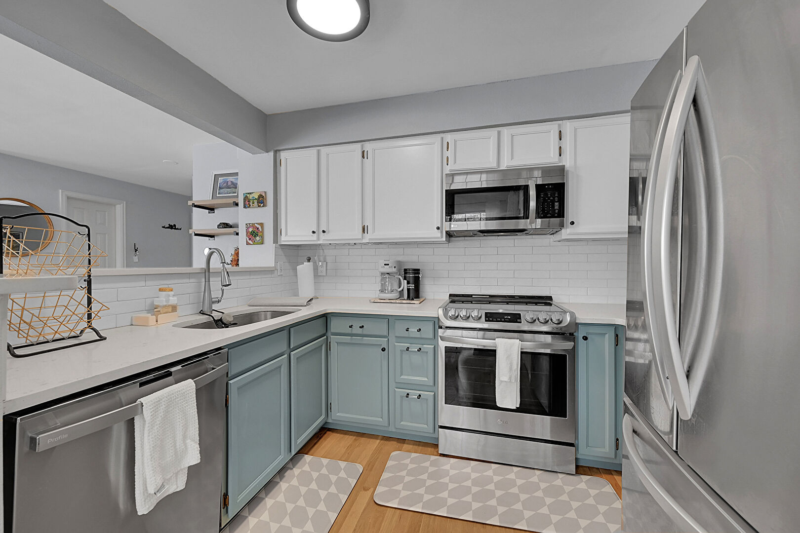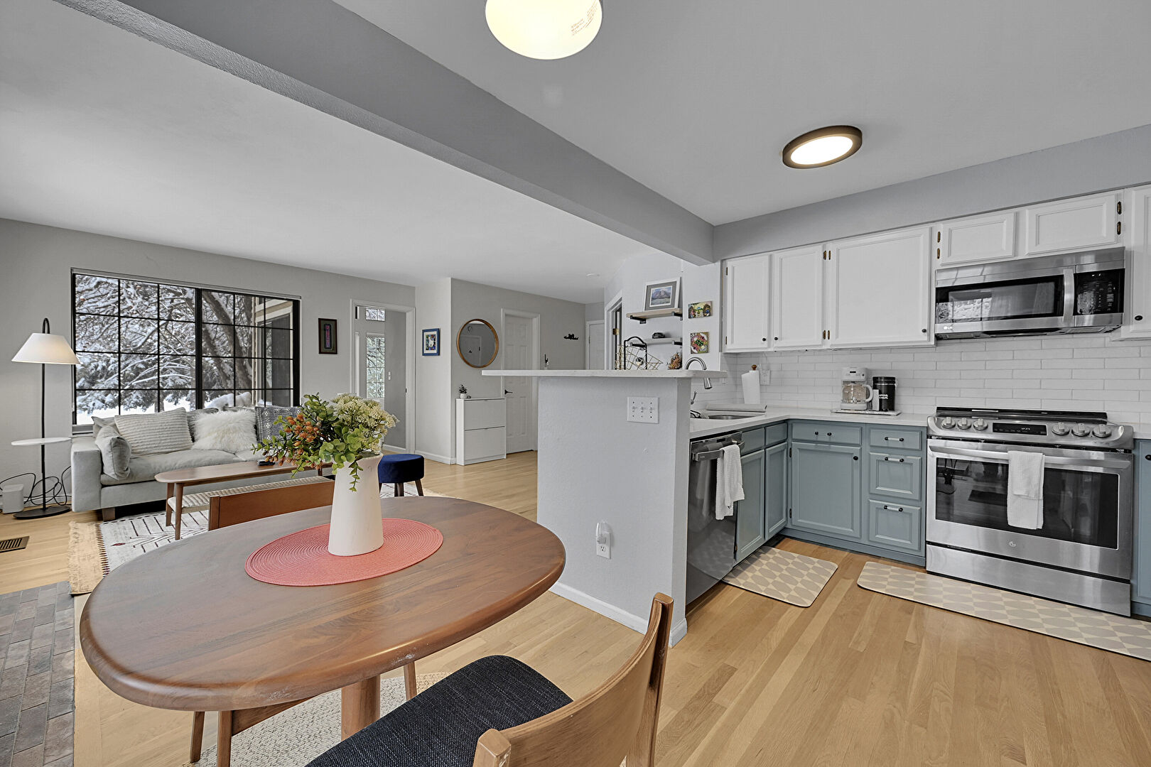 Baseboards Wall, Beamed Ceiling, Blue Cabinets, Drywall, Gray Cabinets, Kitchen Peninsula, Laundry, Natural Light, Open Shelves, Opens To Living Area, Pendant Lighting, Shaker Cabinets, Stone Countertops, U Shaped Kitchen, Vent, Visible Hinge Cabinets, Wood Finish Floor, Drywall, Natural Light, Pendant Lighting, U Shaped Kitchen, Visible Hinge Cabinets