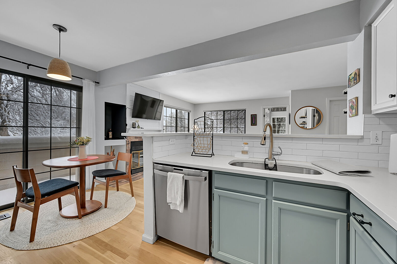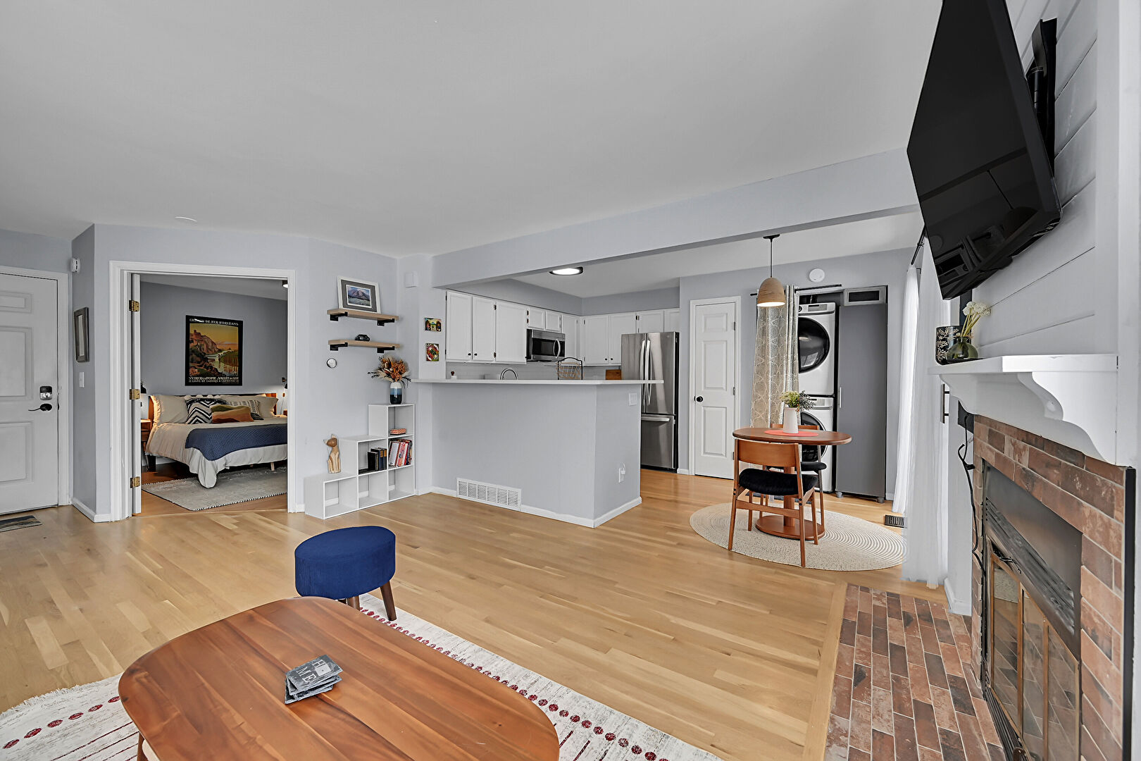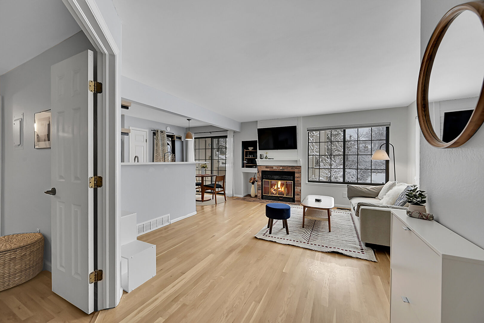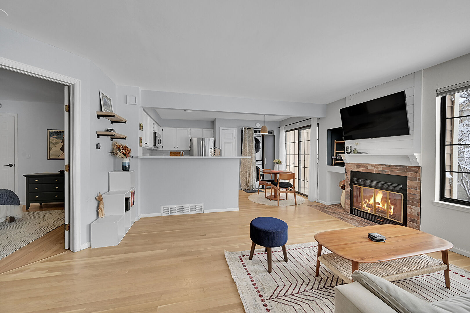 Baseboards Wall, Drywall, Fireplace, Laundry, Natural Light, U Shaped Kitchen, Vent, Wood Finish Floor, Baseboards Wall, Fireplace, U Shaped Kitchen, Vent