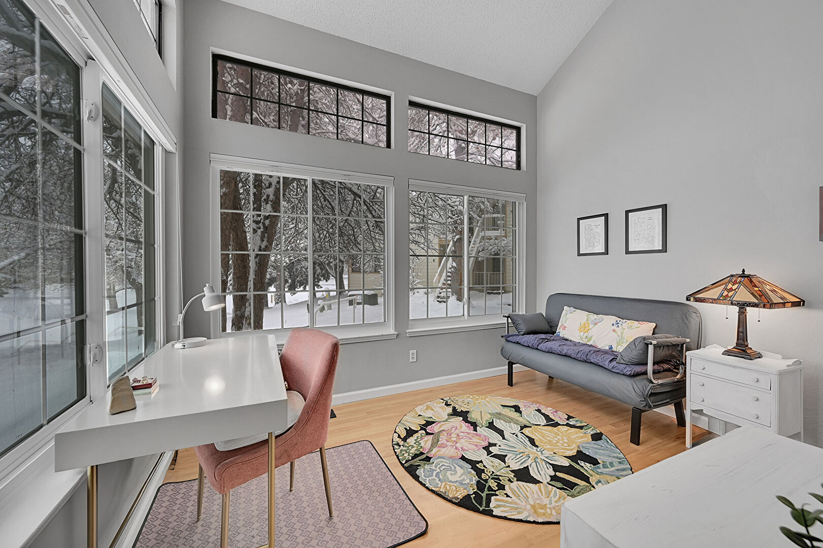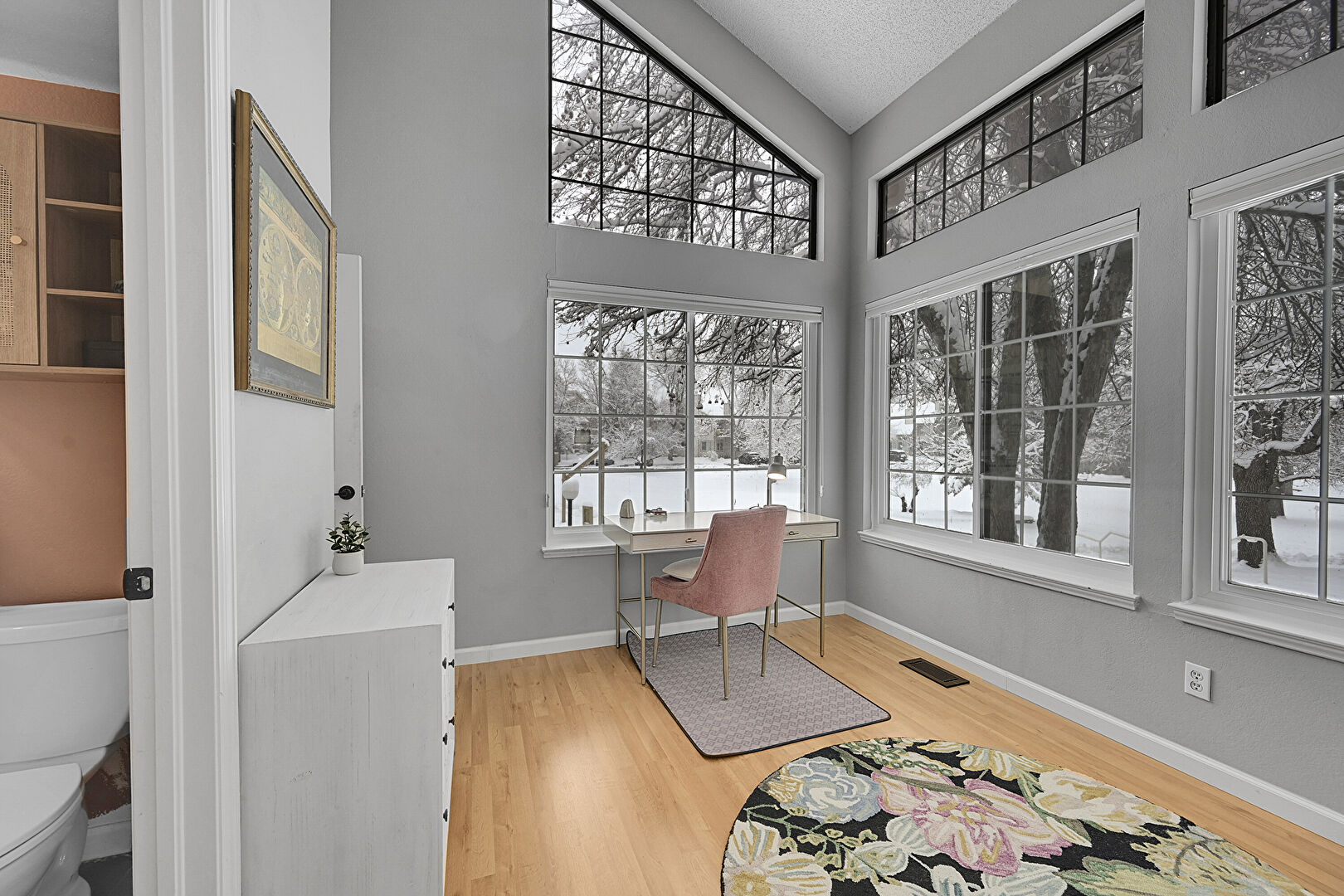 Baseboards Wall, Drywall, High Ceiling, Natural Light, Office Area, Vaulted Ceiling, Vent, Wood Finish Floor, Natural Light, Textured Ceiling, Vaulted Ceiling, Wood Finish Floor