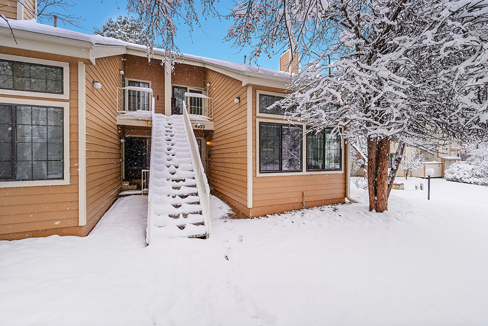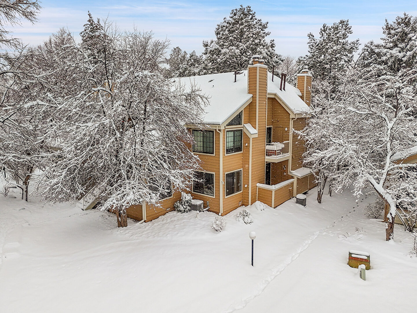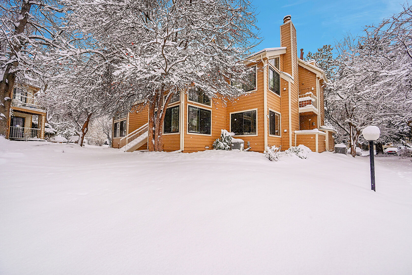 Balcony, Chimney, Gutters, Horizontal Siding, Stairs, Balcony, Downspout, Stairs