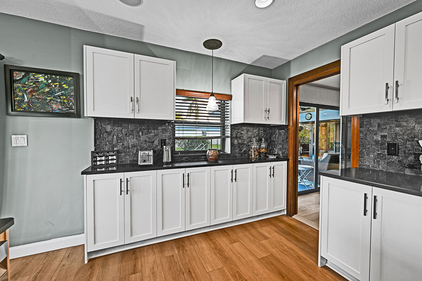Baseboards Wall, Ceiling Fan, Drywall, Kitchen Island, Natural Light, Notable Chandelier, Pendant Lighting, Recessed Lighting, Shaker Cabinets, Stone Countertops, Textured Ceiling, Toaster, Vent, Wood Finish Floor, Natural Light, Recessed Lighting, Stone Countertops, Vent, Wood Finish Floor