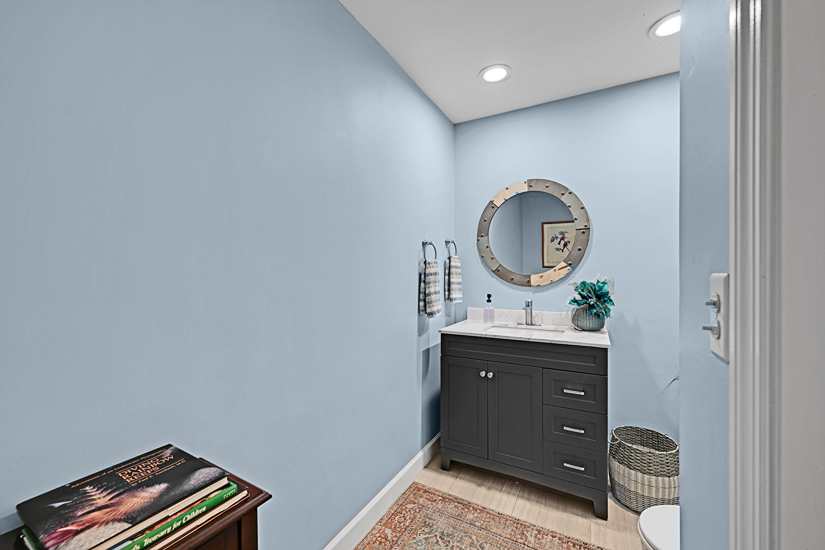 Baseboards Wall, Drywall, Half Bathroom, Tile Wall, Vanity, Wainscot Wall, Wood Finish Floor, Full Bathroom, Recessed Lighting