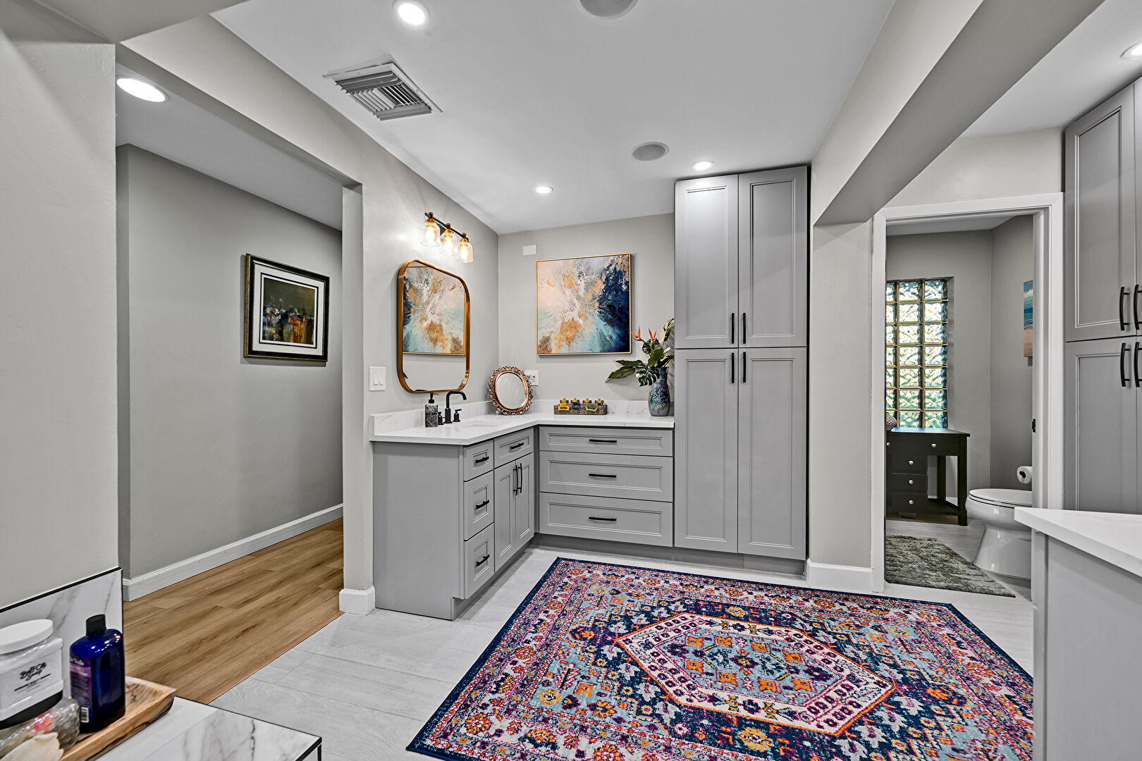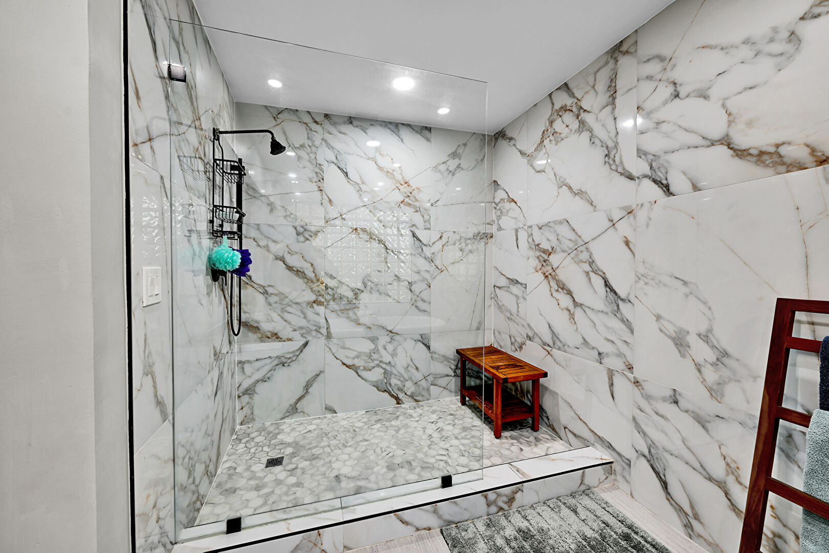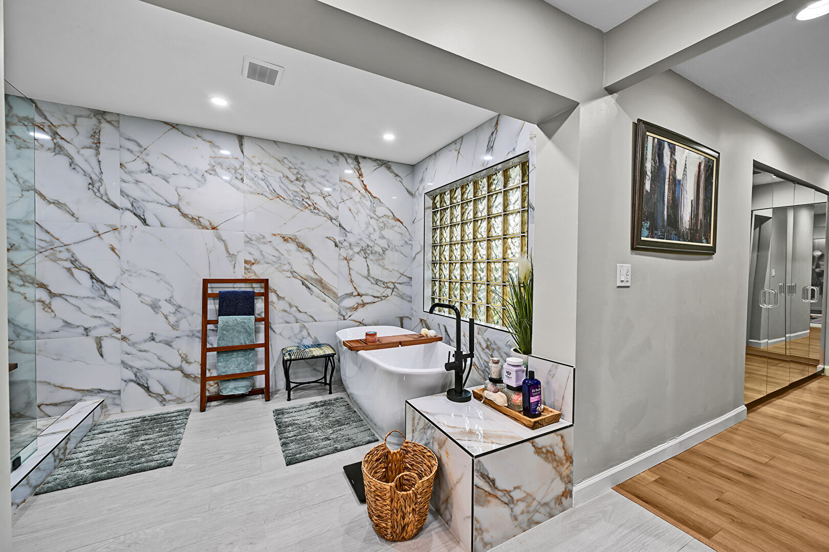 Baseboards Wall, Closet, Drywall, Full Bathroom, Natural Light, Recessed Lighting, Tile Wall, Two Single Vanities, Vanity, Vent, Wood Finish Floor, Baseboards Wall, Drywall, Marble Finish Floor, Marble Wall, Recessed Lighting, Vanity