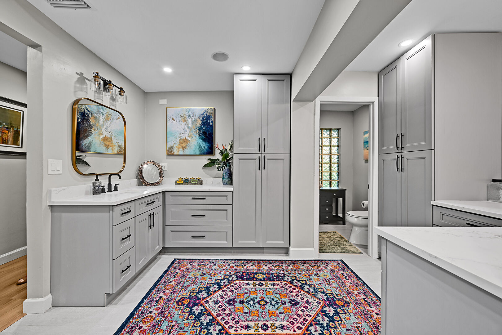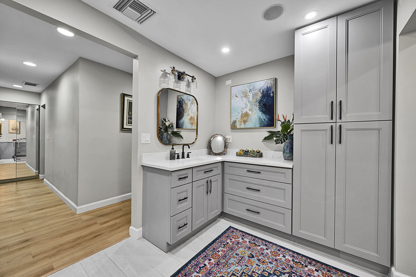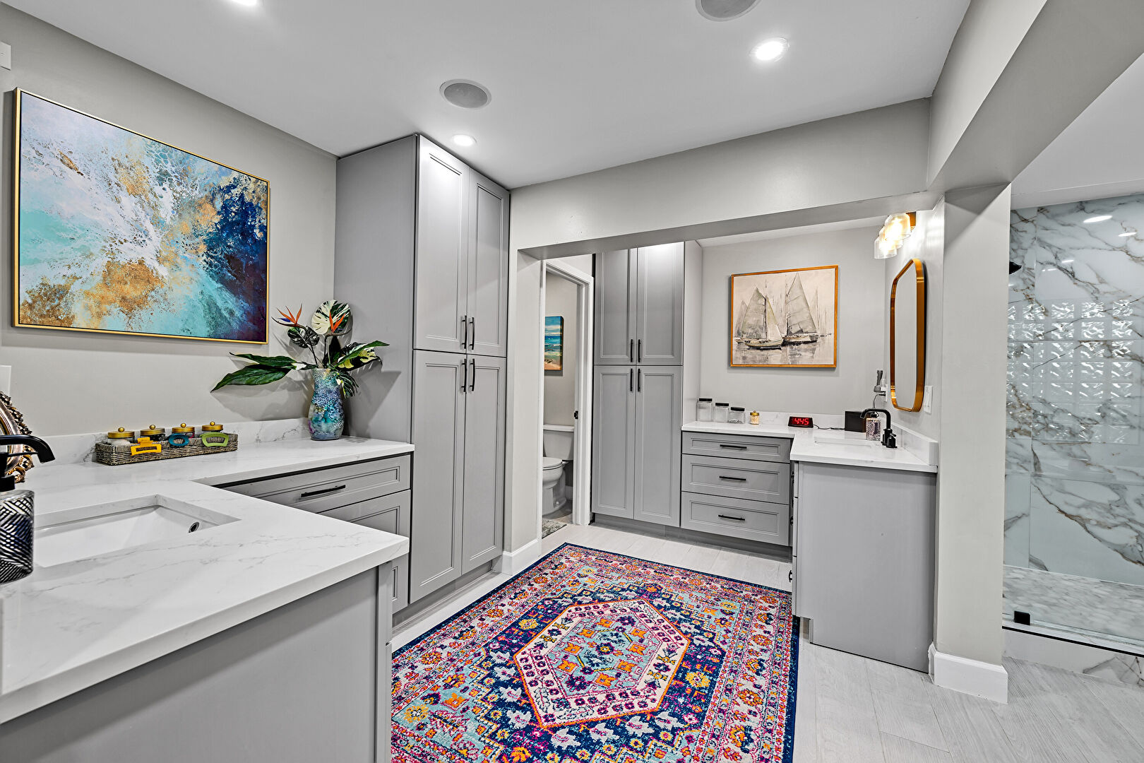 Baseboards Wall, Closet, Drywall, Full Bathroom, Natural Light, Recessed Lighting, Tile Wall, Two Single Vanities, Vanity, Vent, Wood Finish Floor, Baseboards Wall, Drywall, Marble Finish Floor, Marble Wall, Recessed Lighting, Vanity