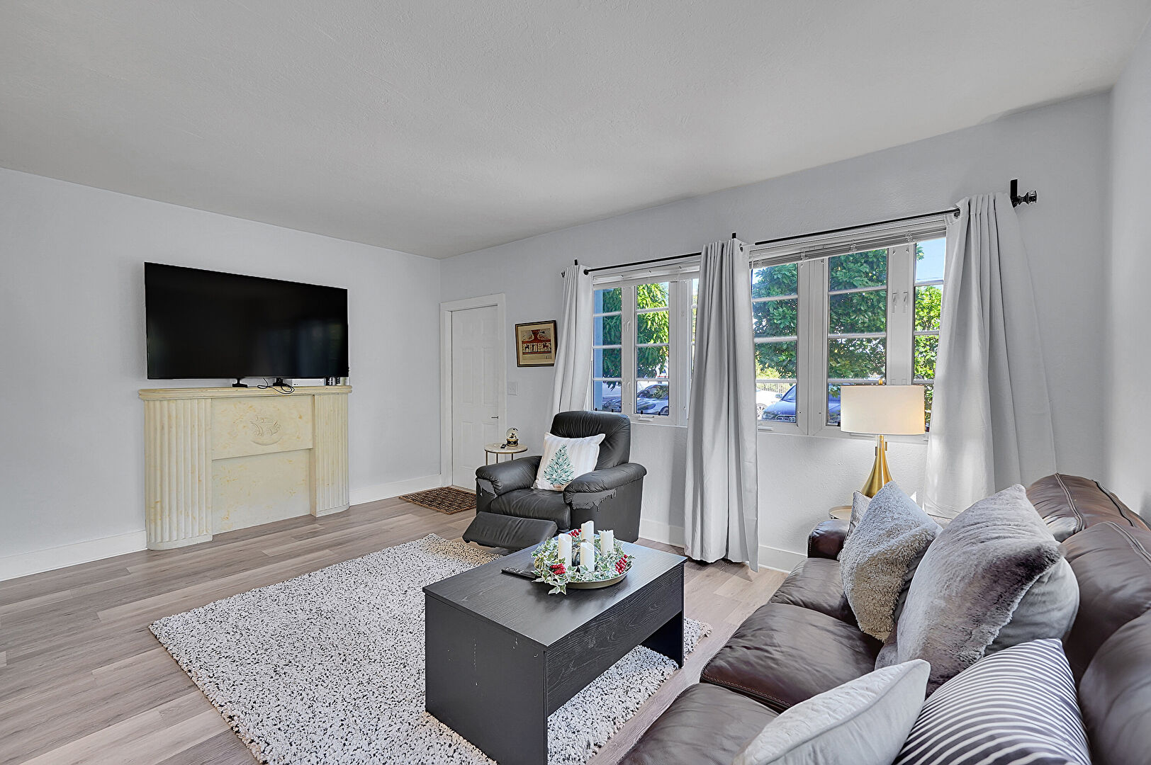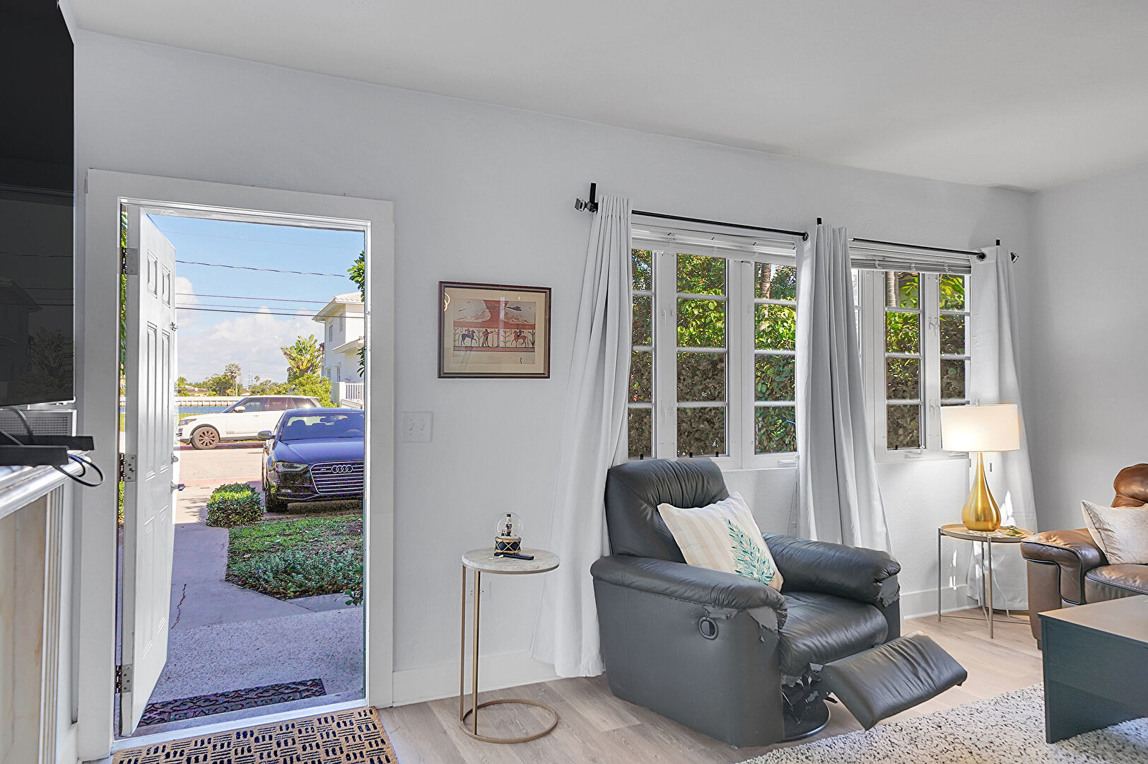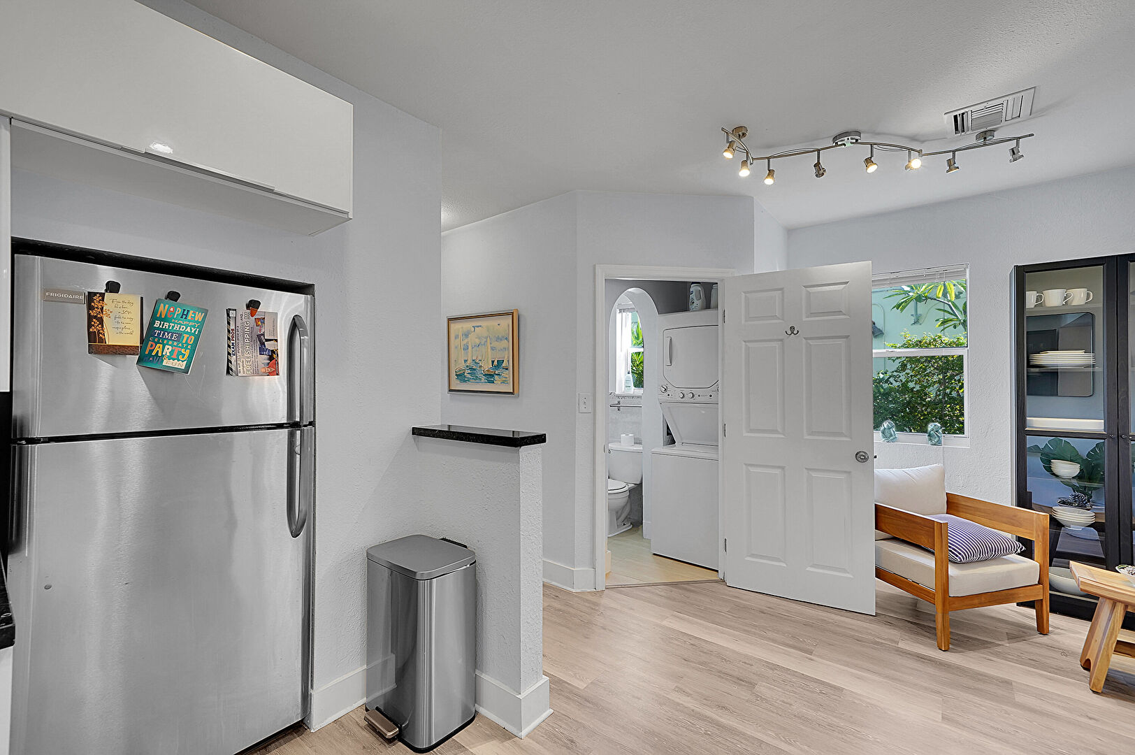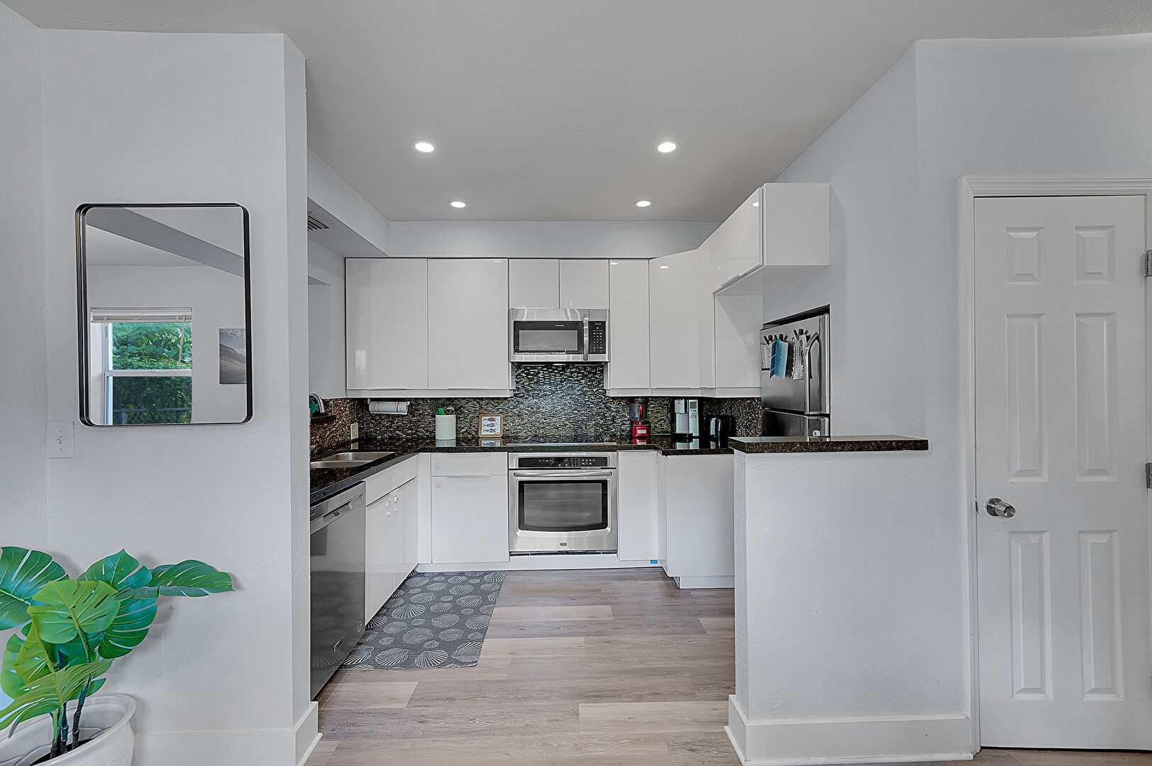 Baseboards Wall, Drywall, Flat Panel Cabinets, Laundry, Natural Light, Opens To Living Area, Pass Through Window, Recessed Lighting, Stone Countertops, Vent, Vinyl Floor, Wood Finish Floor, Baseboards Wall, Drywall, Natural Light, U Shaped Kitchen