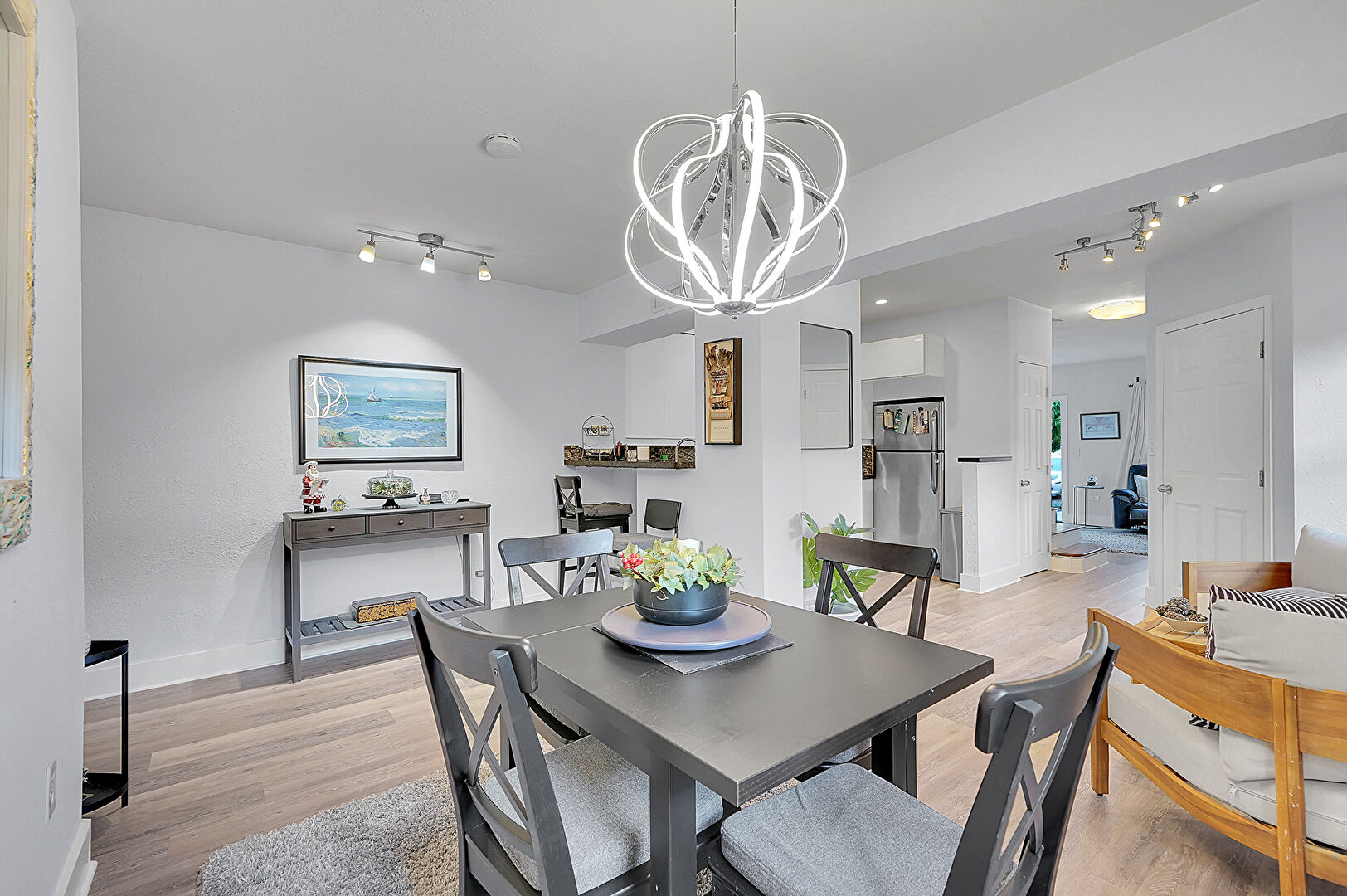 Baseboards Wall, Drywall, Natural Light, Notable Chandelier, Track Lighting, Vent, Wood Finish Floor, Baseboards Wall, Wood Finish Floor