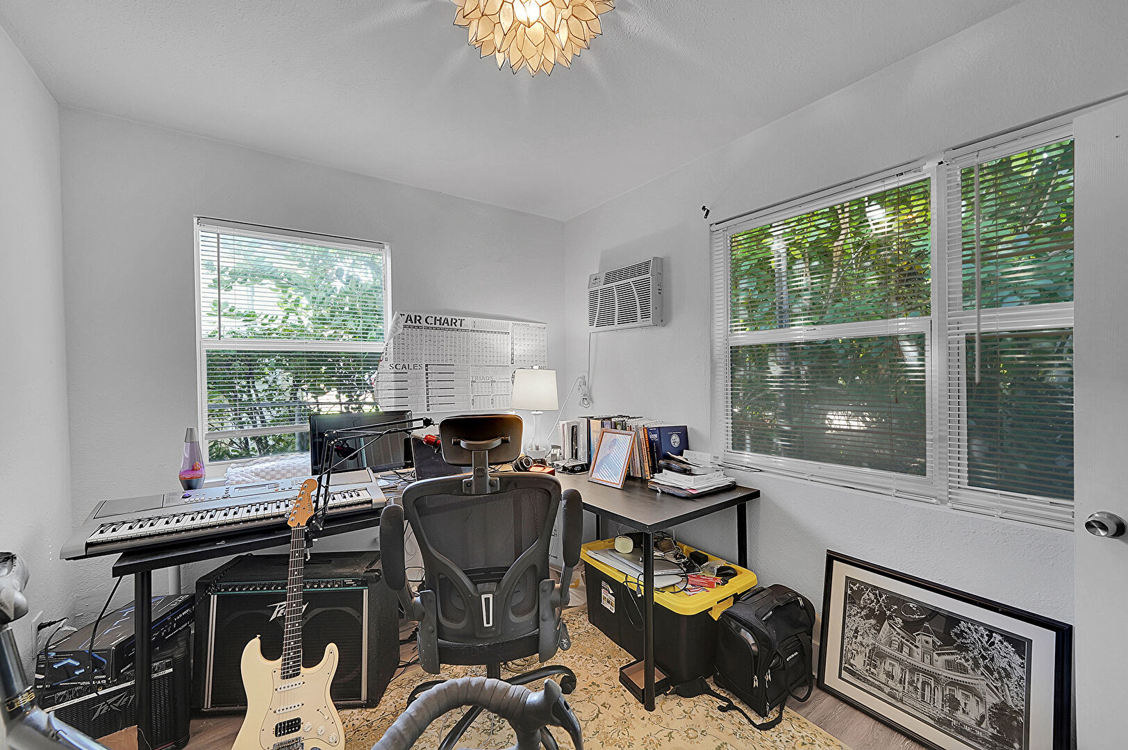 Drywall, Natural Light, Office Area, Wood Finish Floor, Wall Mounted Ac