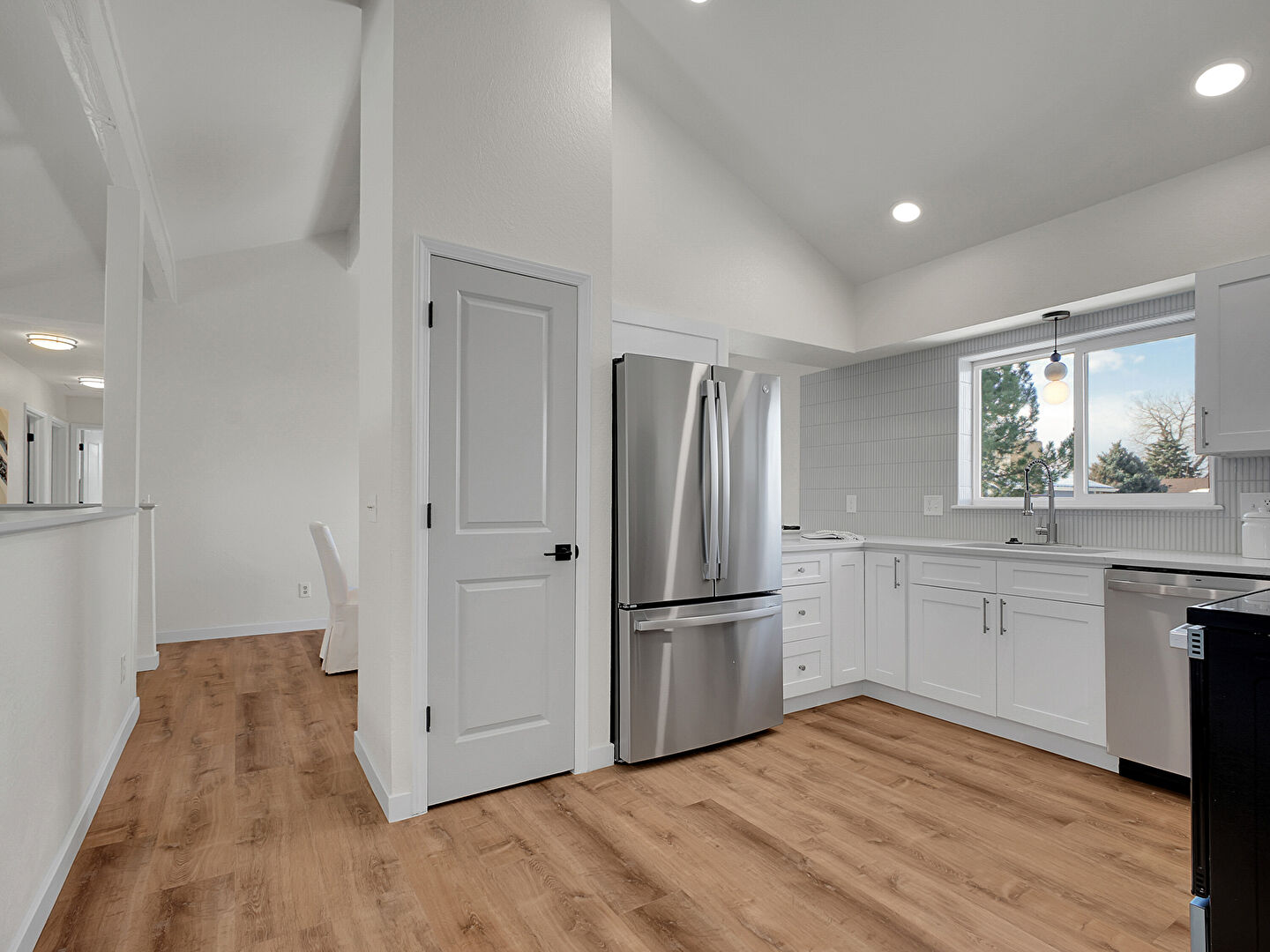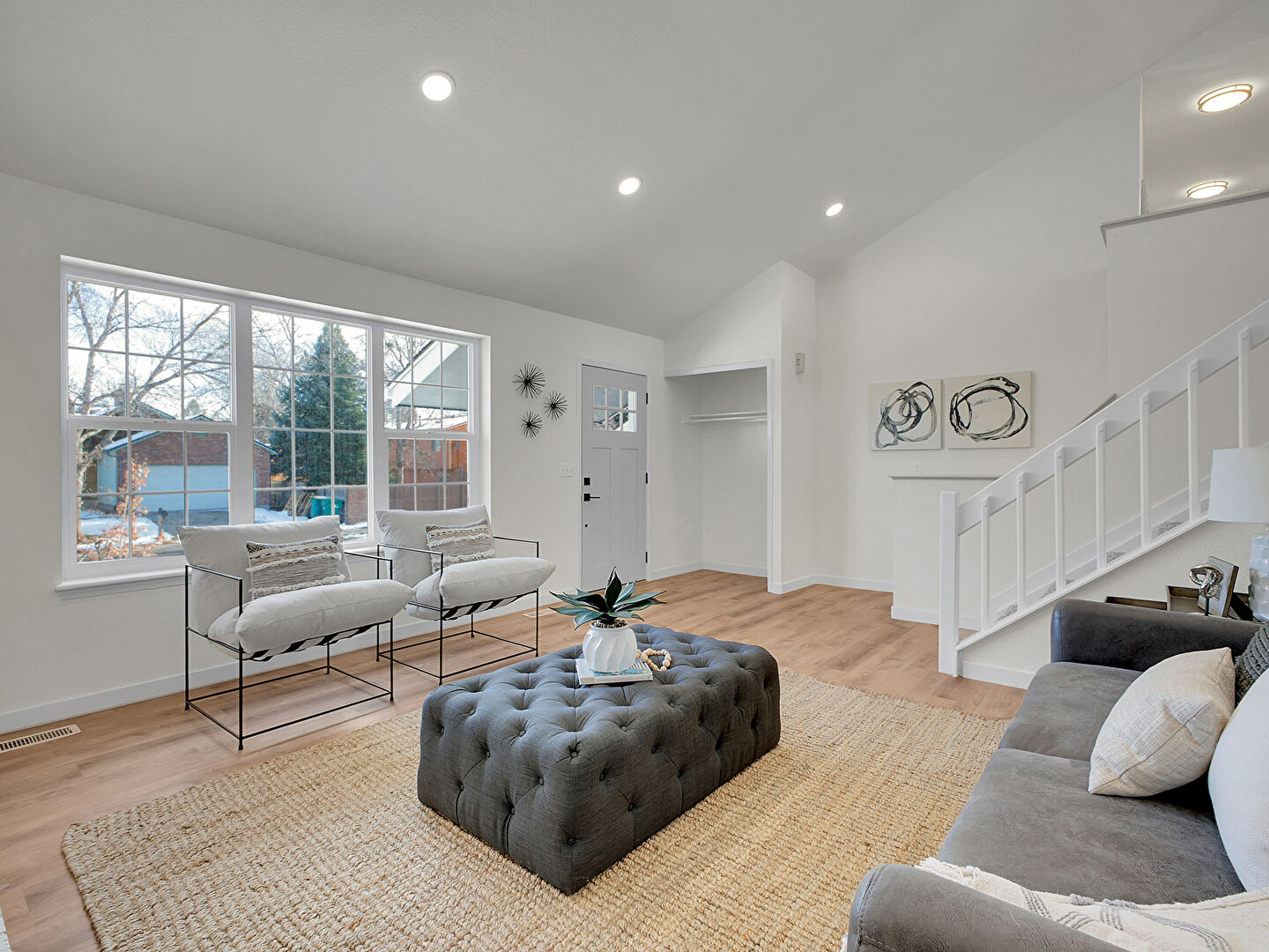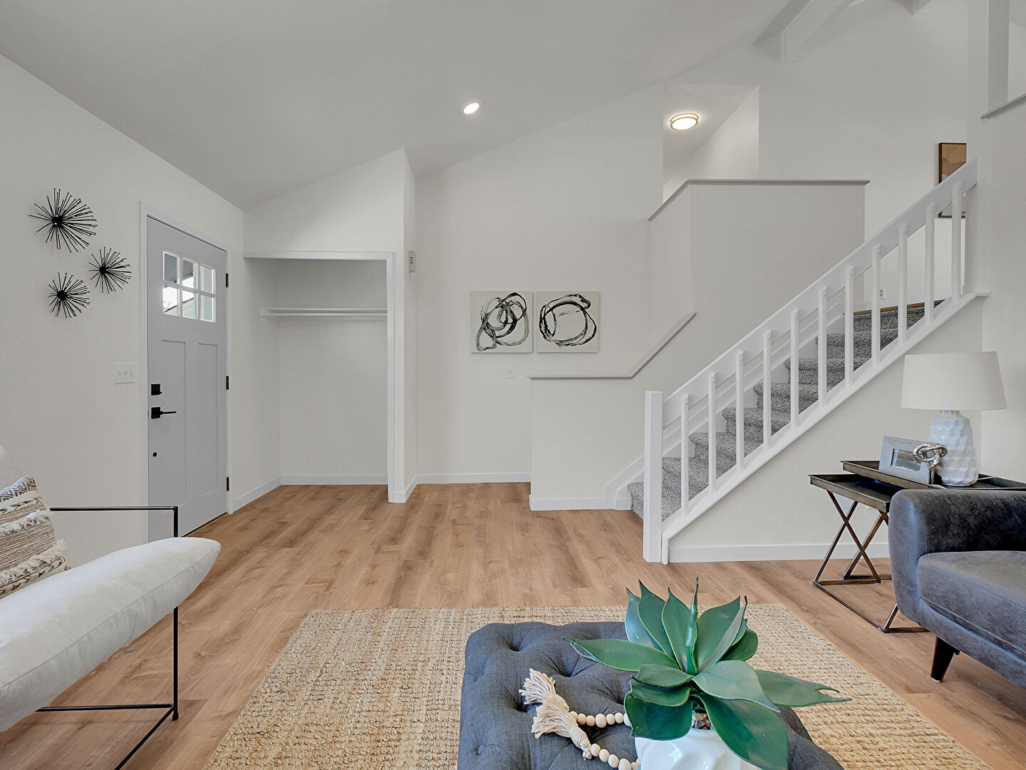 Baseboards Wall, Drywall, Natural Light, Recessed Lighting, Stairs, Vaulted Ceiling, Wood Finish Floor, High Ceiling