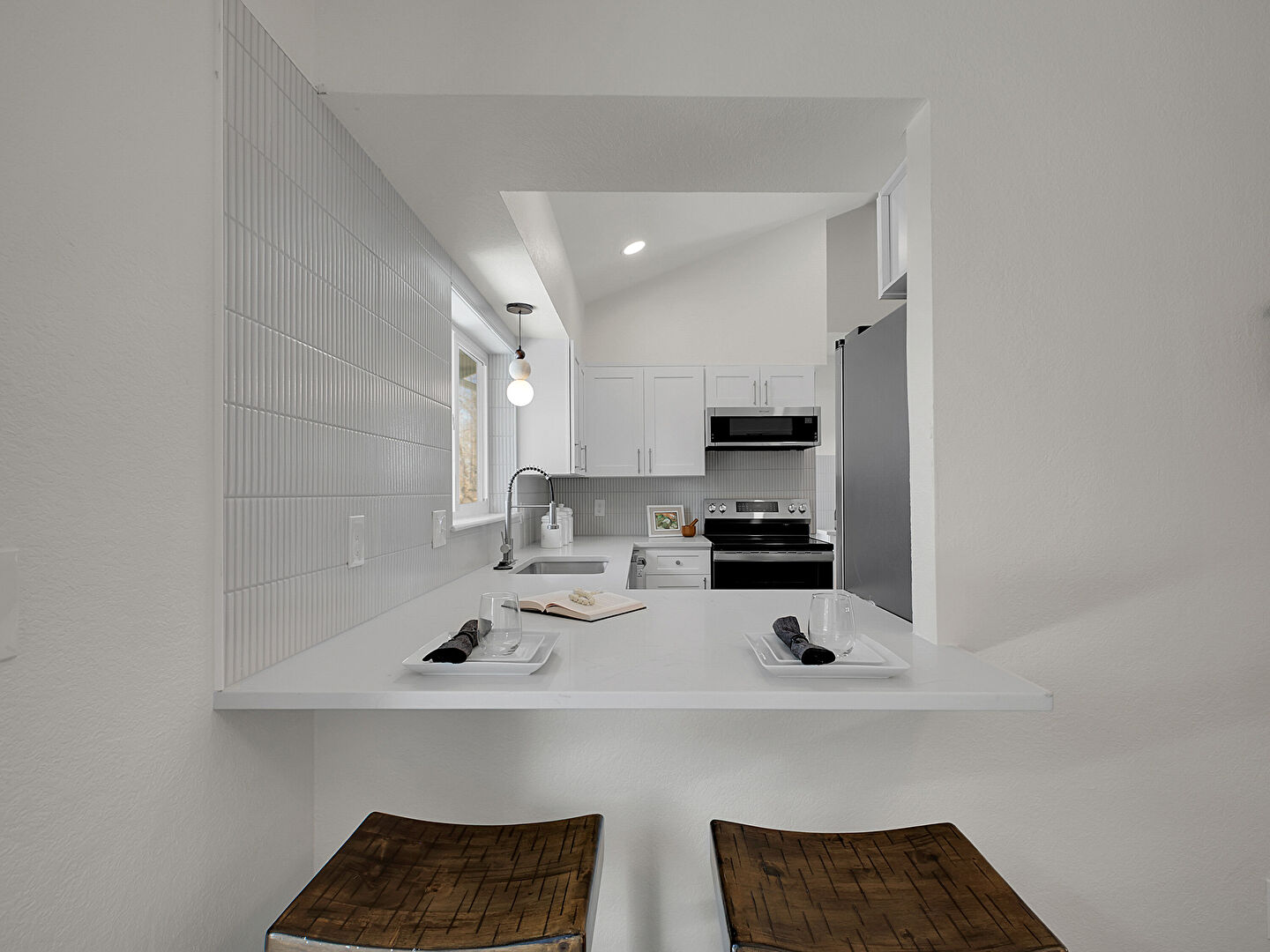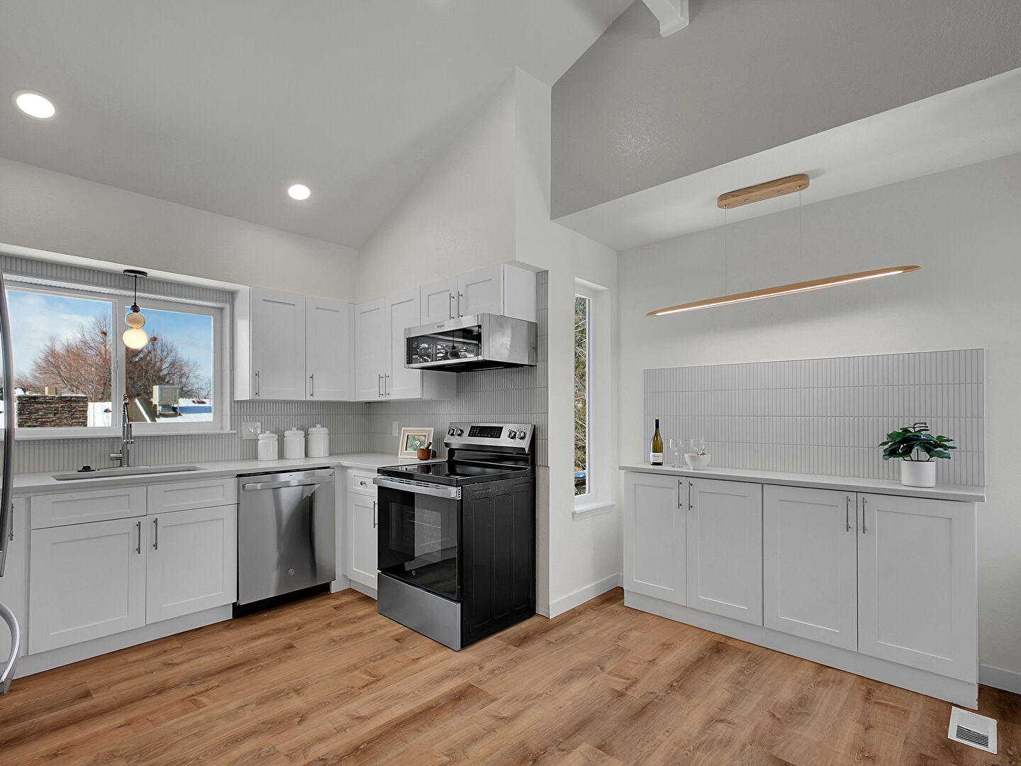 Baseboards Wall, Drywall, High Ceiling, Kitchen Bar, Kitchen Peninsula, Natural Light, Pendant Lighting, Recessed Lighting, Shaker Cabinets, Stone Countertops, Vaulted Ceiling, Vent, Wood Finish Floor, Drywall, Pass Through Window, Recessed Lighting, Shaker Cabinets, Wood Finish Floor