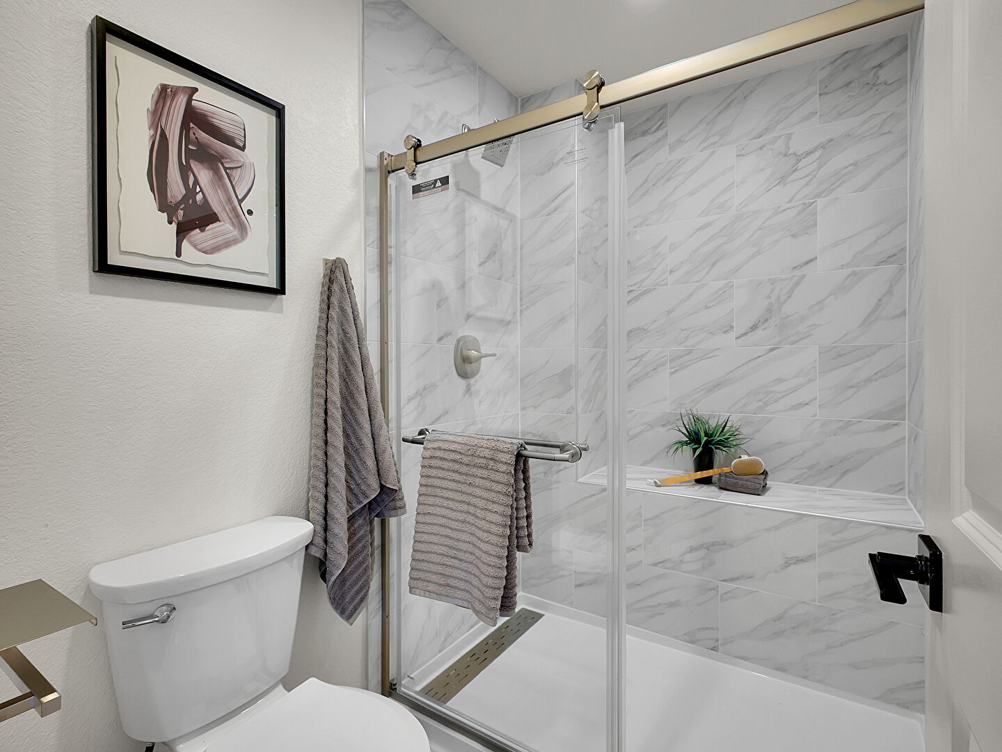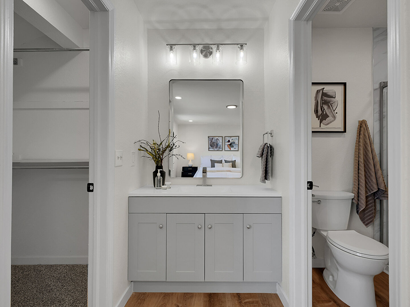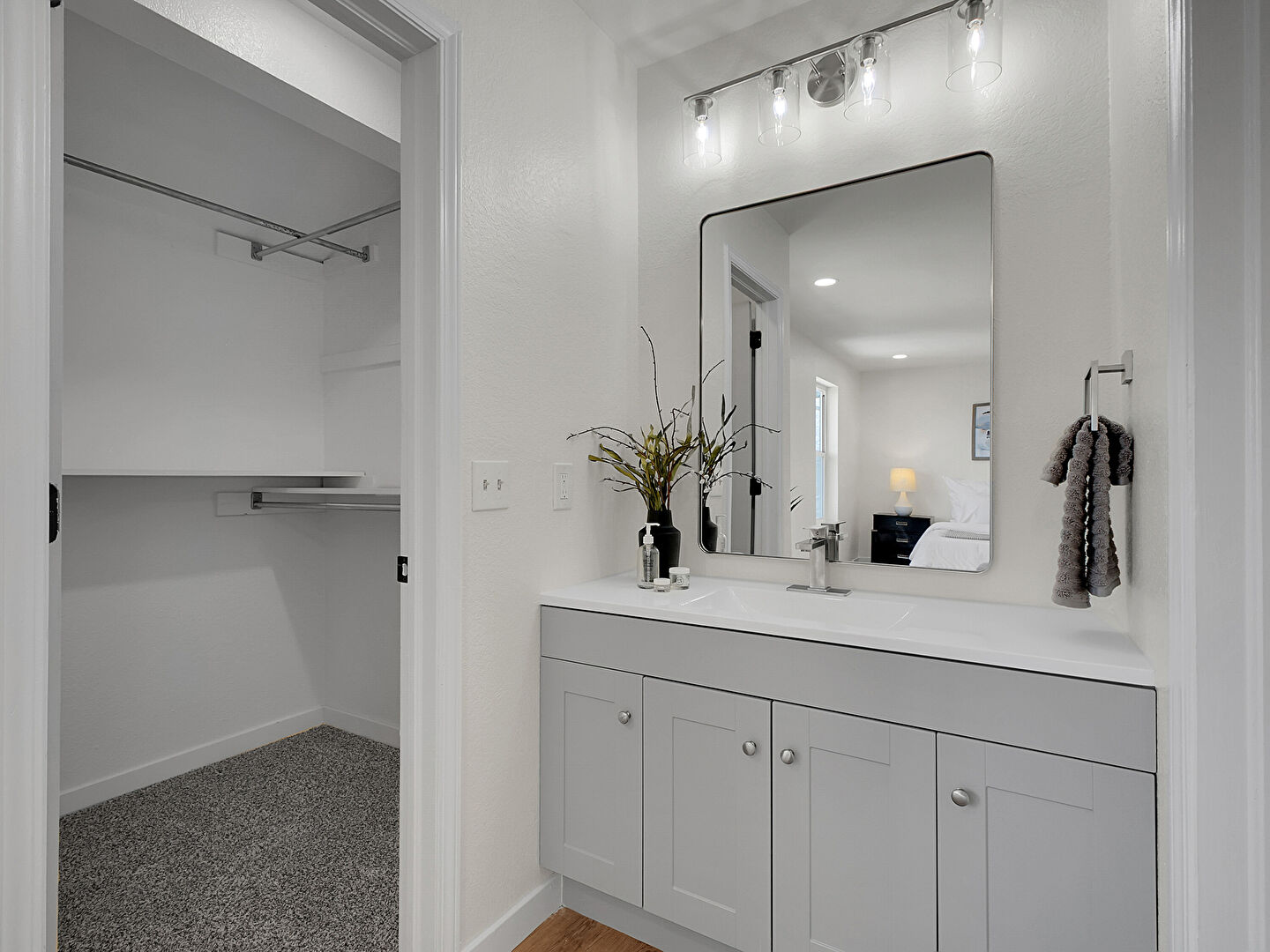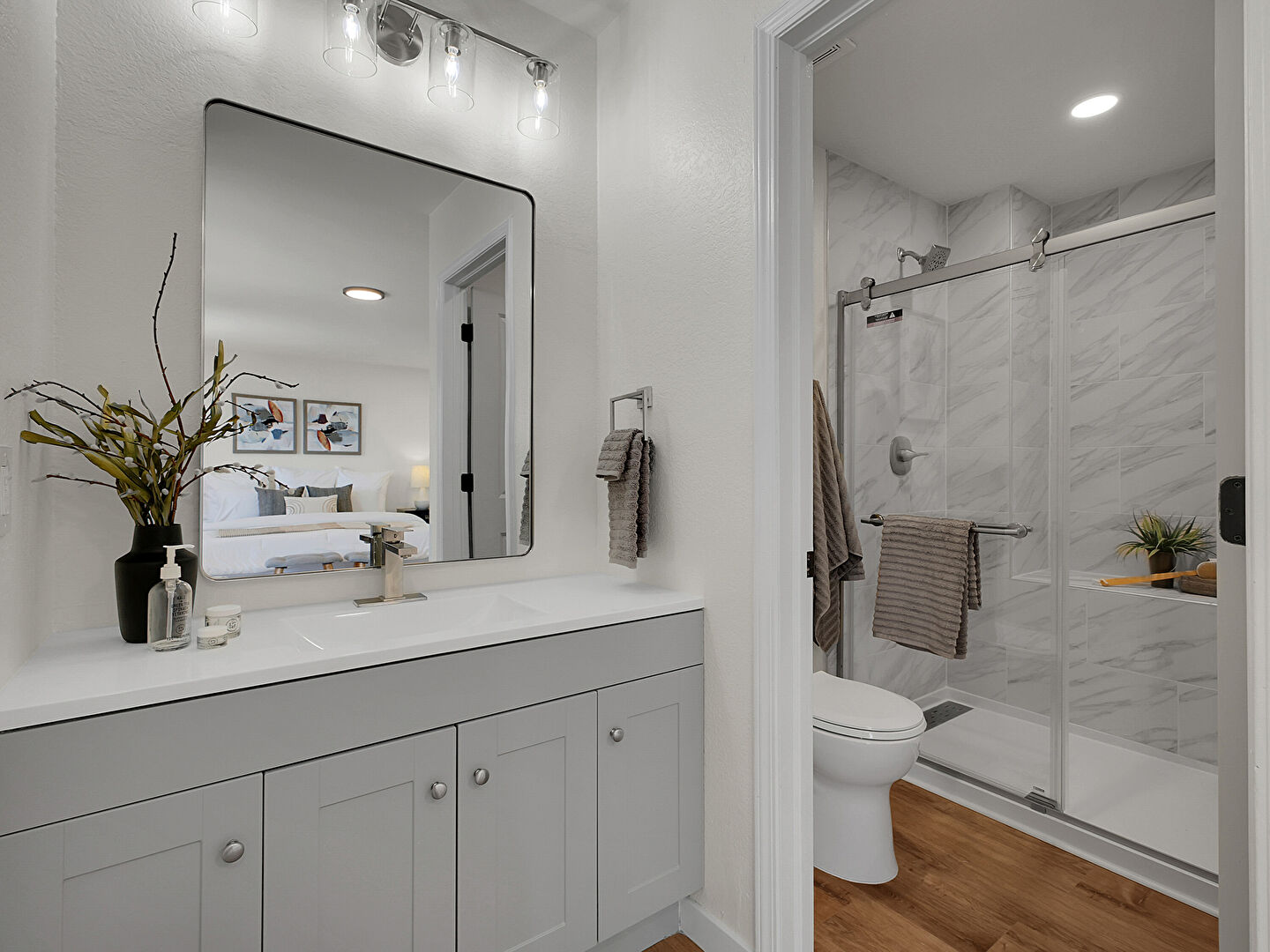Baseboards Wall, Drywall, Ensuite Bathroom, Full Bathroom, Natural Light, Recessed Lighting, Vanity, Vent, Walk In Closet, Wood Finish Floor, Carpet, Combined Bath Shower, Recessed Lighting, Textured Wall, Wood Finish Floor