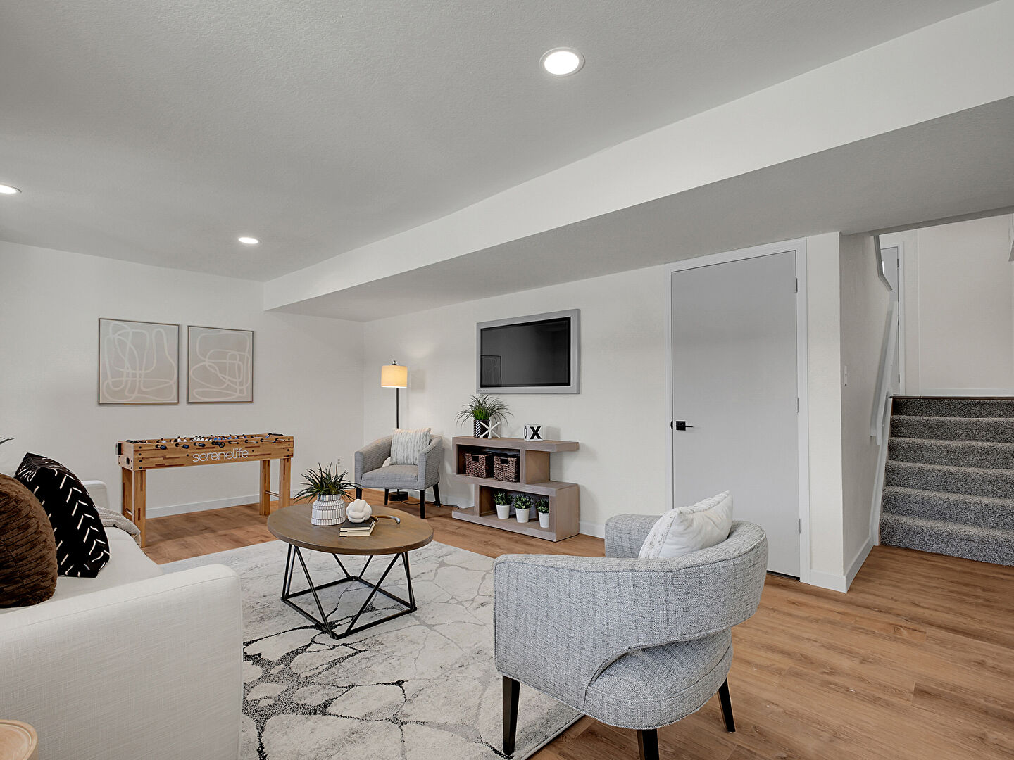 Baseboards Wall, Basement, Beamed Ceiling, Cathedral Ceiling, Drywall, Fireplace, High Ceiling, Natural Light, Recessed Lighting, Stairs, Vaulted Ceiling, Vent, Wood Finish Floor, Baseboards Wall, Drywall, Natural Light, Recessed Lighting, Stairs, Wood Finish Floor