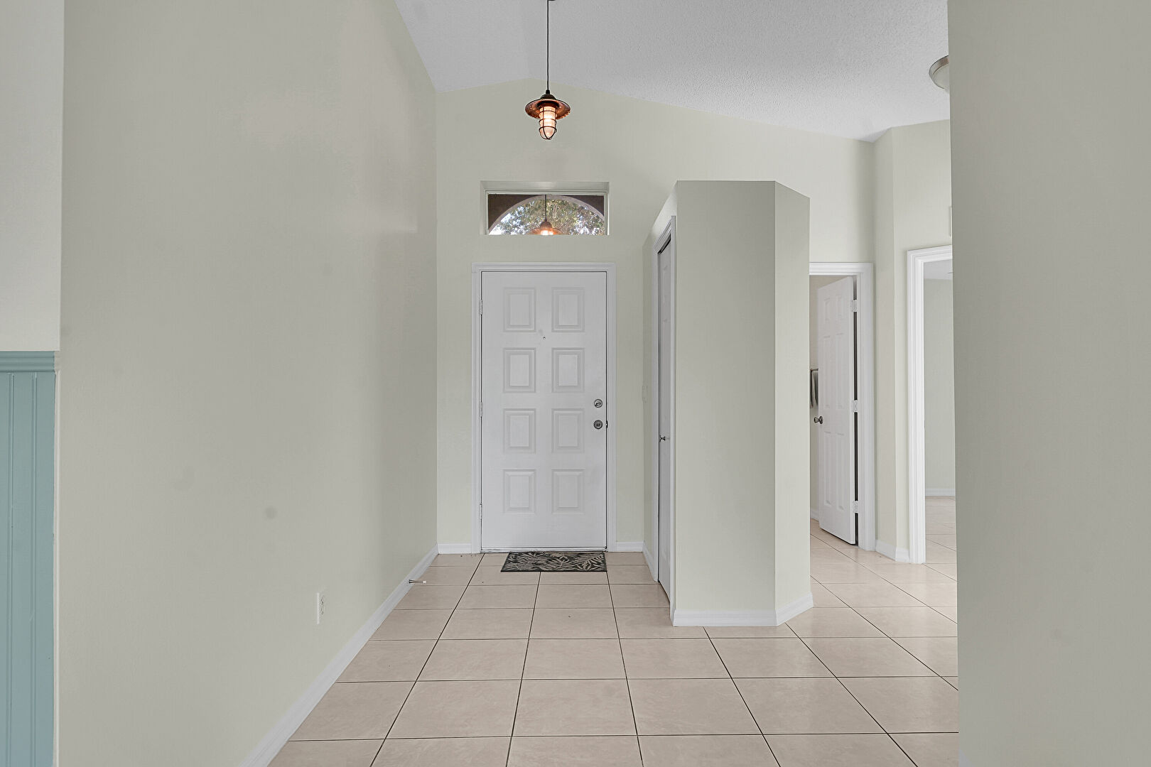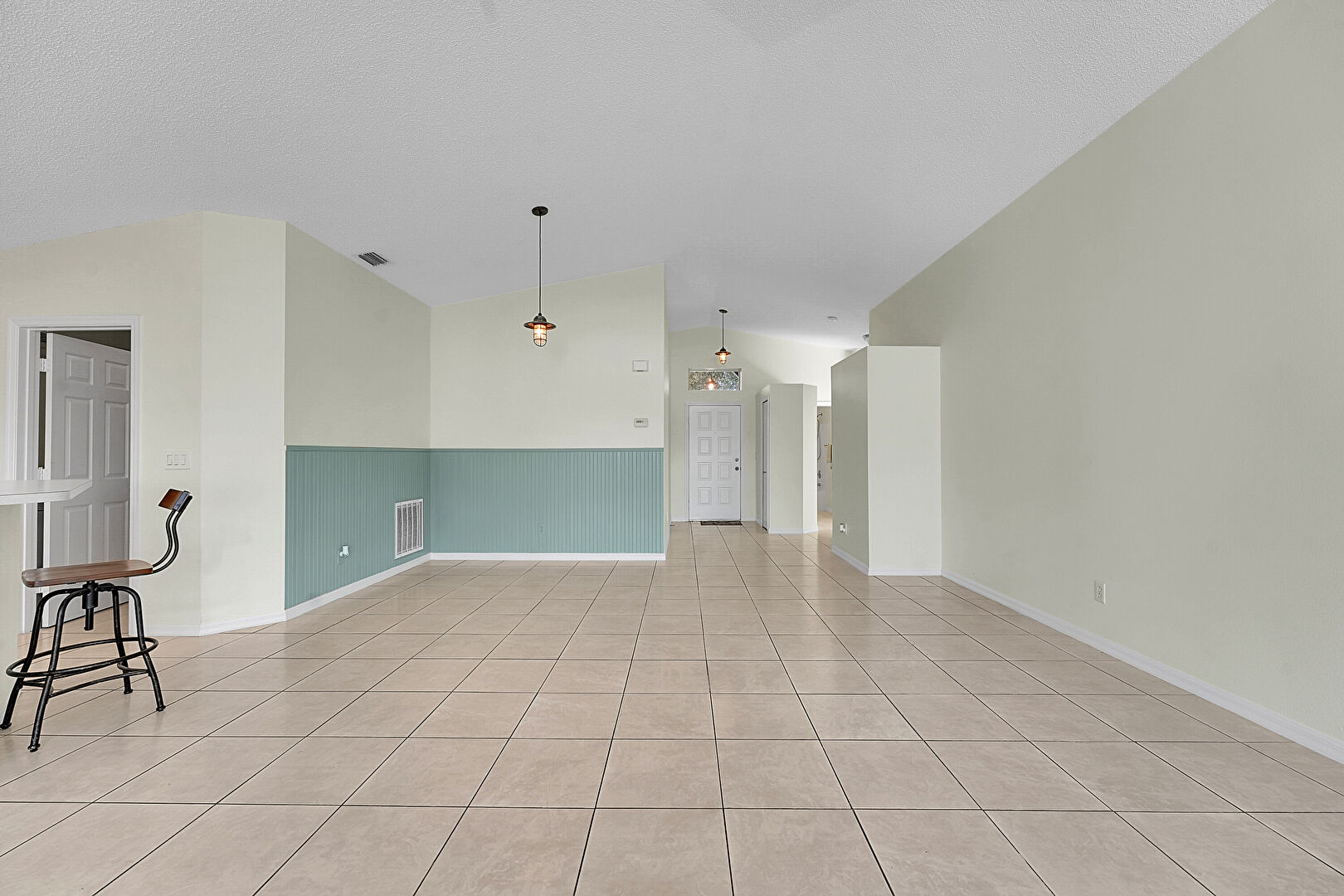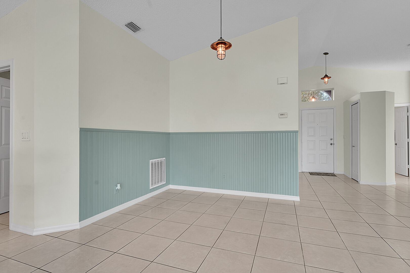 Baseboards Wall, Drywall, High Ceiling, Tile Floor, Vaulted Ceiling, Vent, Wainscot Wall, Wood Wall, Baseboards Wall, Textured Ceiling