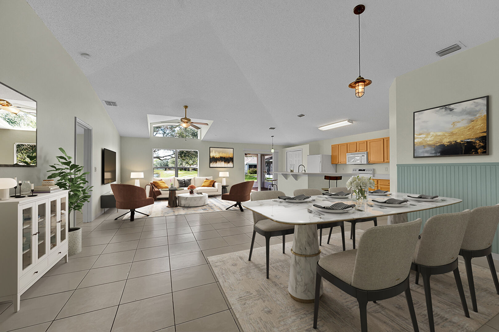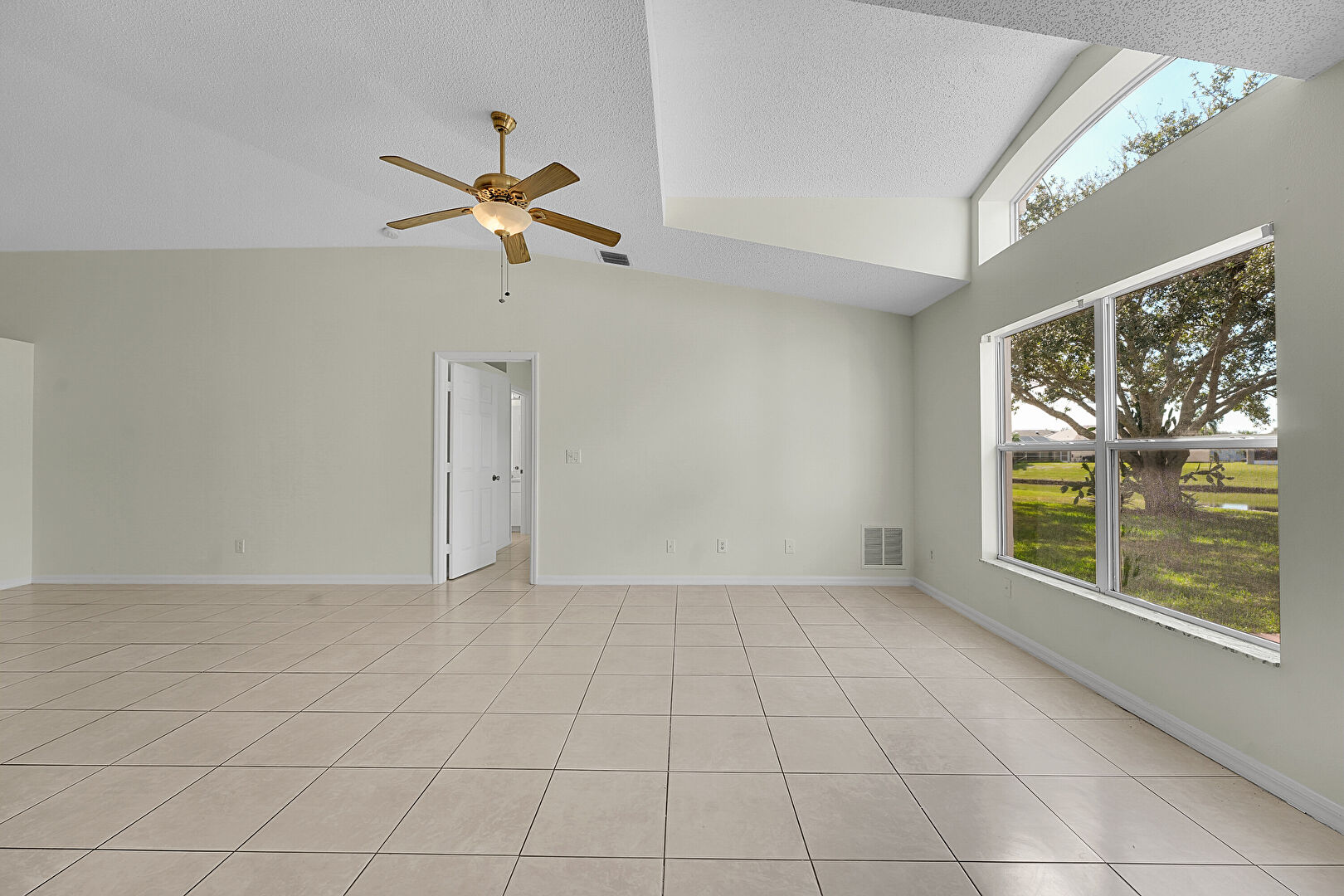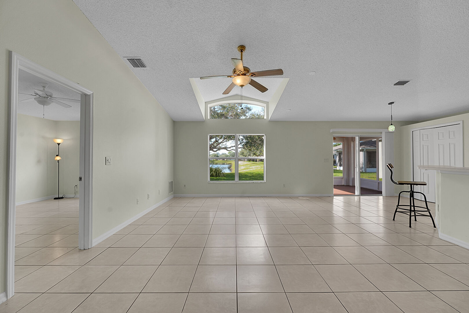 Baseboards Wall, Cathedral Ceiling, Ceiling Fan, Drywall, High Ceiling, Natural Light, Textured Ceiling, Tile Floor, Vaulted Ceiling, Vent, Baseboards Wall, Vaulted Ceiling, Wainscot Wall