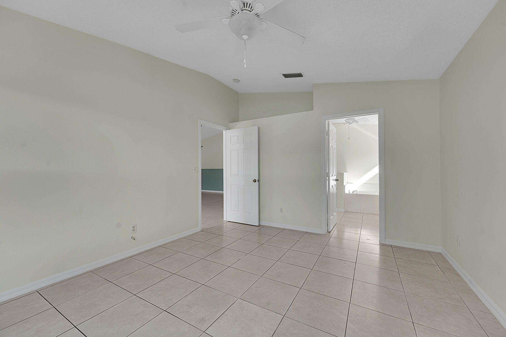 Baseboards Wall, Ceiling Fan, Drywall, Natural Light, Textured Ceiling, Tile Floor, Vaulted Ceiling, Vent, Ceiling Fan, Vent