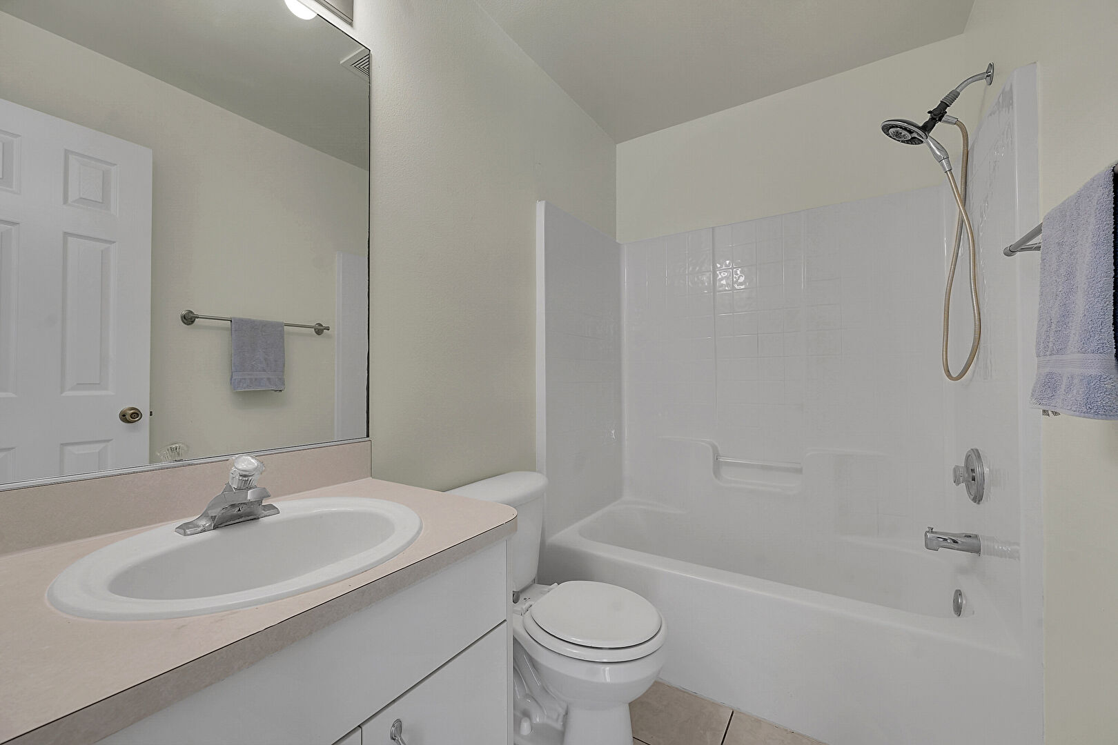 Combined Bath Shower, Drywall, Full Bathroom, Vanity, Tile Floor