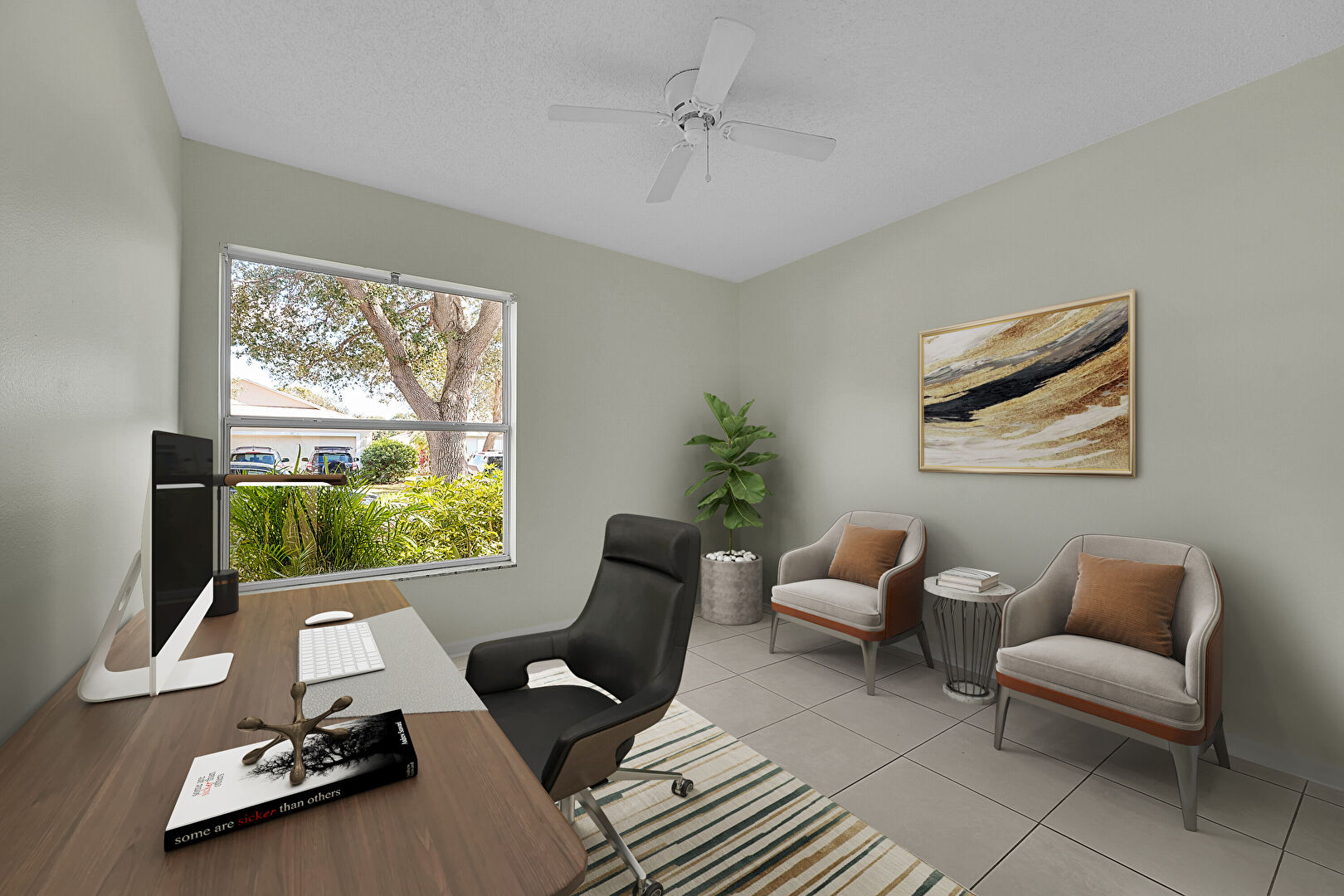 Ceiling Fan, Downspout, Gutters, Lawn, Patio, Shingle Roof, Stucco Siding, Sunroom, Patio, Shingle Roof, Sunroom