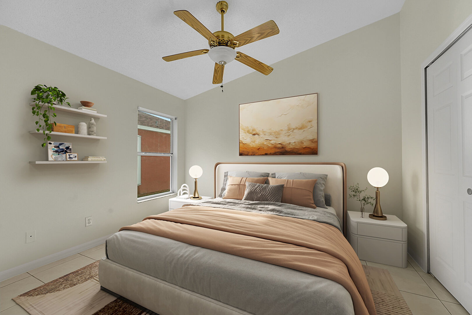 Baseboards Wall, Ceiling Fan, Closet, Drywall, Textured Ceiling, Tile Floor, Vaulted Ceiling, Vent, Ceiling Fan, Natural Light