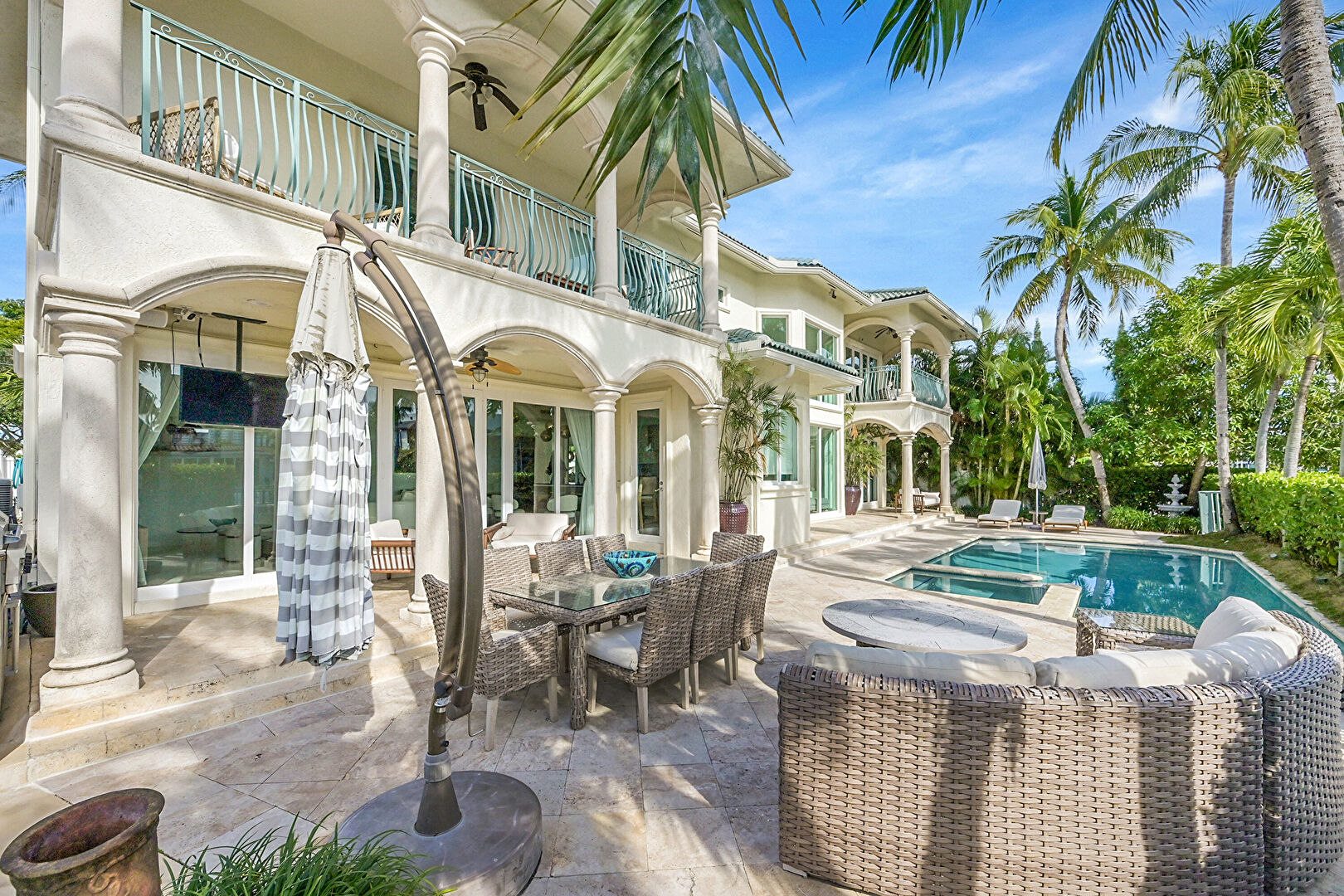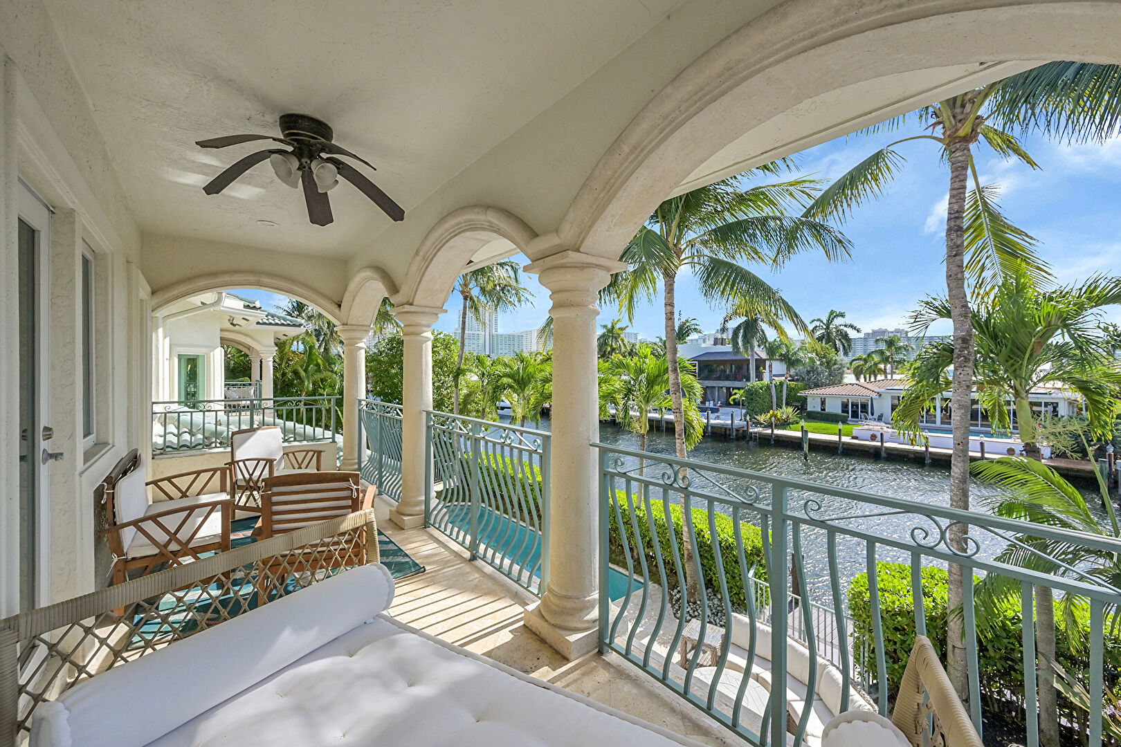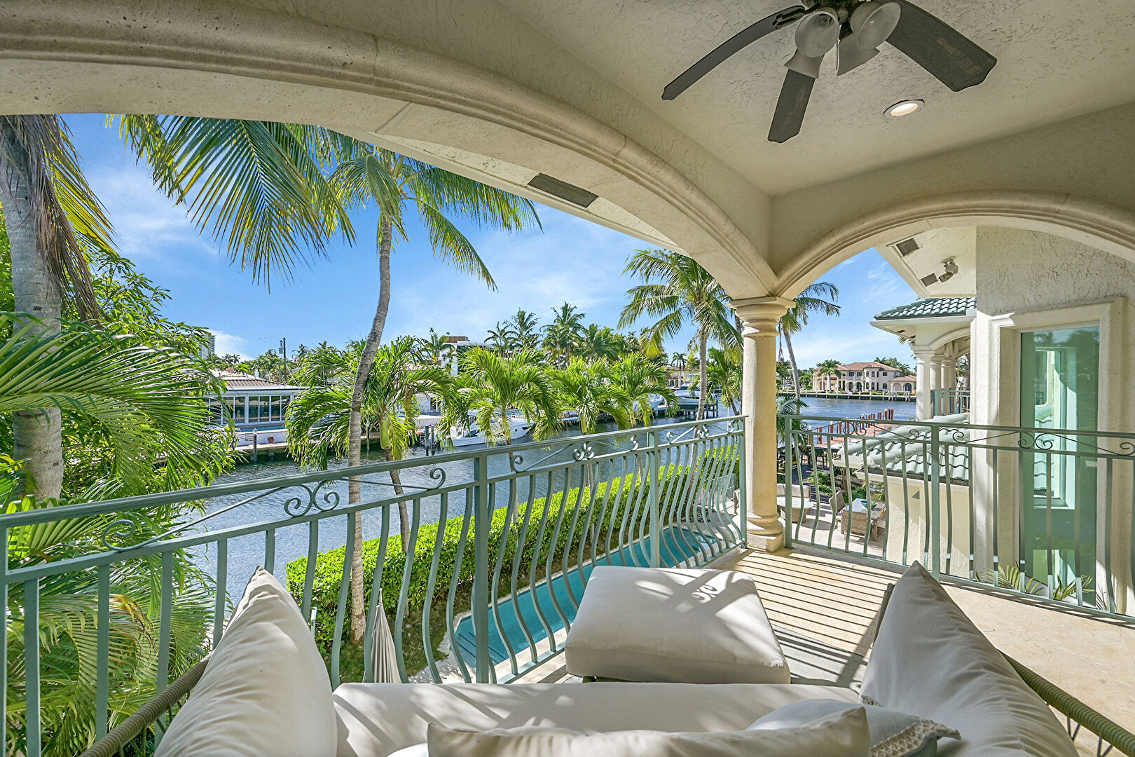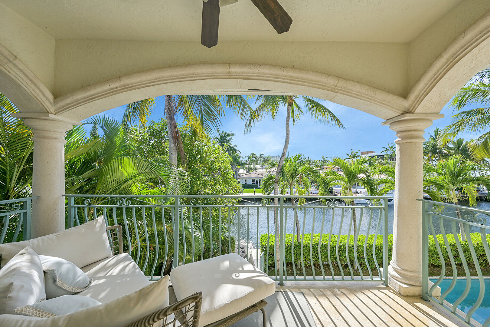 Balcony, Ceiling Fan, Outdoor Living Space, Patio, Pool, Residential View, Stucco Siding, Water View, Waterfront, Outdoor Dining Area, Waterfront Bulkhead