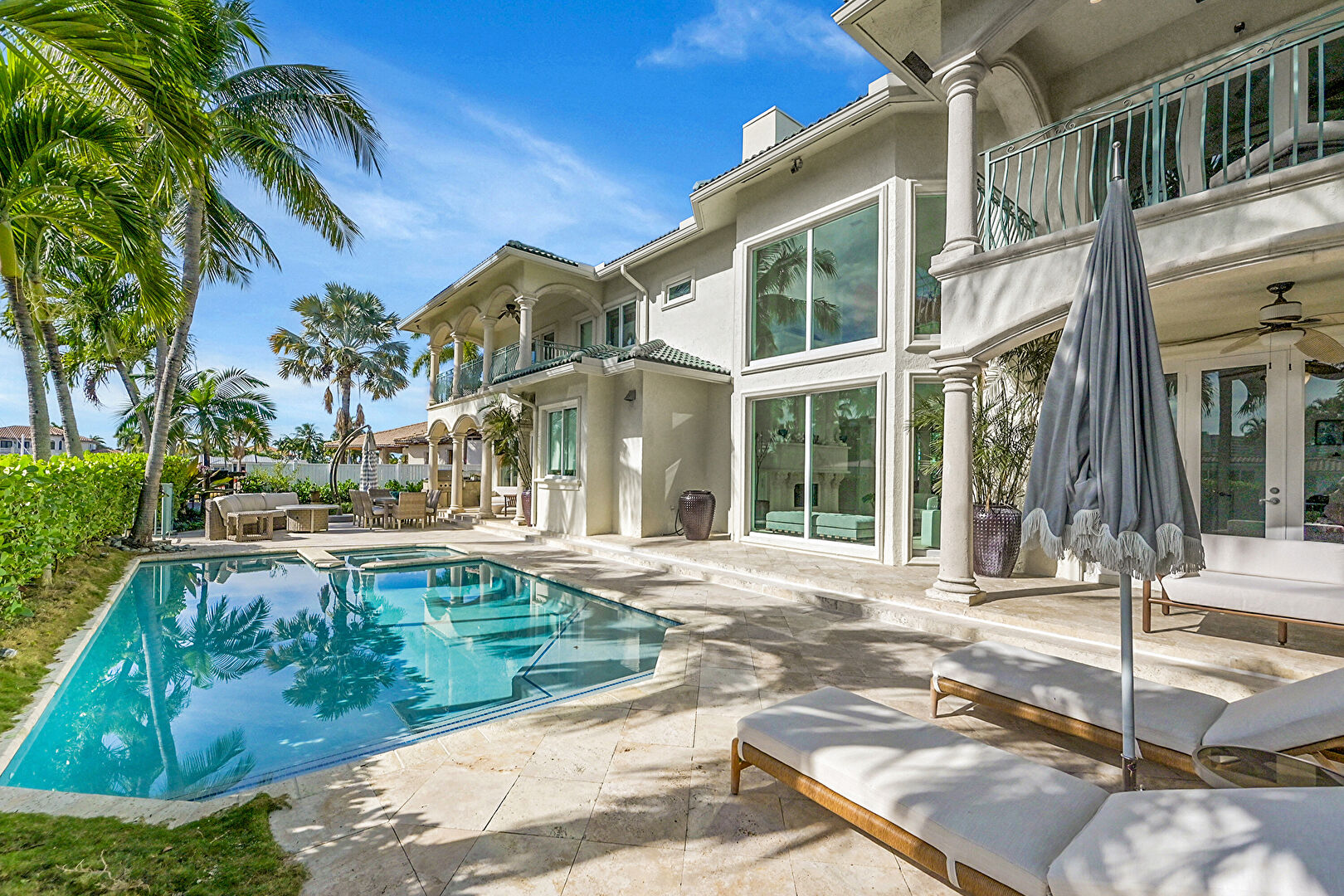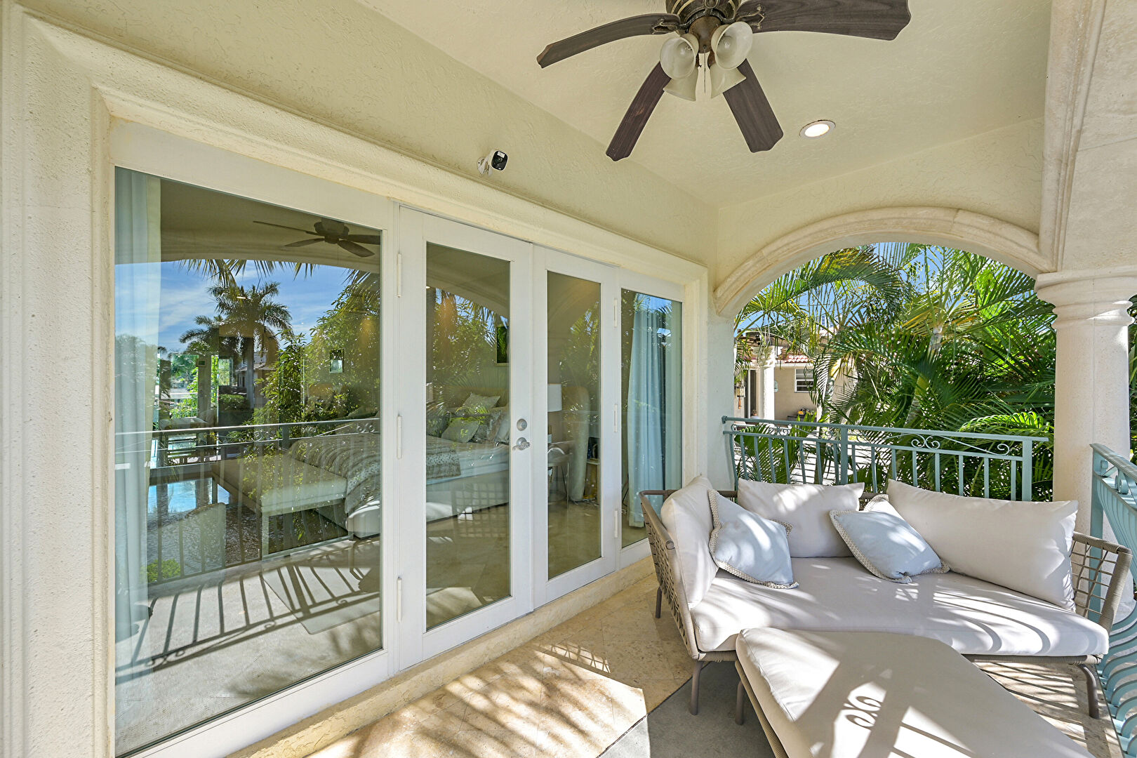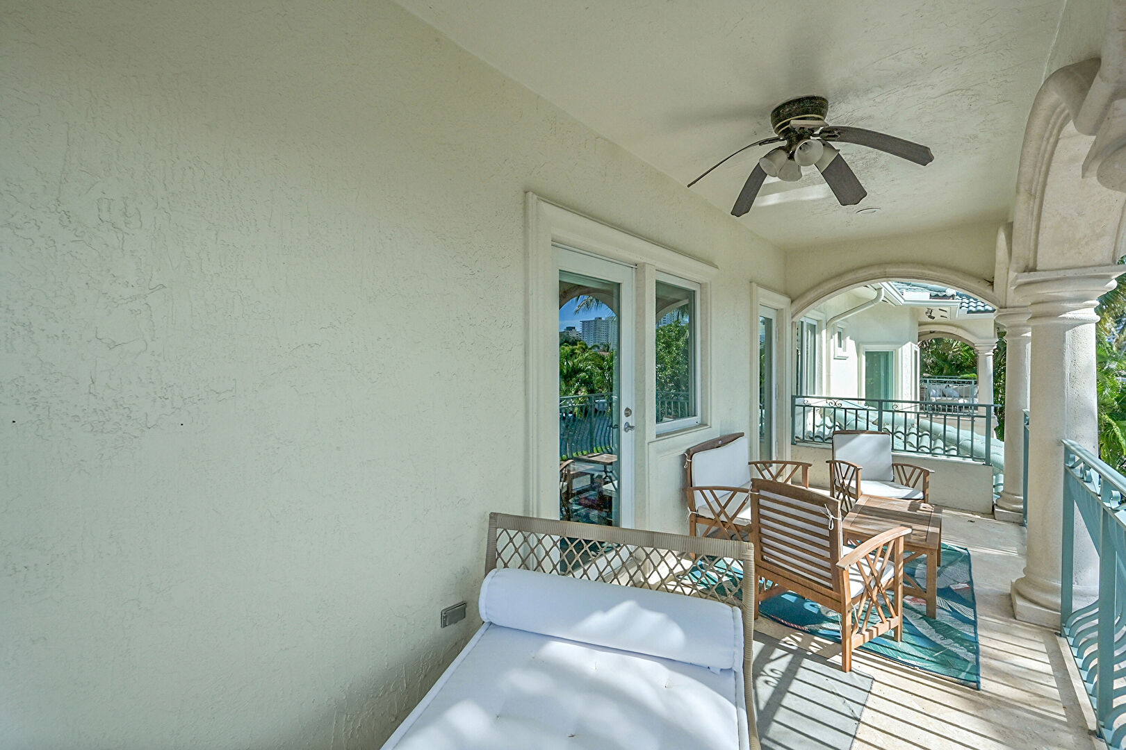 Balcony, Ceiling Fan, Outdoor Living Space, Patio, Pool, Residential View, Stucco Siding, Water View, Waterfront, Outdoor Dining Area, Waterfront Bulkhead