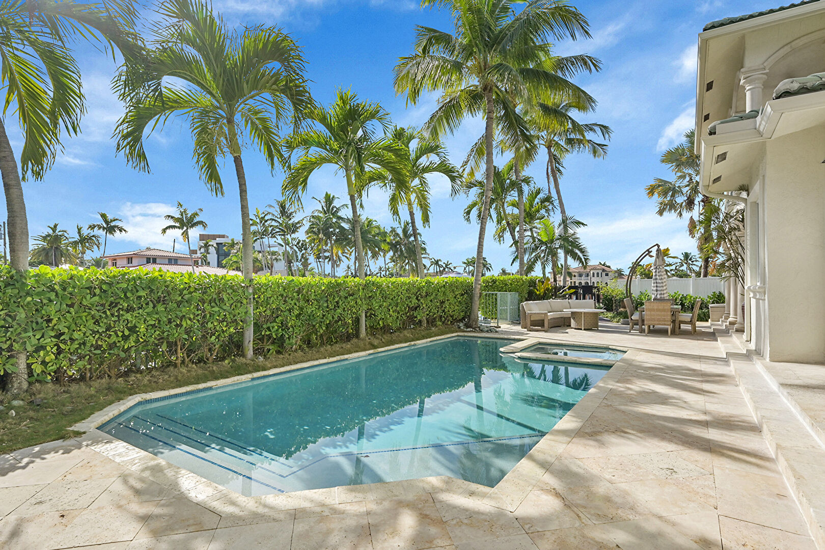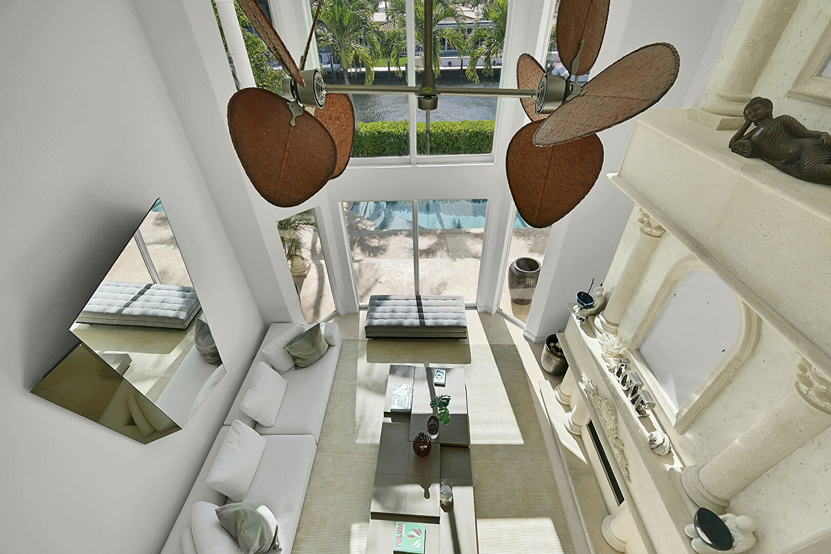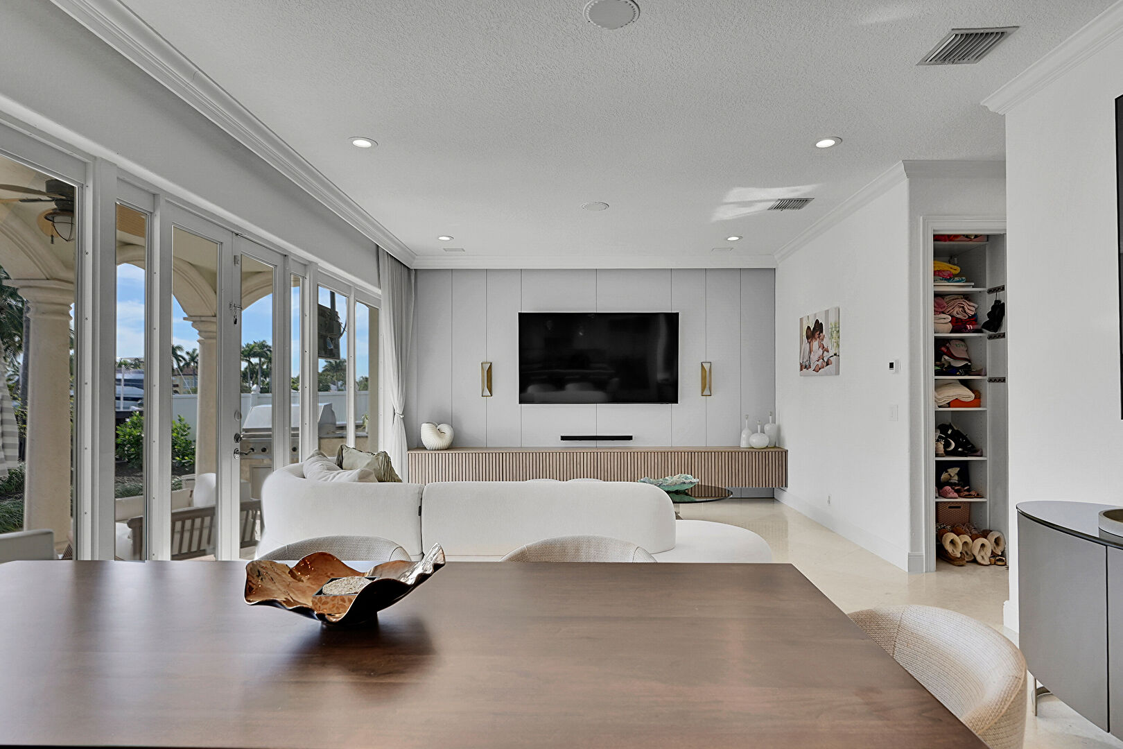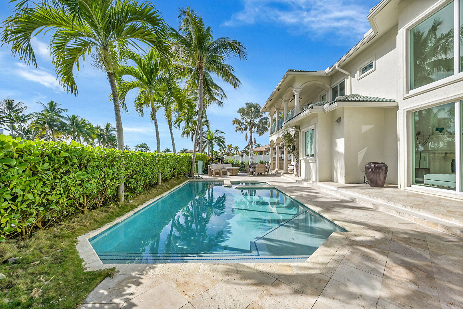 Balcony, Ceiling Fan, Outdoor Living Space, Patio, Pool, Residential View, Stucco Siding, Water View, Waterfront, Outdoor Dining Area, Waterfront Bulkhead