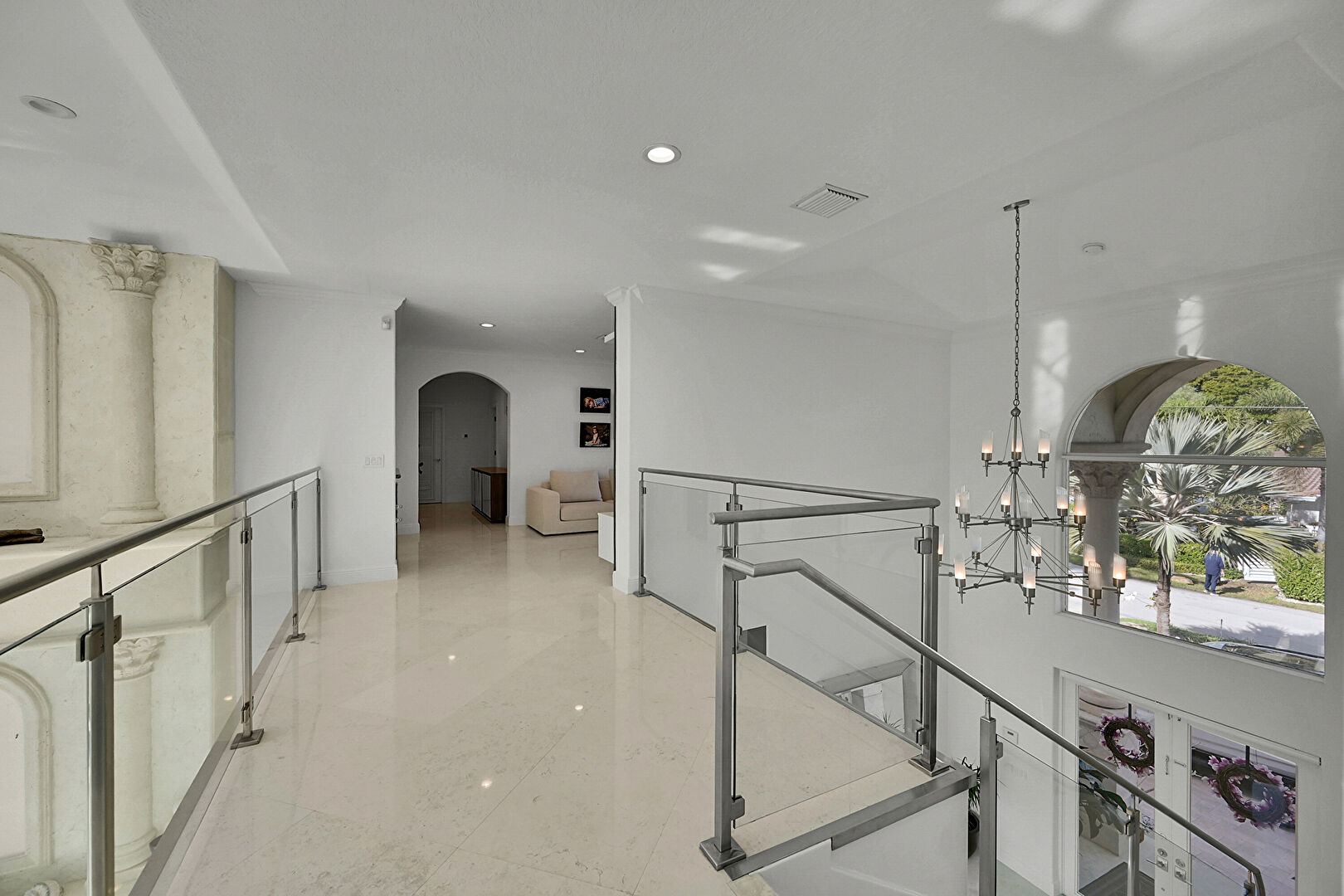 Arched Walkways, Baseboards Wall, Crown Molding, Drywall, Loft, Marble Finish Floor, Natural Light, Notable Chandelier, Recessed Lighting, Upstairs Landing, Vent