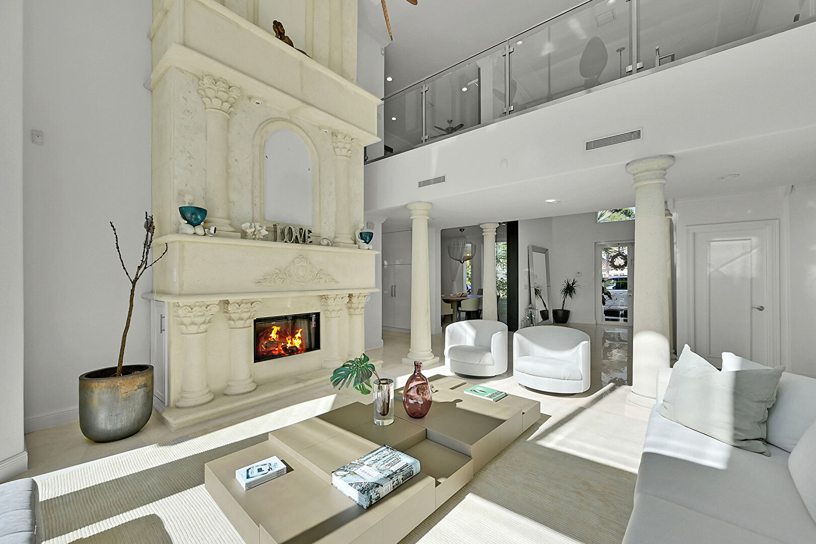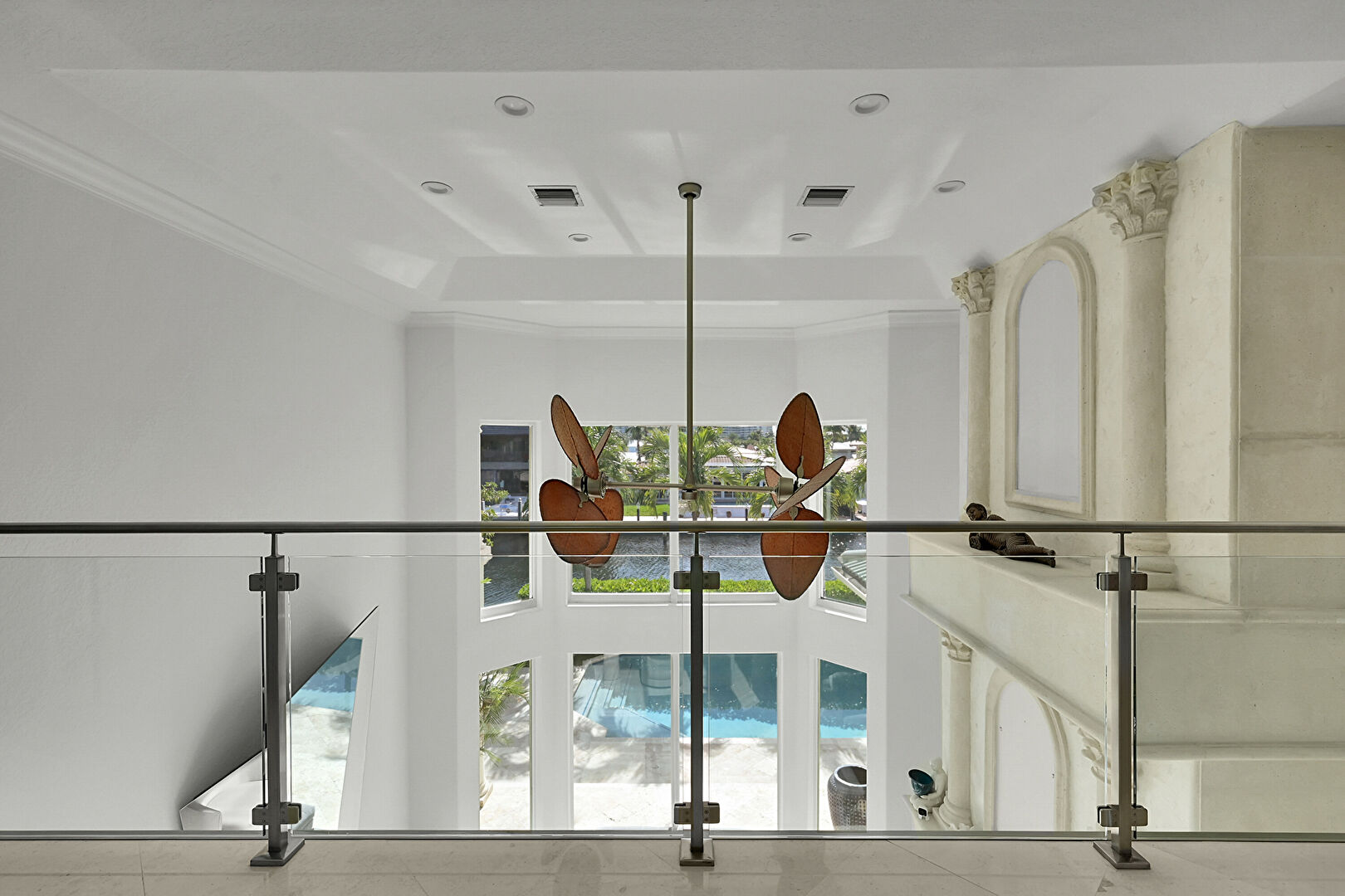 Decorative Columns, Drywall, High Ceiling, Marble Finish Floor, Natural Light, Stairs, Vent