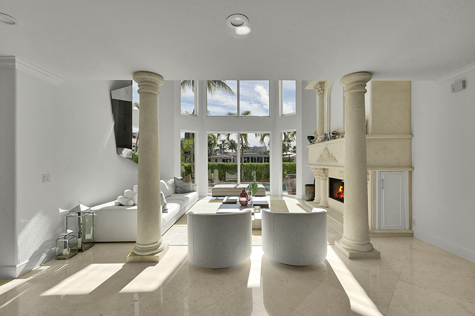 Arched Walkways, Baseboards Wall, Ceiling Fan, Crown Molding, Decorative Columns, Drywall, Fireplace, French Doors, High Ceiling, L Shaped Kitchen, Natural Light, Pool View, Recessed Lighting, Textured Ceiling, Vent, Wood Finish Floor, Baseboards Wall, Ceiling Fan, Crown Molding, Decorative Columns, Drywall, Fireplace, High Ceiling, Natural Light, Tile Floor, Vent