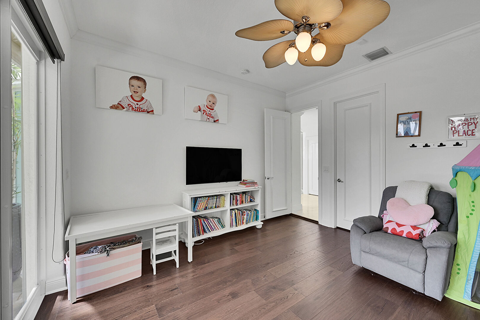 Baseboards Wall, Ceiling Fan, Crown Molding, Drywall, Natural Light, Vent, Wood Finish Floor