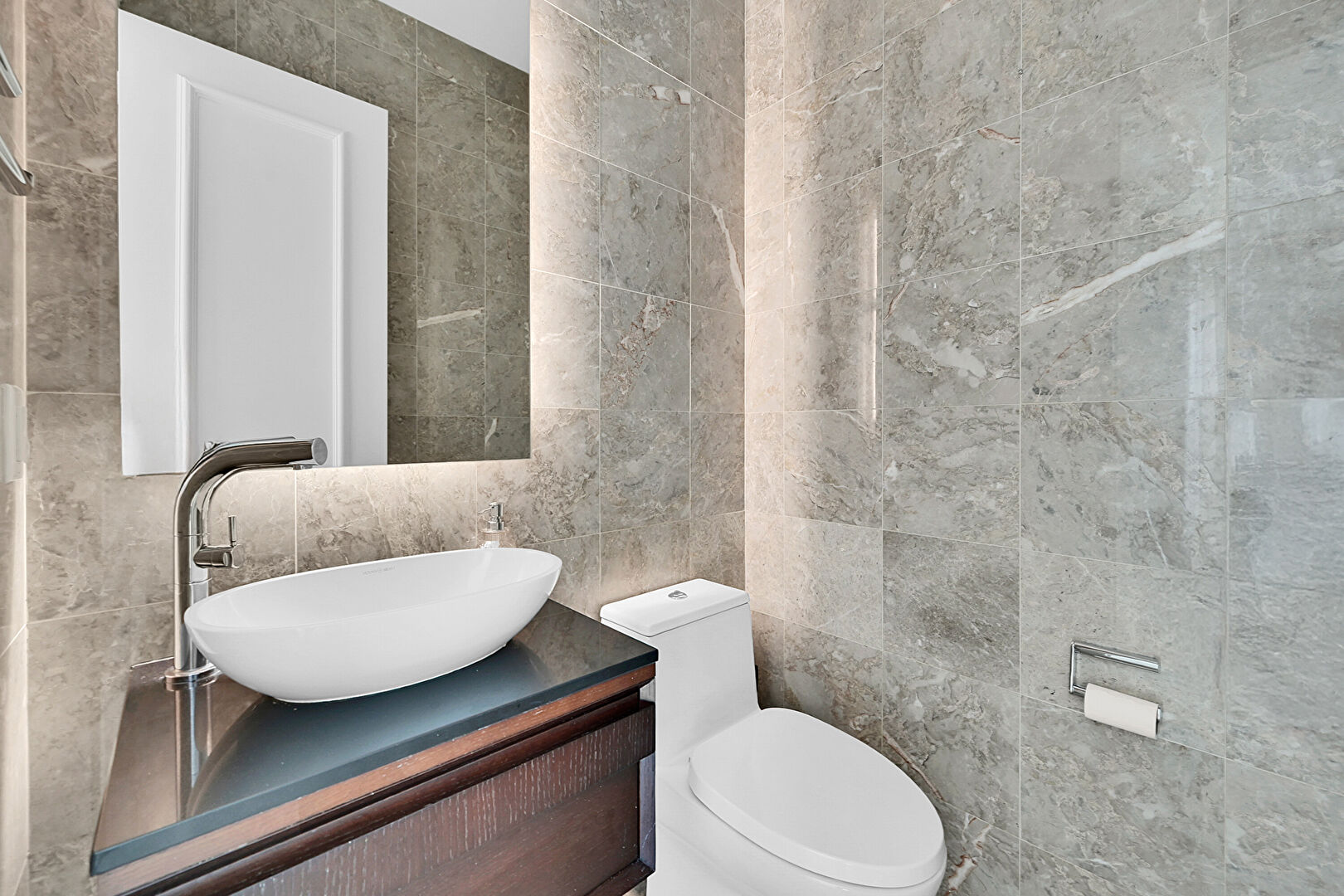 Full Bathroom, Marble Finish Floor, Natural Light, Recessed Lighting, Tile Wall, Vanity, Marble Finish Floor, Natural Light, Recessed Lighting