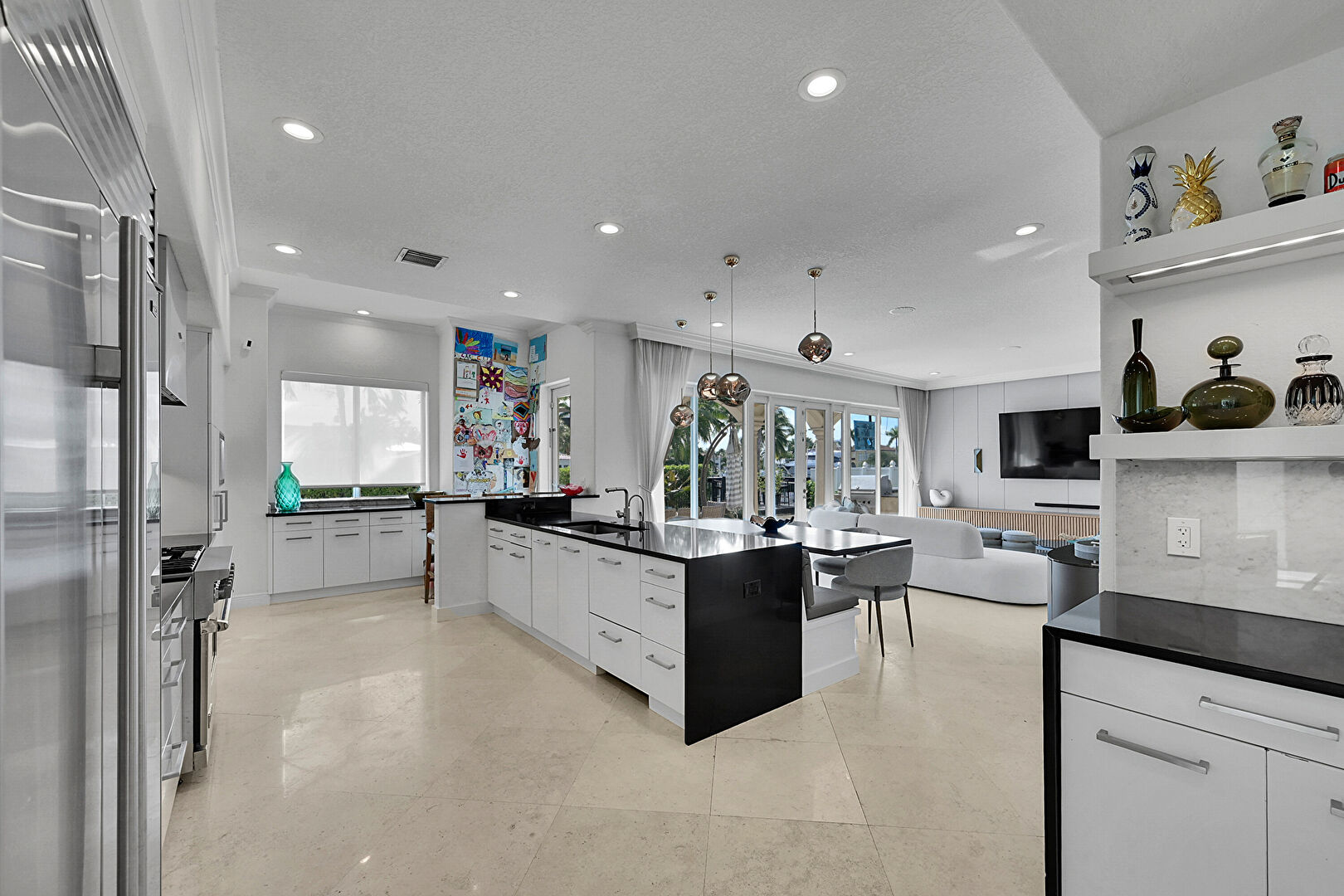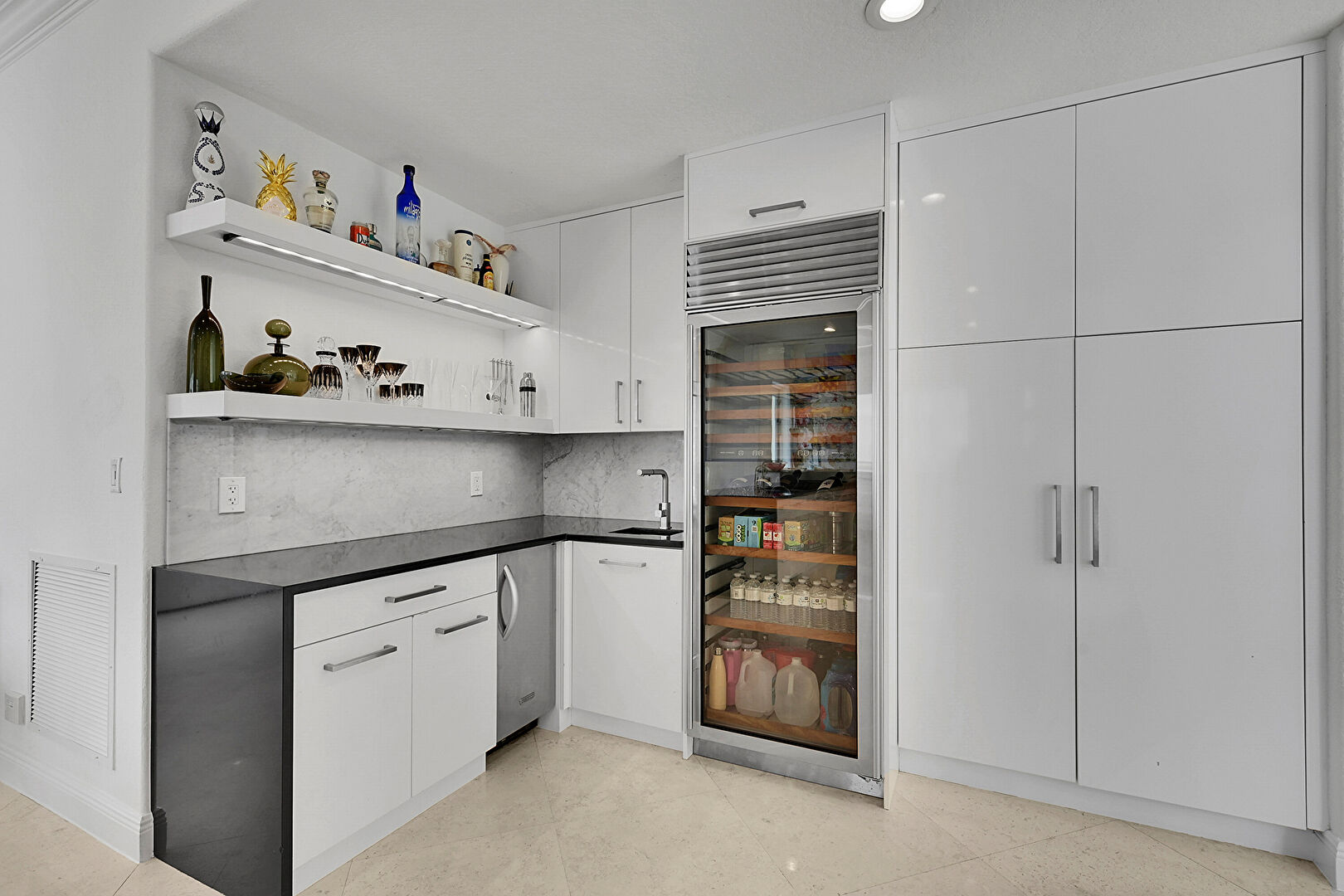 Crown Molding, Drywall, Flat Panel Cabinets, Kitchen Bar, Kitchen Island, Natural Light, Open Shelves, Opens To Living Area, Pendant Lighting, Recessed Lighting, Stone Countertops, Textured Ceiling, Tile Floor, Vent, Wine Cooler, Crown Molding, Pendant Lighting, Recessed Lighting, Stone Countertops