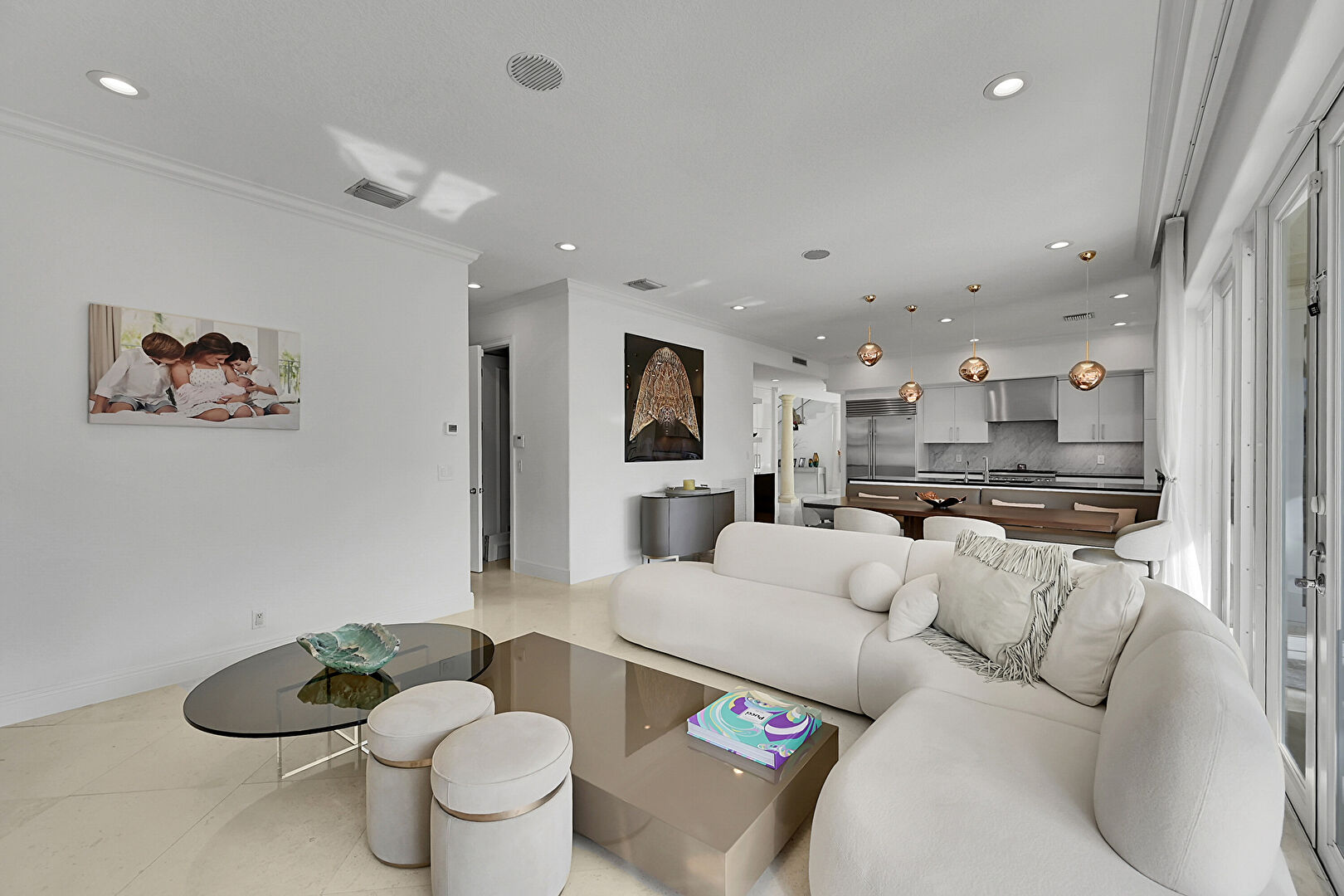 Arched Walkways, Ceiling Fan, Crown Molding, Drywall, Natural Light, Recessed Lighting, Tile Floor, Vent, Wine Cooler, Crown Molding, Natural Light