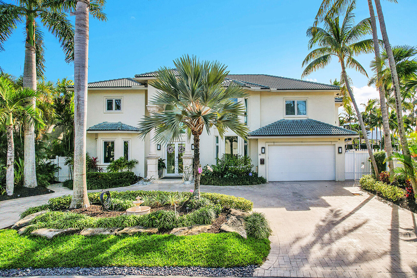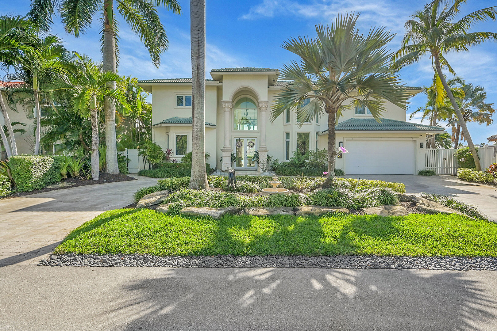 Driveway, Fence, Fountain, French Doors, Garage, Gate, Residential View, Stucco Siding, Tile Roof, Driveway, Stucco Siding, Tile Roof
