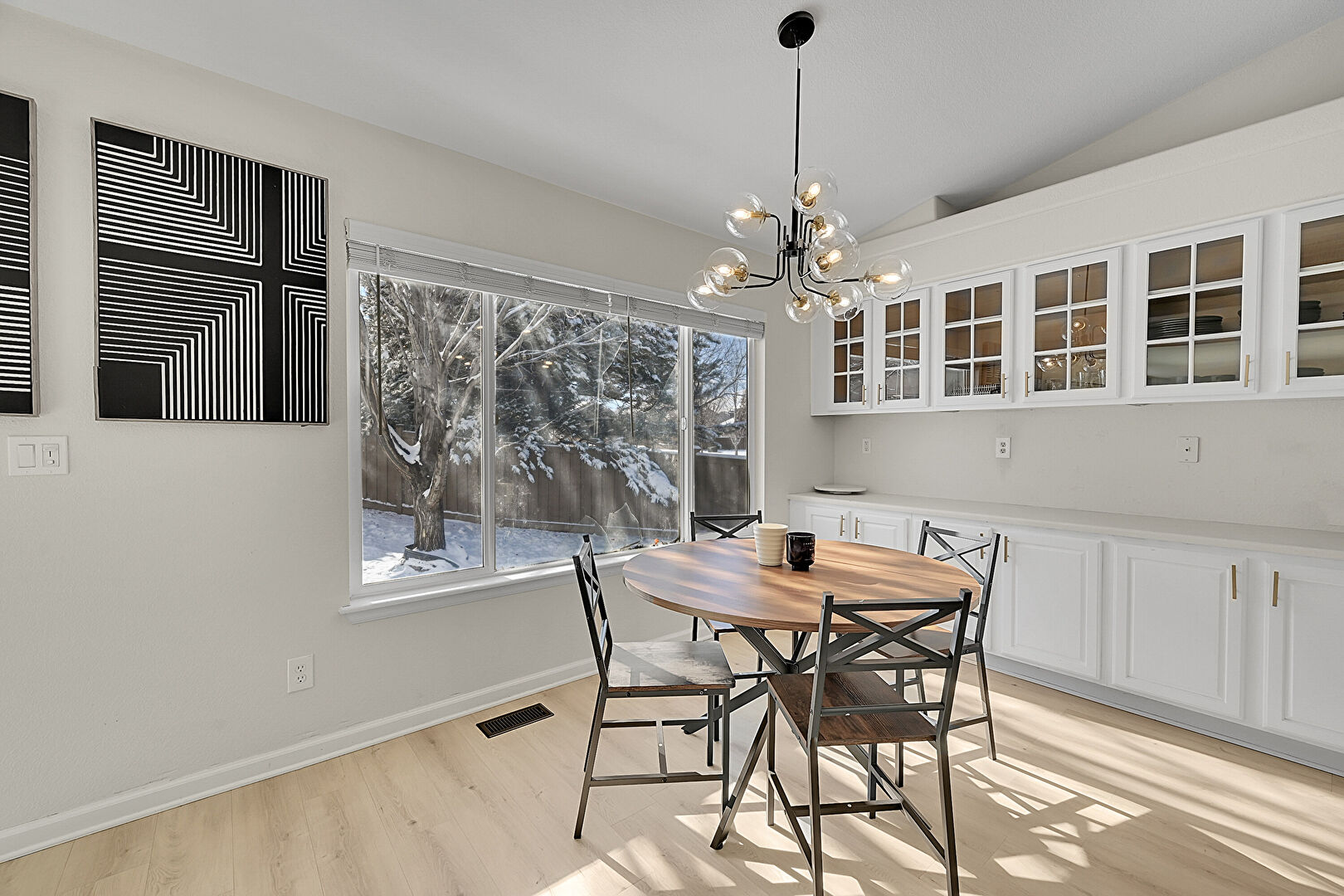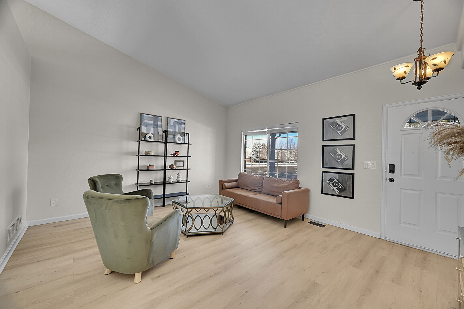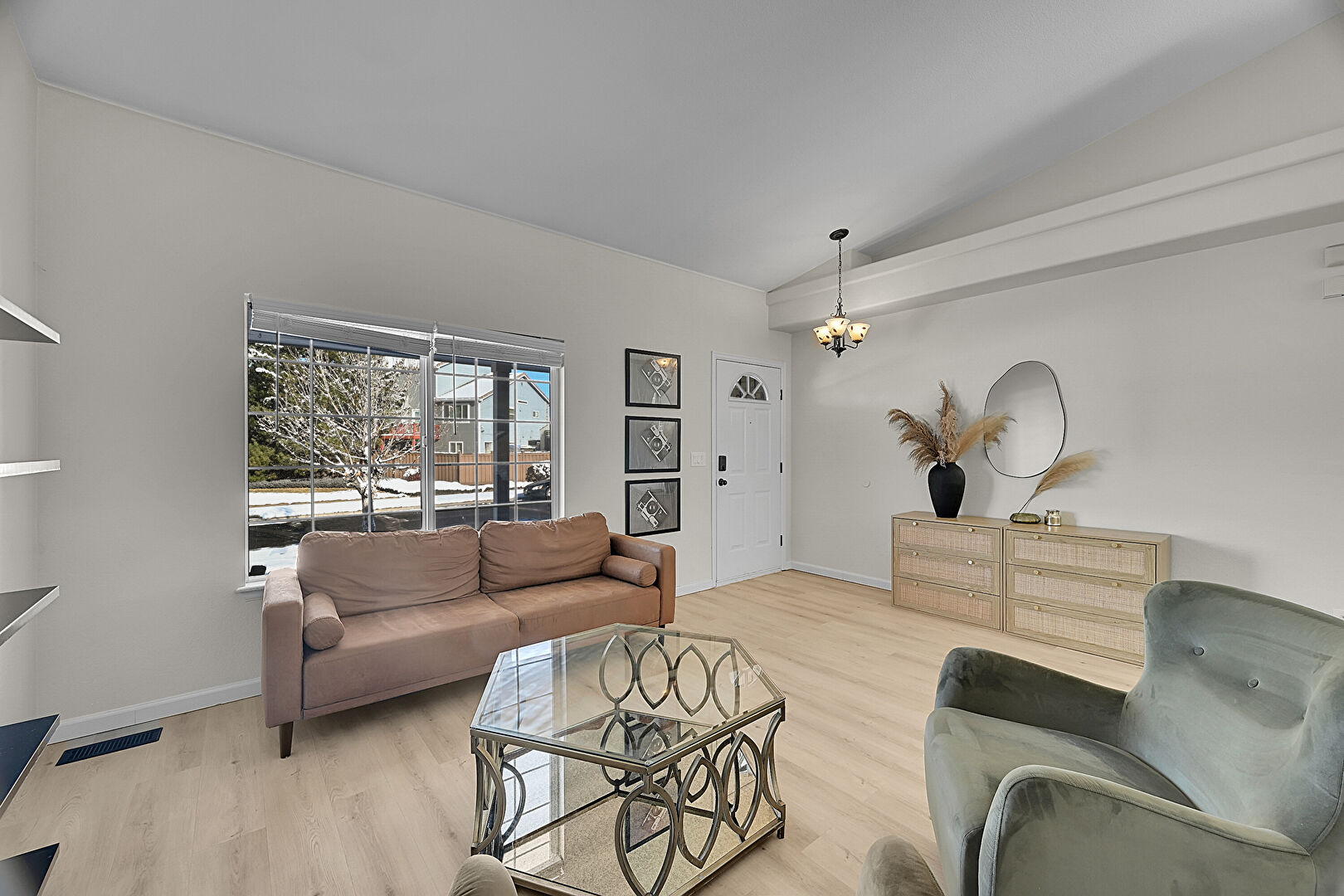 Baseboards Wall, Drywall, Natural Light, Notable Chandelier, Vaulted Ceiling, Vent, Wood Finish Floor