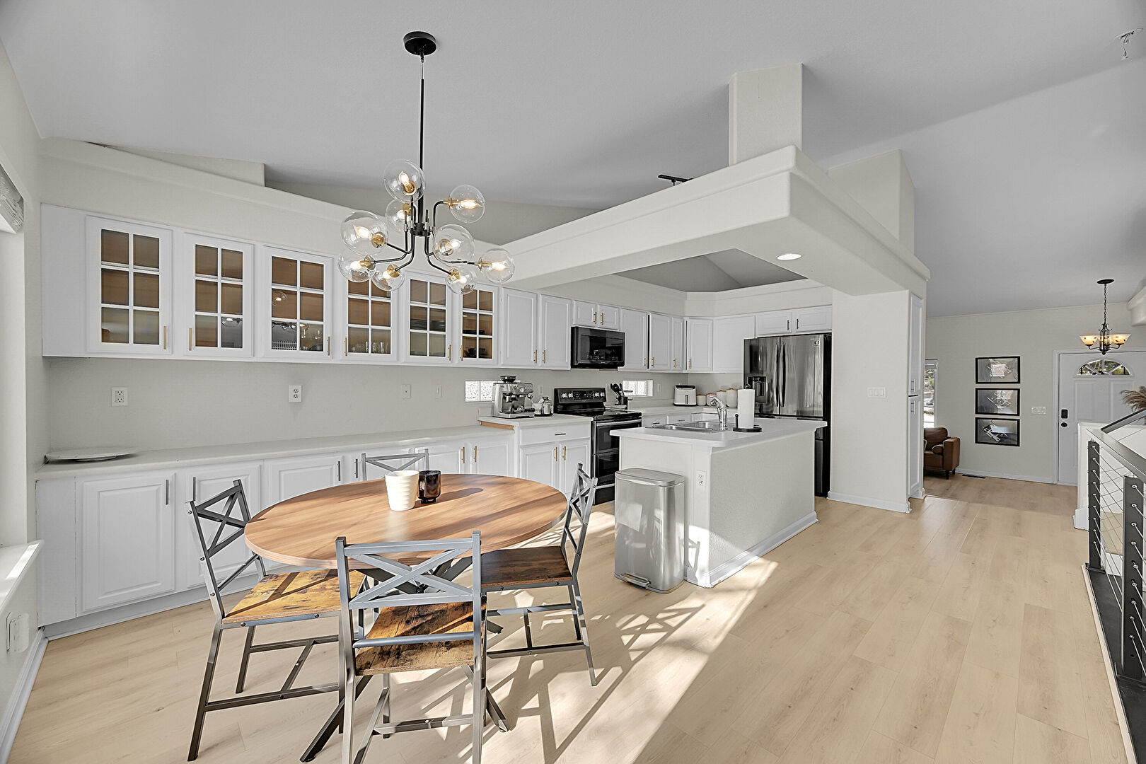 Baseboards Wall, Drywall, Glass Insert Cabinets, Kitchen Island, L Shaped Kitchen, Natural Light, Notable Chandelier, Pendant Lighting, Raised Cabinets, Recessed Lighting, Shaker Cabinets, Stone Countertops, Toaster, Vaulted Ceiling, Wine Cooler, Wood Finish Floor, Notable Chandelier, Raised Cabinets, Vent