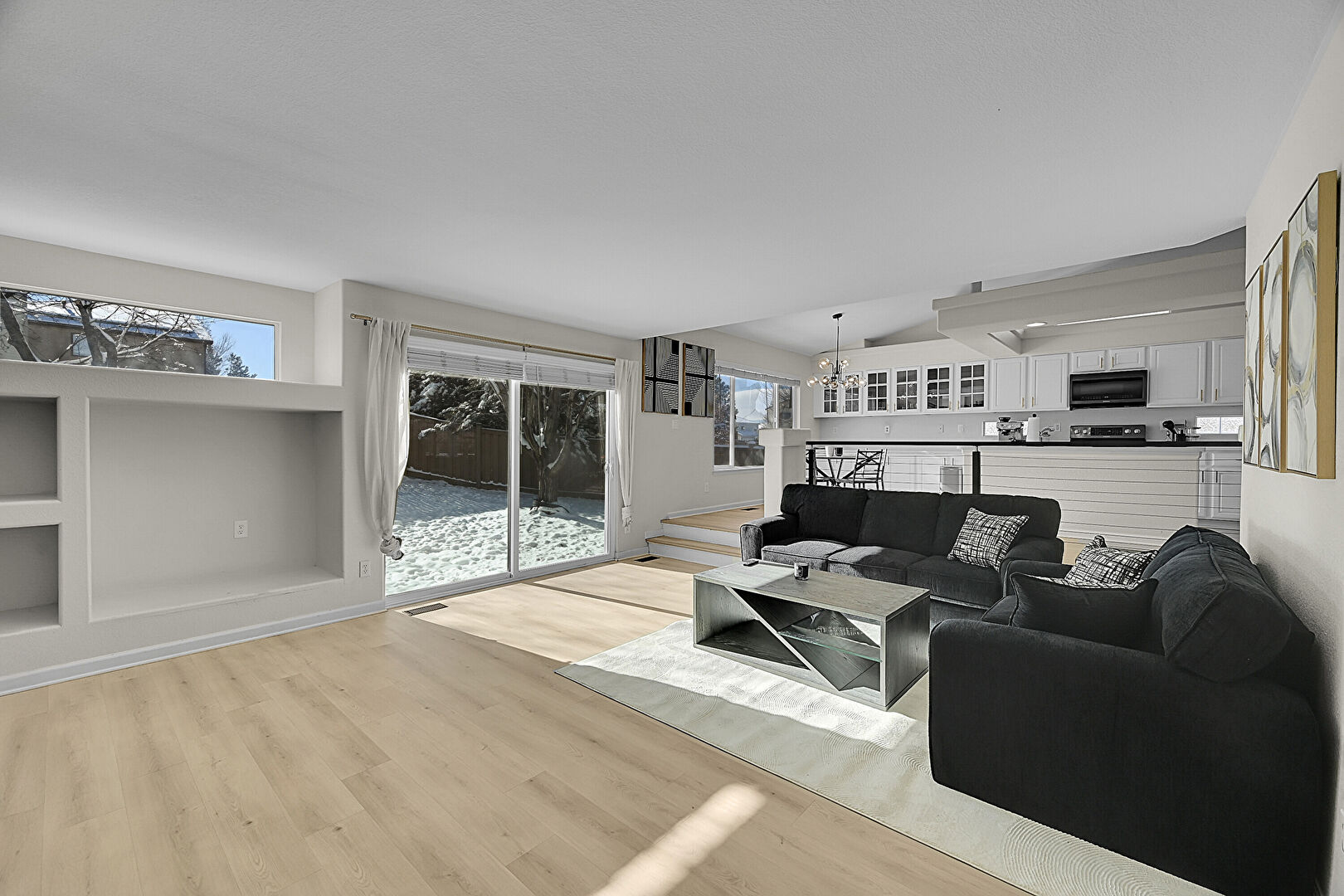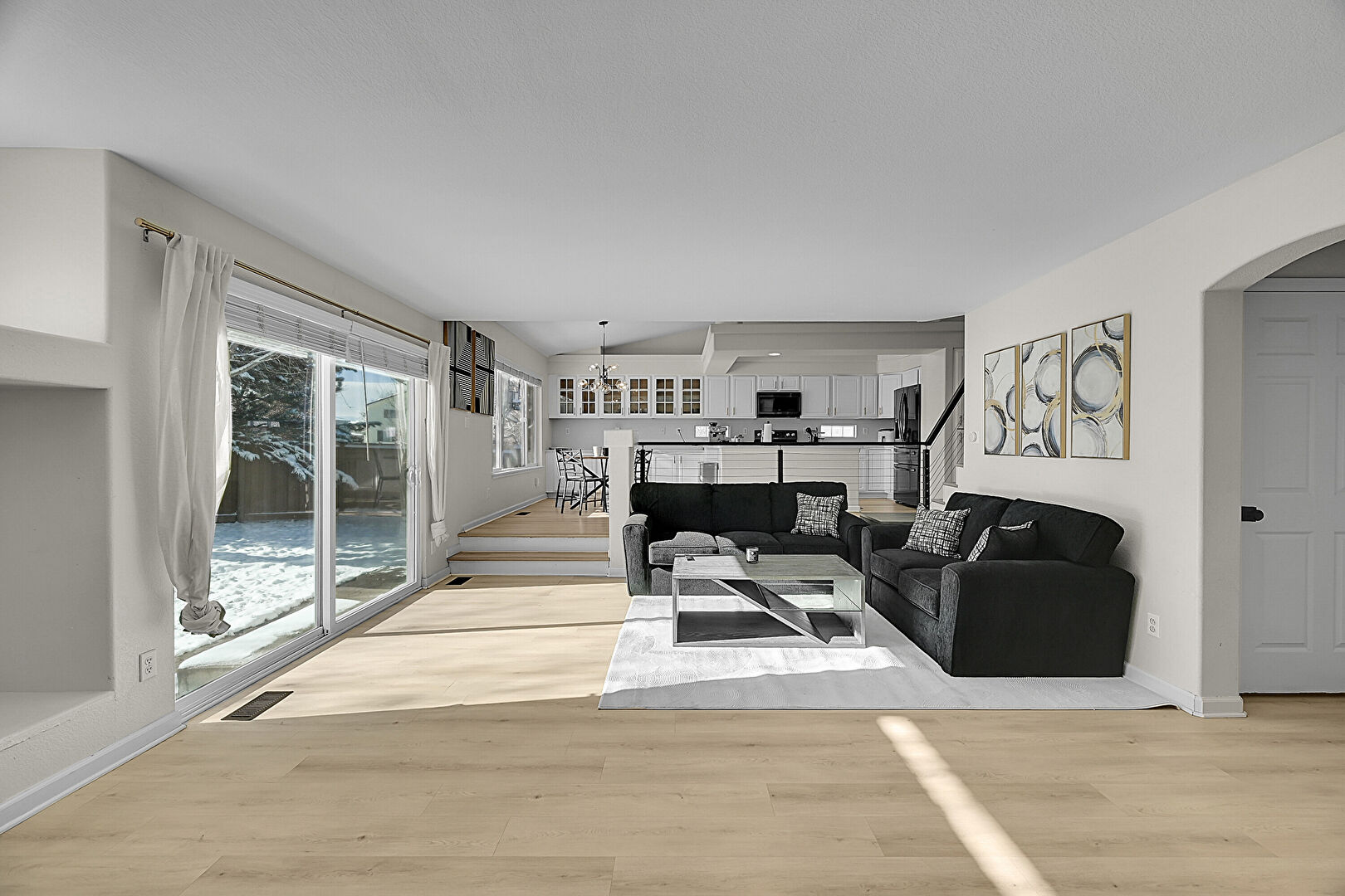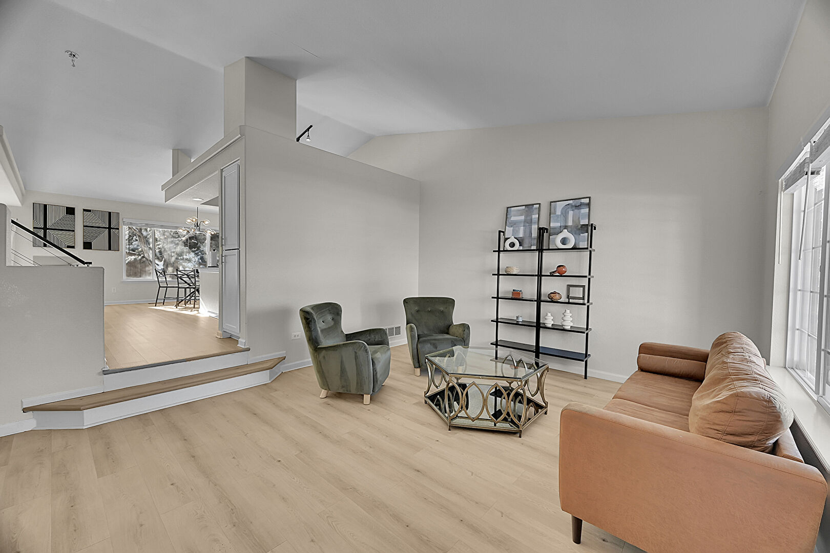 Baseboards Wall, Drywall, Natural Light, Notable Chandelier, Vaulted Ceiling, Vent, Wood Finish Floor, Baseboards Wall, Notable Chandelier, Vent