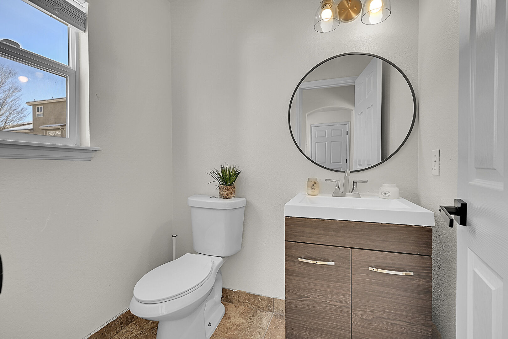 Drywall, Half Bathroom, Natural Light, Stone Finish Floor, Vanity, Baseboards Wall
