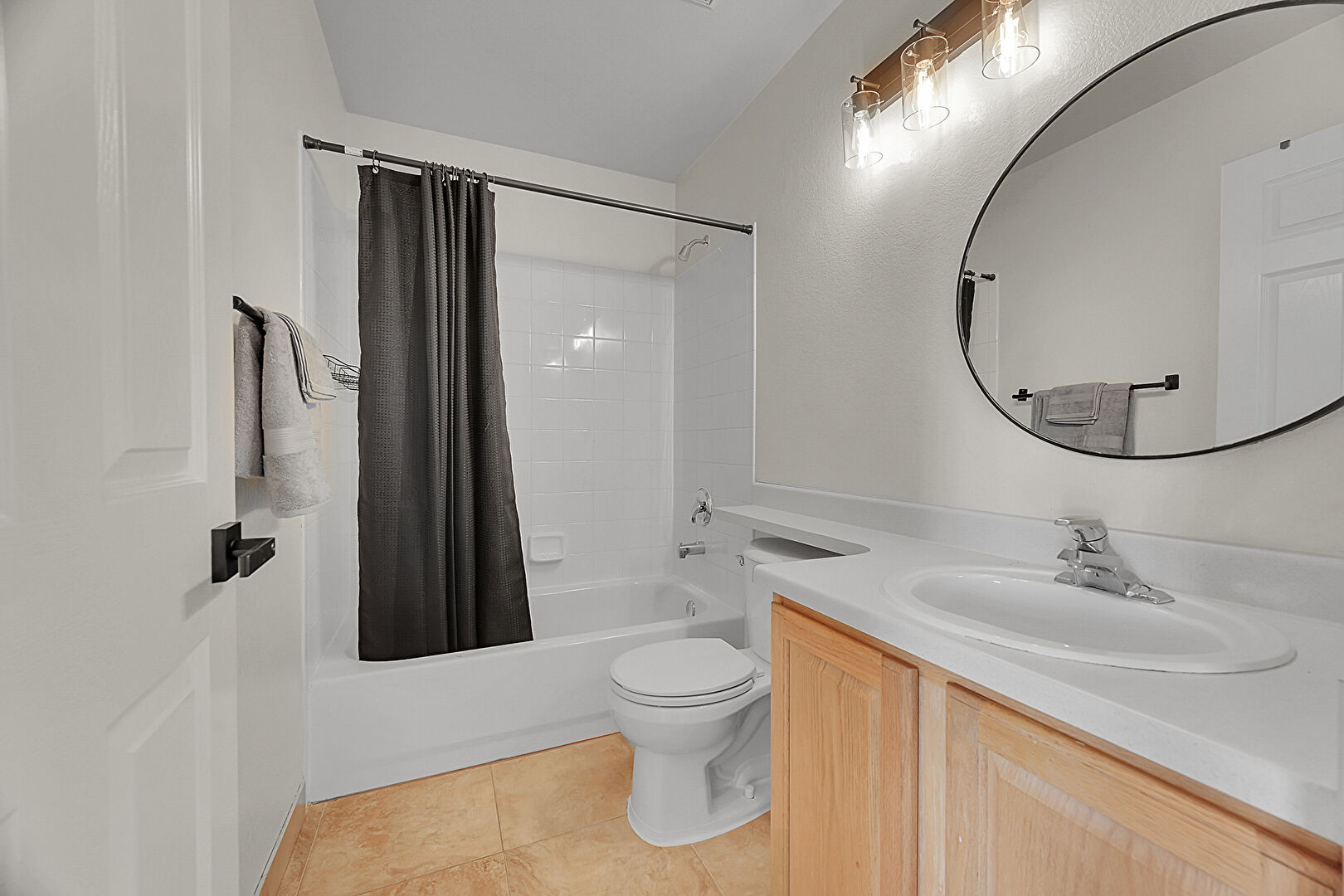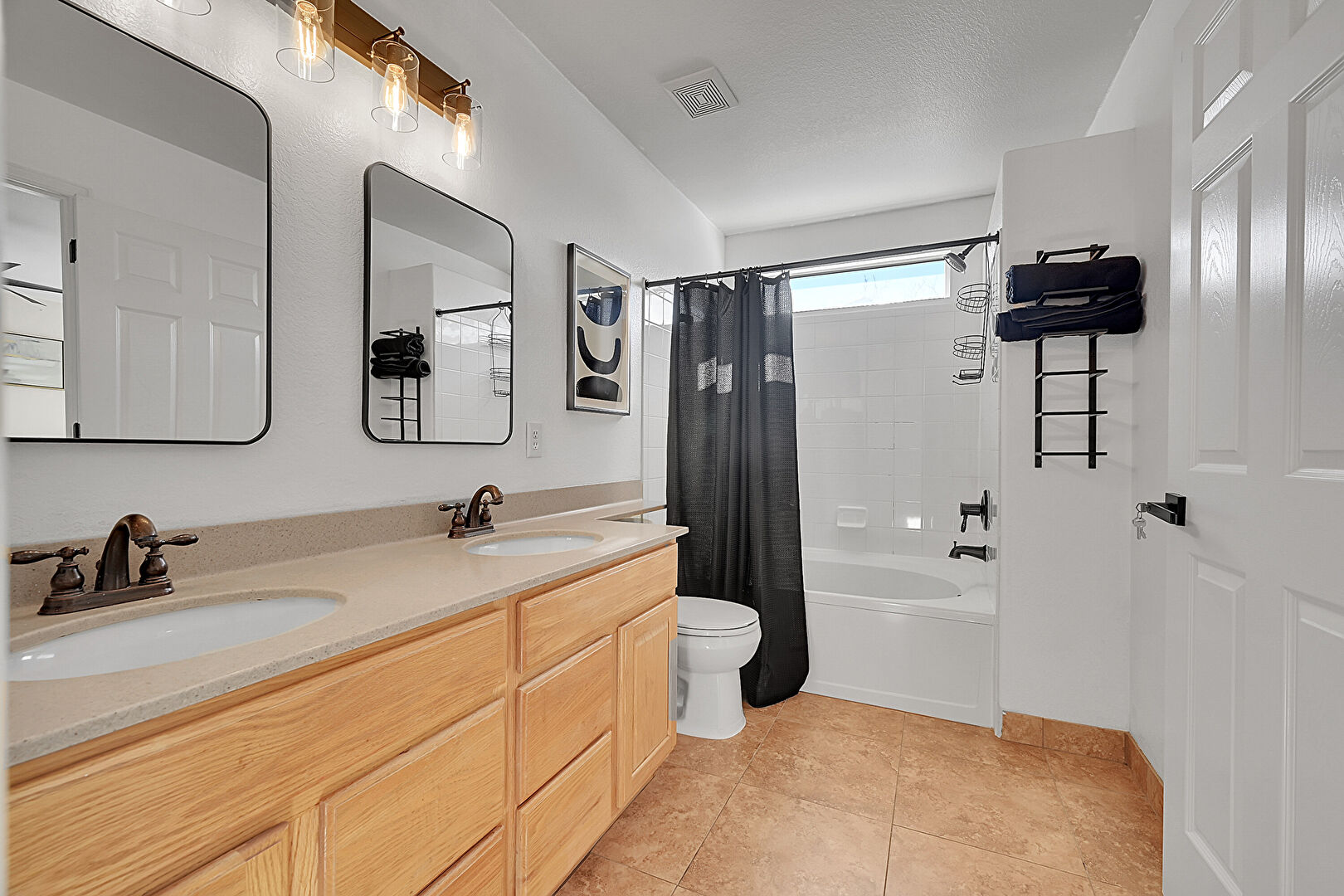 Baseboards Wall, Ceiling Fan, Combined Bath Shower, Double Vanity, Drywall, Full Bathroom, Natural Light, Textured Ceiling, Tile Floor, Vent, Natural Light, Tile Floor